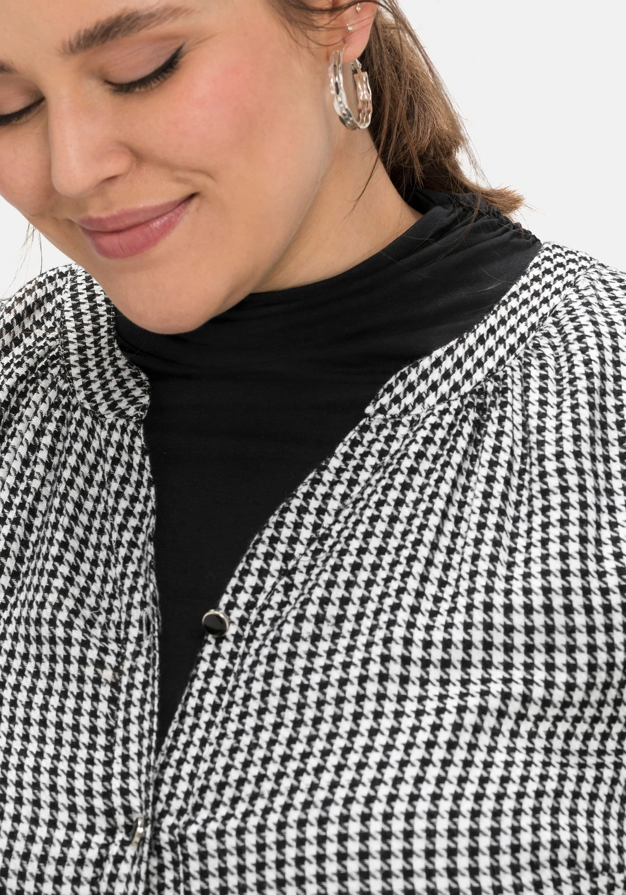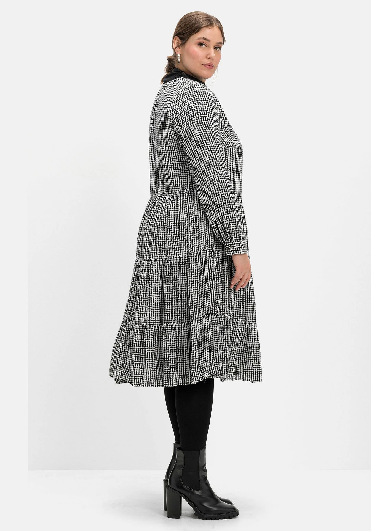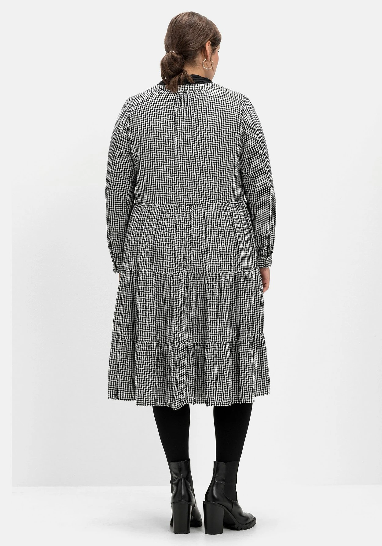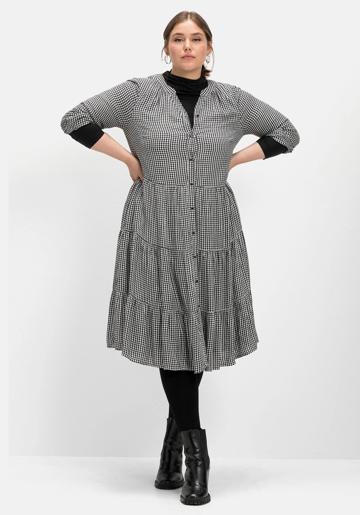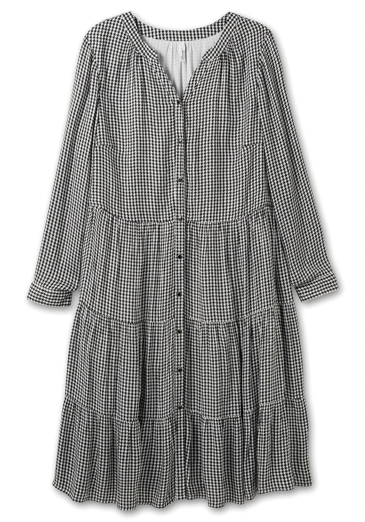 Blusenkleid im Pepitamuster. Angekräuselte Teilungsnähte lassen feminine Volants entstehen, die dem Kleid Schwung und Leichtigkeit verleihen. An den Rundhalsausschnitt schließt sich eine durchgehende Knopfleiste an, die langen Ärmel enden mit Manschetten und Knopf.