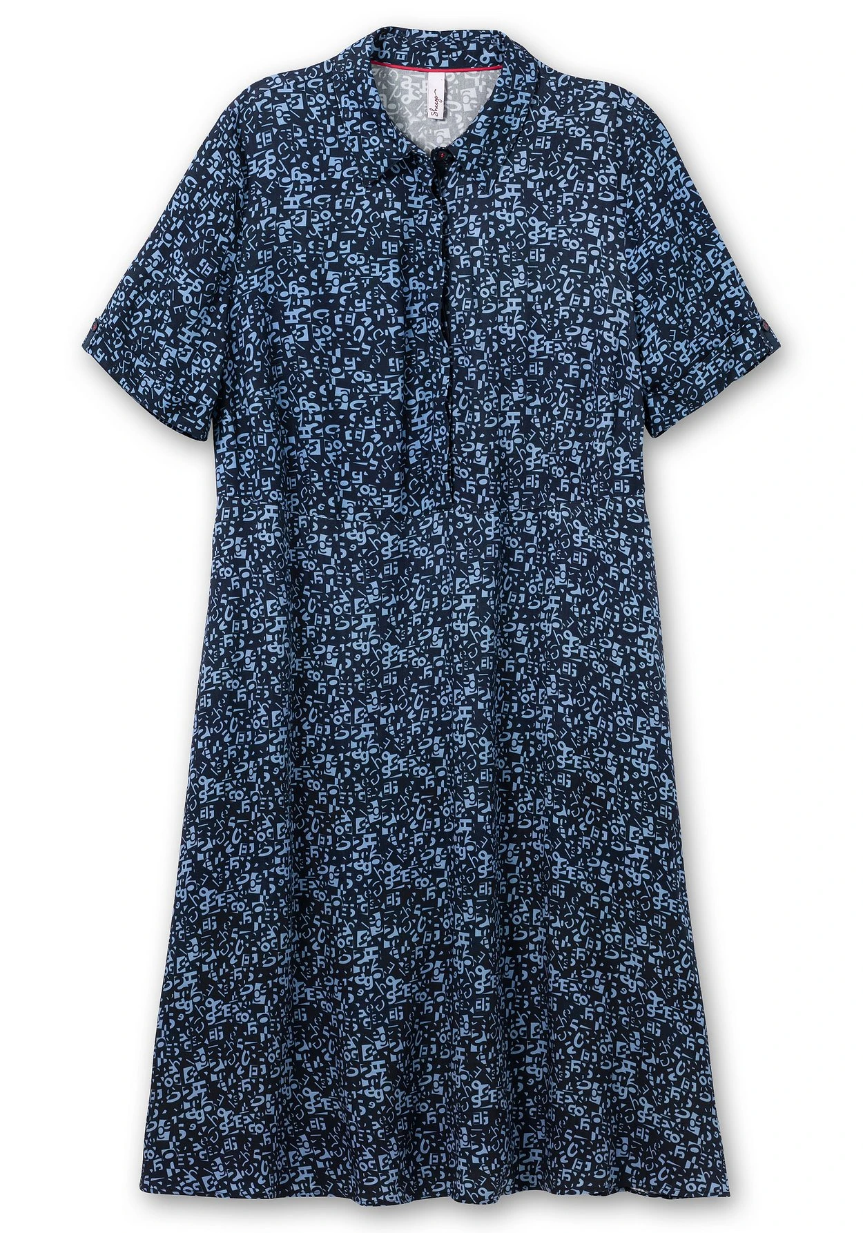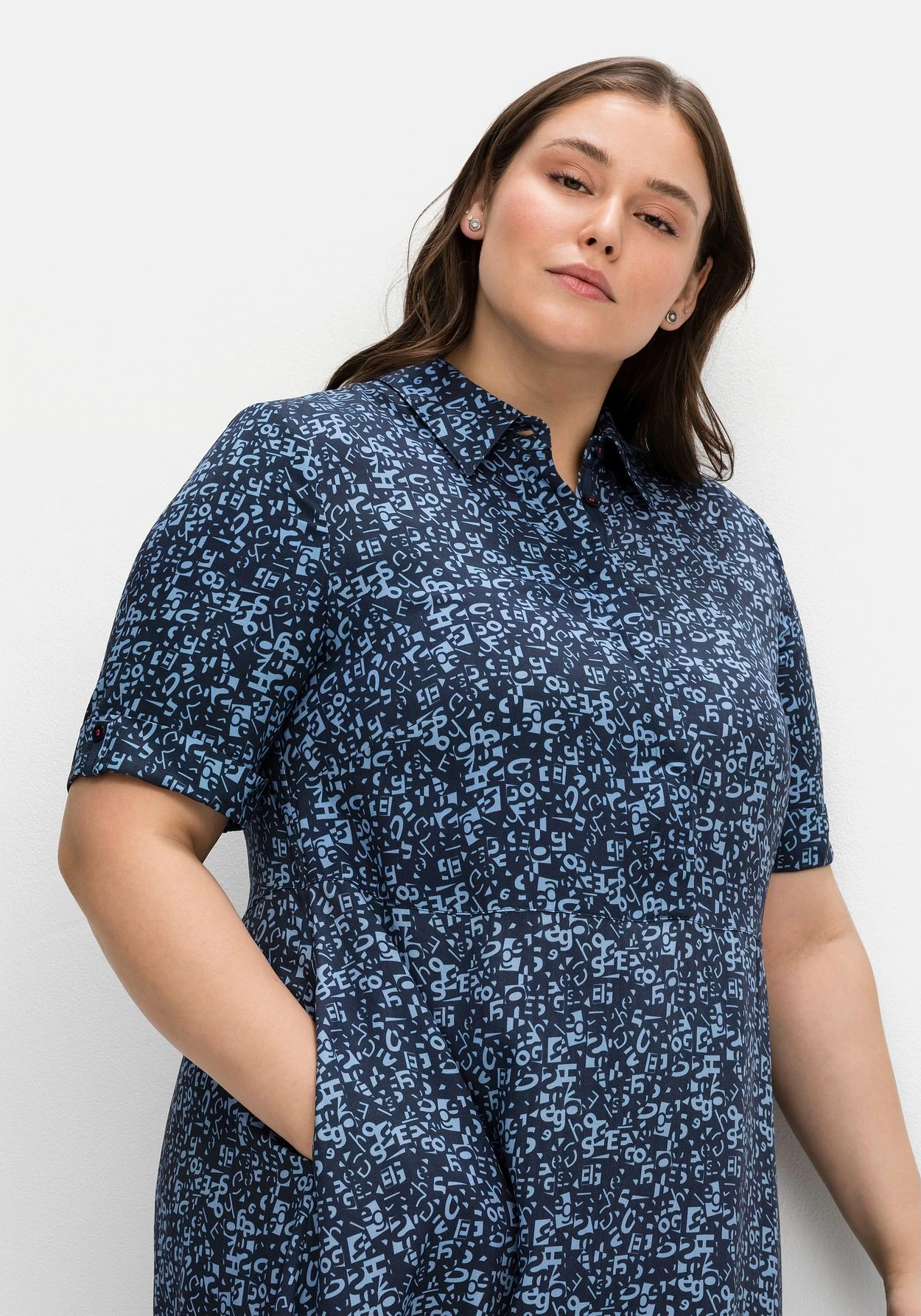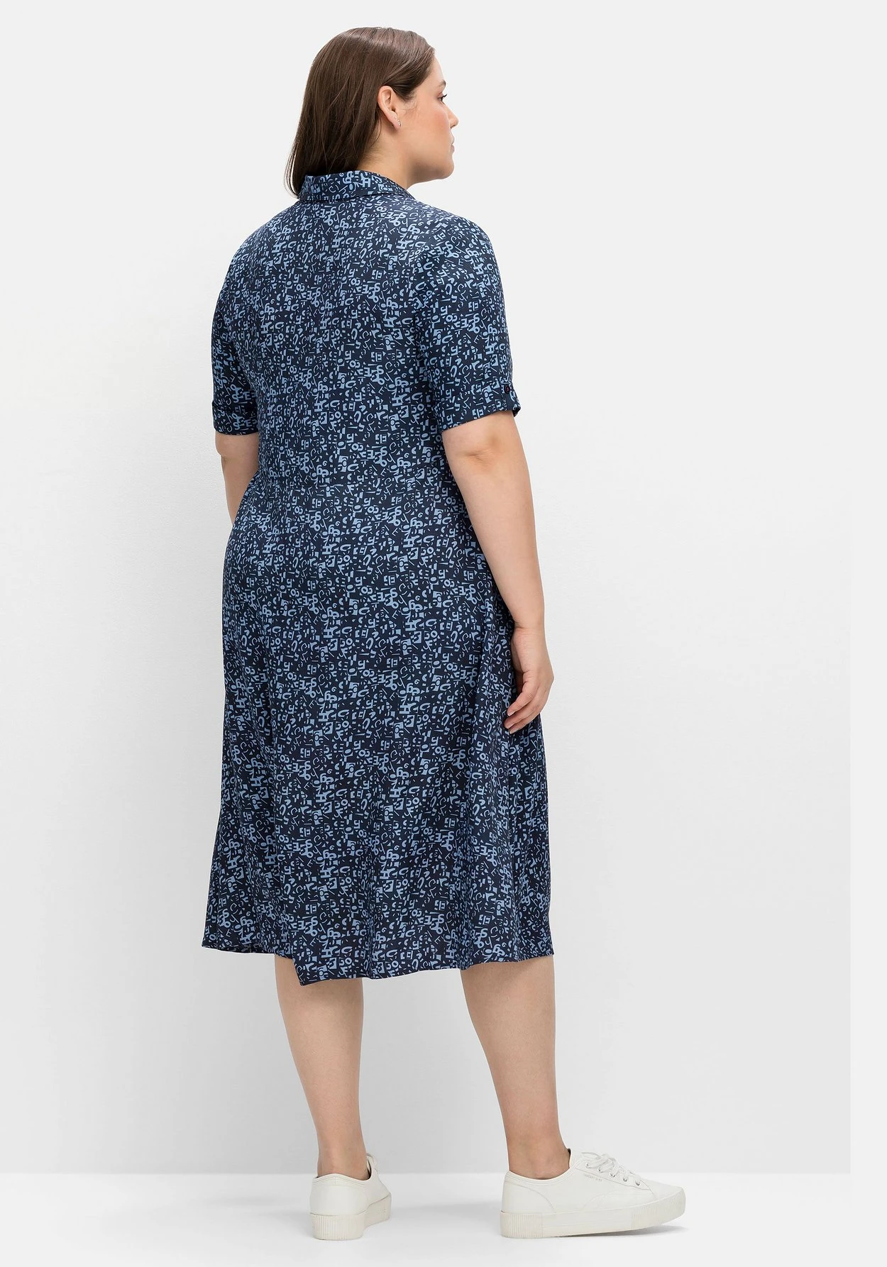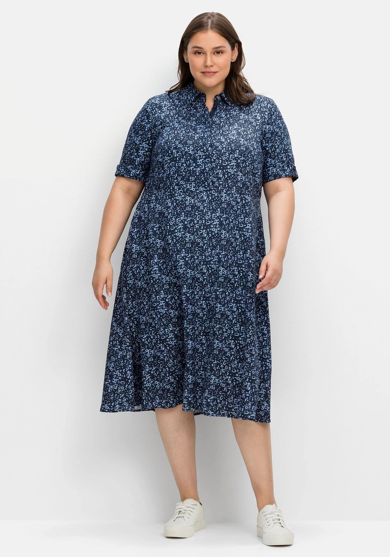 Maxikleid mit Alloverprint. Das Kleid ist mit einem Hemdblusenkragen gearbeitet, die 3/4-langen Ärmel enden mit fixiertem Umschlag. Eine Teilungsnaht unterbricht die Silhouette und betont dezent die Taille. Darunter schließt sich ein weit schwingender Rock an. Praktisches Finish sind die Taschen in der Seitennaht.