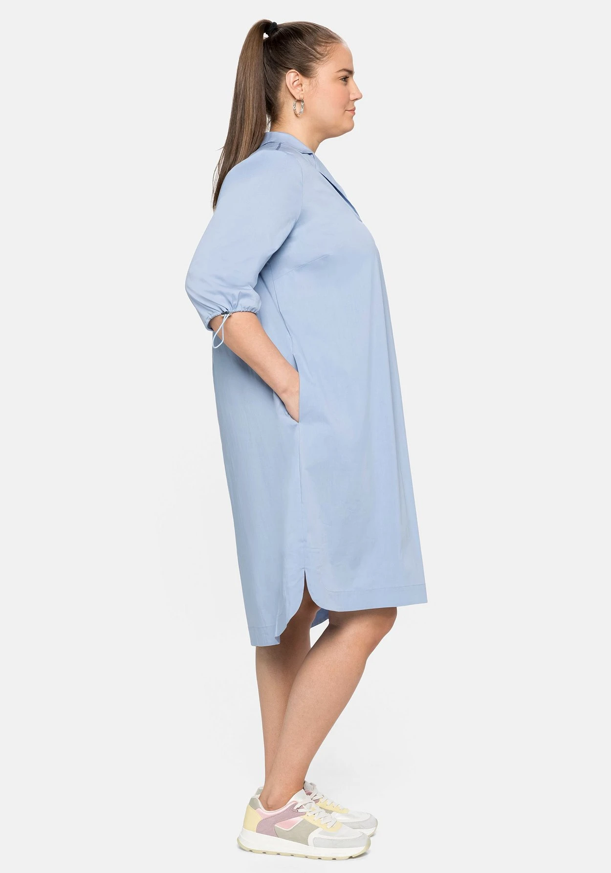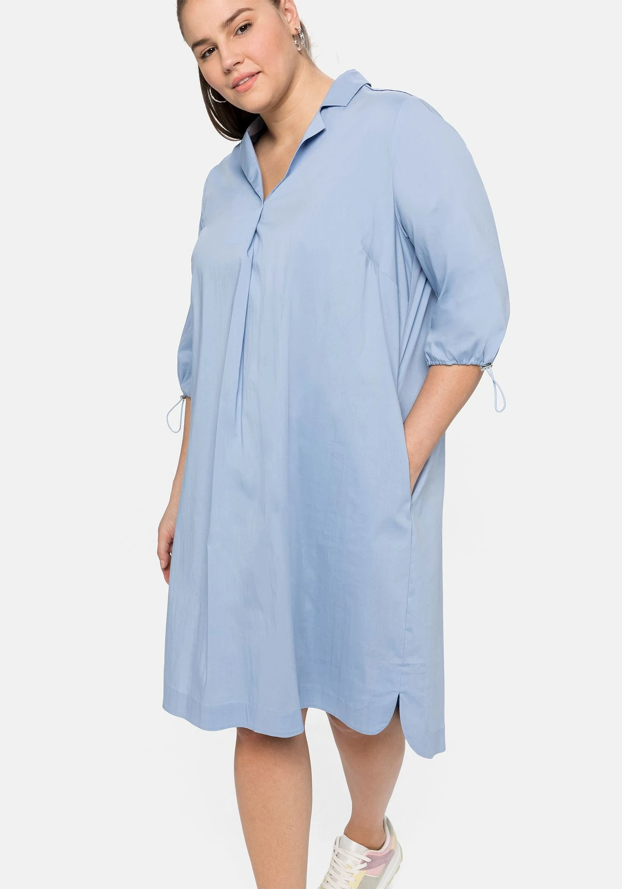 Hemdblusenkleid in kniebedeckender Länge. Das Kleid zeigt sich mit klassischem Reverskragen, eine dekorative Falte unter dem Ausschnitt lässt es nach unten weit fallen. Modisches Detail ist der Gummizugbund am 3/4-Arm, der sich mit einer regulierbaren Kordel in der Weite verstellen lässt. Für angenehmen Tragekomfort sorgen die Rückenpasse mit Quetschfalte sowie die verlängerte Rückenpartie mit gerundeten Seitenschlitzen. Ergänzt wird der Look durch dezente Eingrifftaschen in der Seitennaht.