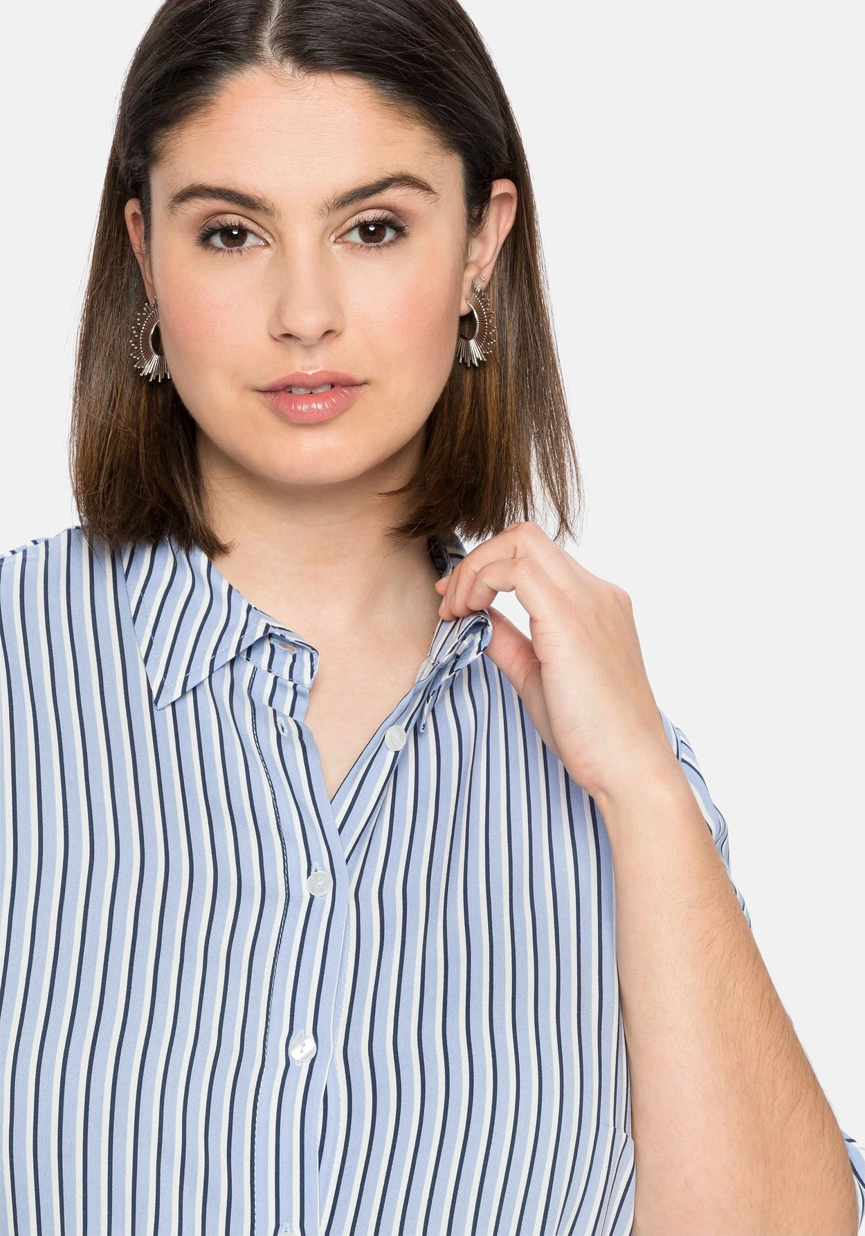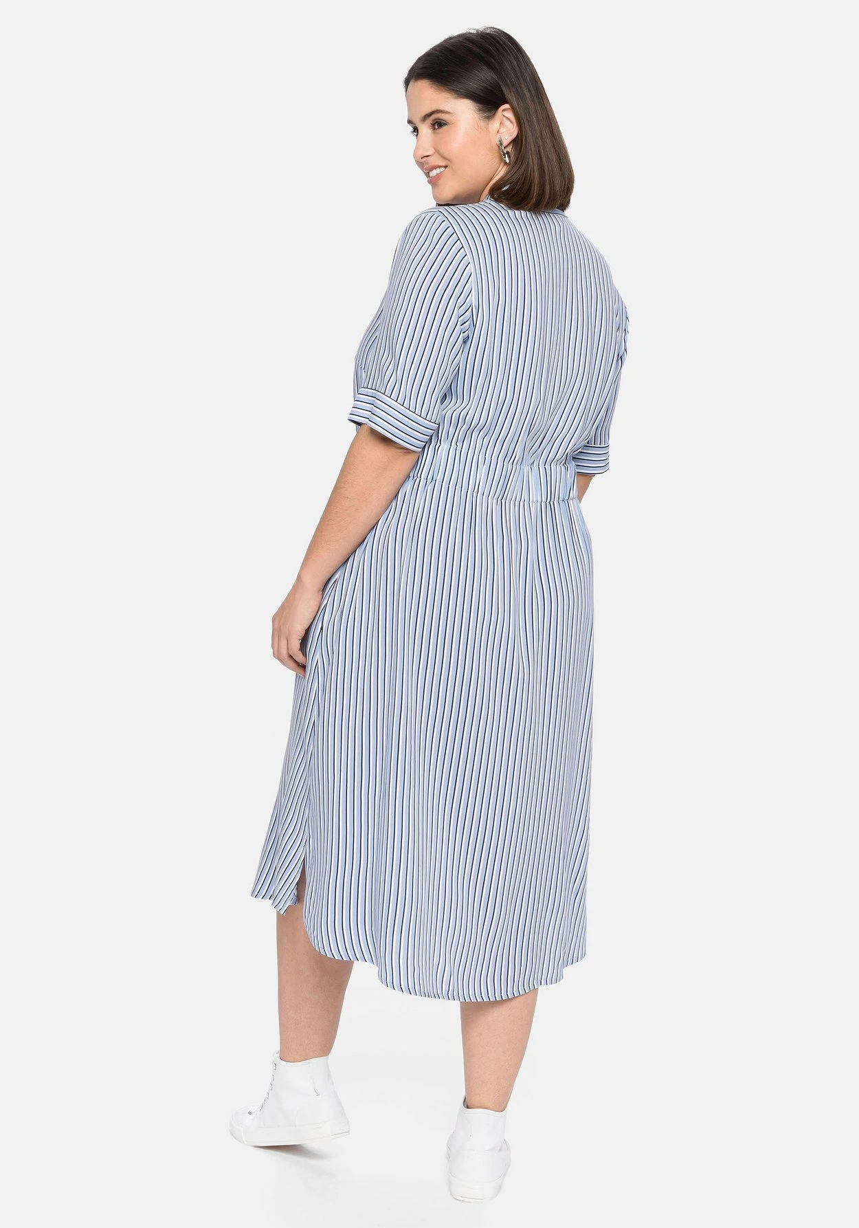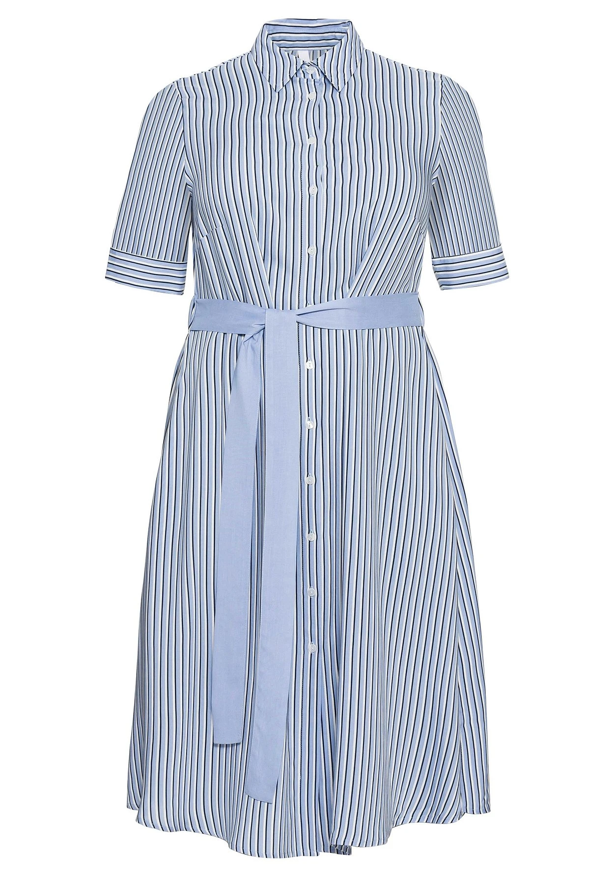 Hemdblusenkleid mit durchgehender Knopfleiste. Besonders frisch wirkt der feine Streifenlook, der durch seine Zweifarbigkeit mehr Dynamik erhält. Für eine gepflegte Optik sorgen der klassische Hemdkragen, der verlängerte Kurzarm mit Manschette sowie der unifarbene Gürtel, der gleichzeitig feminin die Taille betont. Ein zusätzlicher Gummizugbund in der Taille unterstreicht die Silhouette.