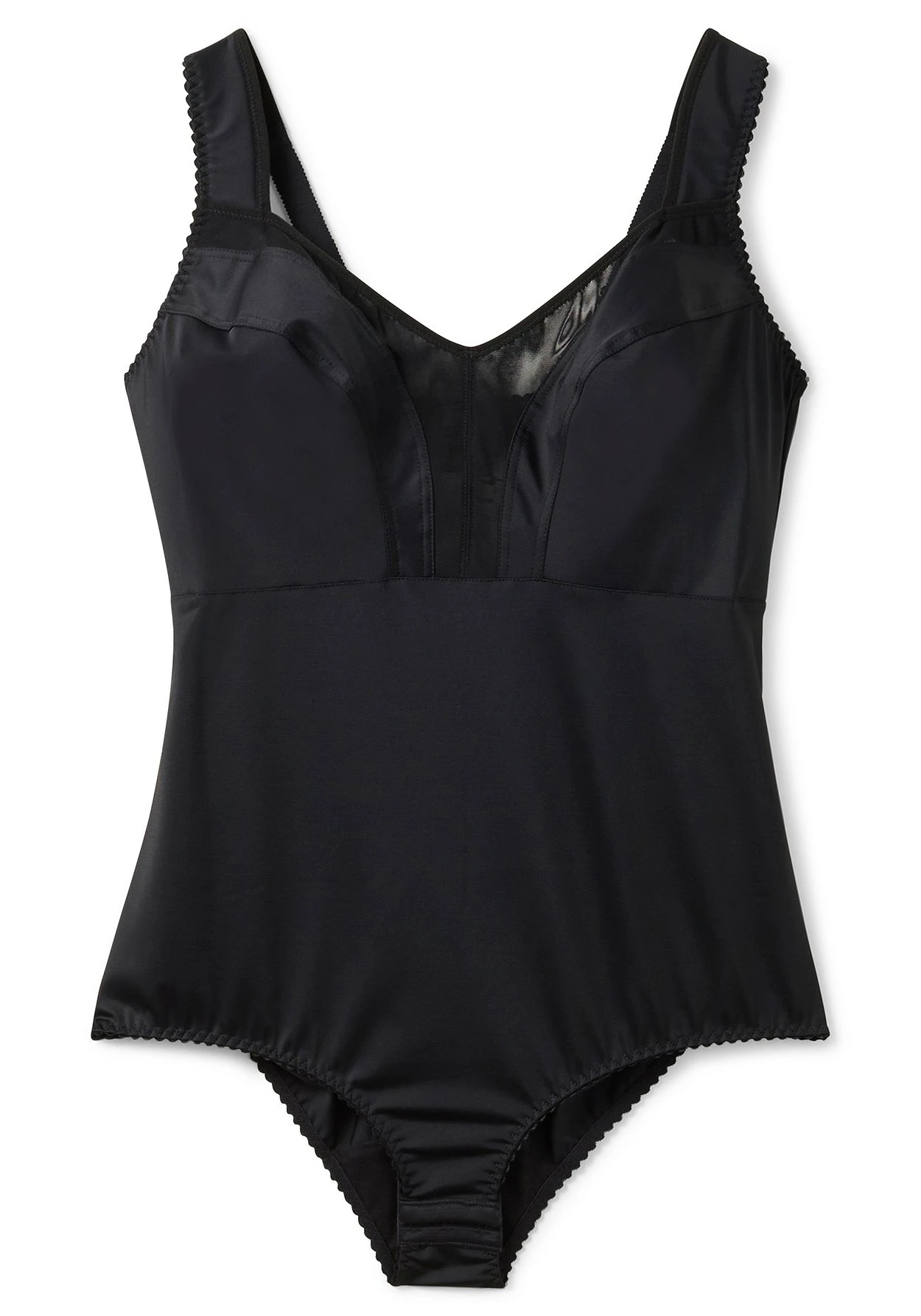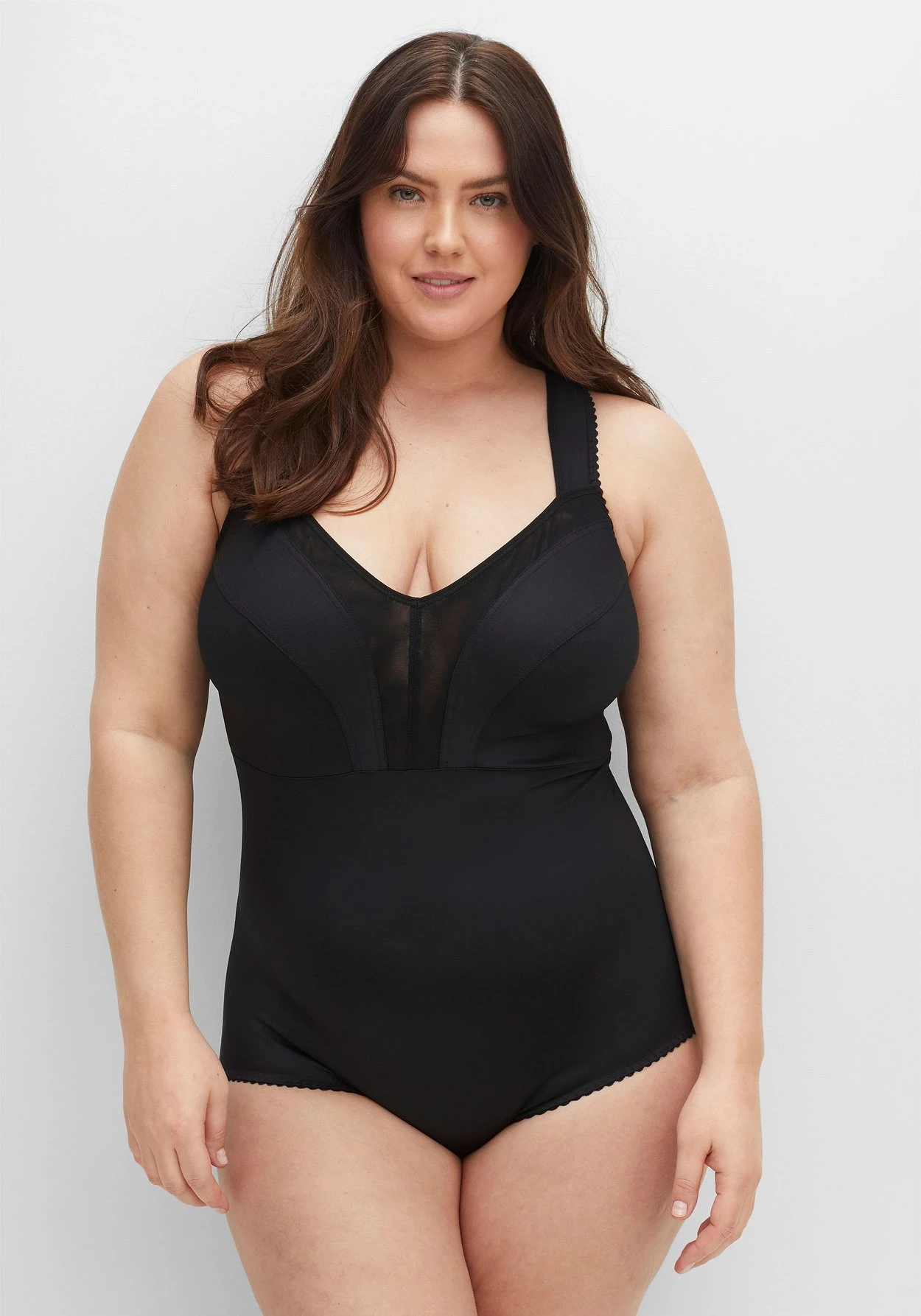 Body ohne Bügel. Ein Einsatz aus Mesh zwischen den Cups und die zarten Muschelkanten geben dem Look eine besondere Note. Die breiten Träger sitzen komfortabel und lassen sich individuell verstellen. Im Schritt befindet sich ein Baumwollzwickel, der mit kleinen Haken und Ösen geöffnet werden kann.