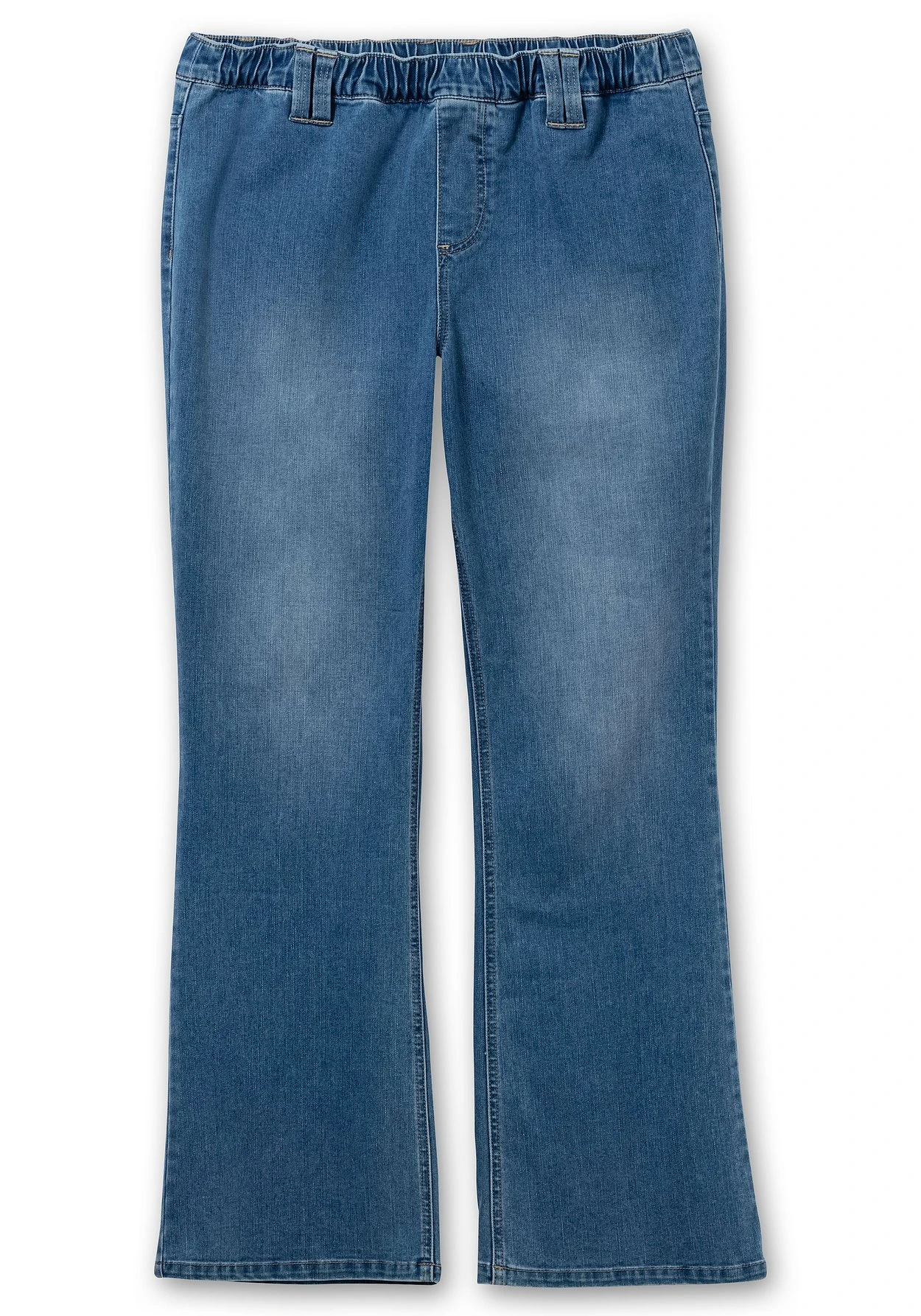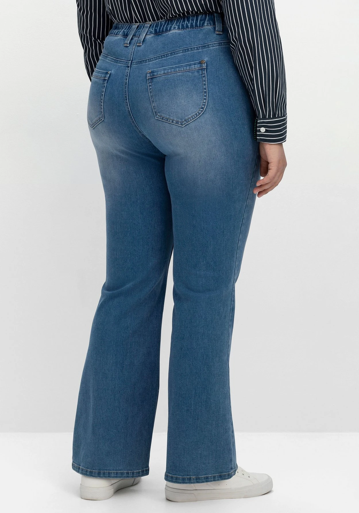 Bootcut-Jeans mit elastischem Bund. Der bequeme Bund erhält durch die kontrastfarbenen Nähte und die Gürtelschlaufen eine gepflegte, angezogene Optik. Hinten besitzt die Hose aufgesetzte Taschen, die individuelle Waschung macht den Look komplett.