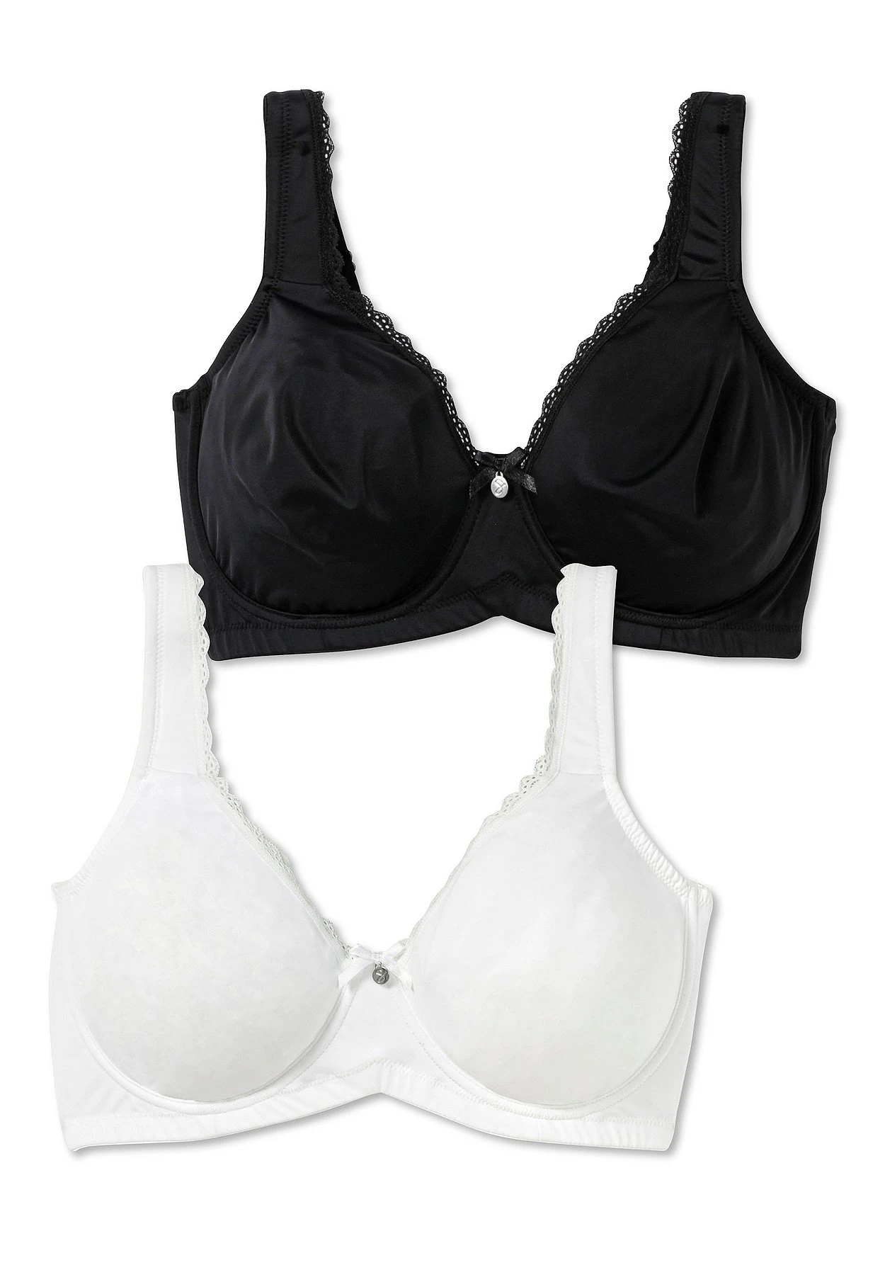 Bügel-BH im Doppelpack. Die nahtlos vorgeformten Cups schmiegen sich der Brust perfekt an und modellieren eine wunderschöne Brustform. Die feine Spitzenborte am Ausschnitt macht den schlichten Style feminin. Dazu überzeugt der BH mit hohem Tragekomfort: Die Cups decken die Brust komplett ab, der hohe Mittelsteg sowie die seitlichen Stützen geben sehr guten Halt. Auch die breiten, leicht gefütterten Träger schneiden nicht ein.
