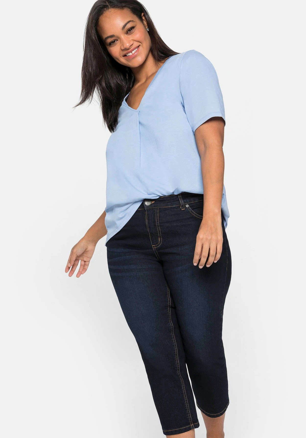 Die Denimqualität im Baumwollmix trägt sich durch den Stretchanteil besonders bequem. Mit dem Kauf dieses Produkts unterstützt du außerdem die Arbeit von „Cotton made in Africa“. Die Initiative leistet Hilfe zur Selbsthilfe durch Handel und will so die Lebensbedingungen afrikanischer Kleinbauern verbessern. sheego cares!