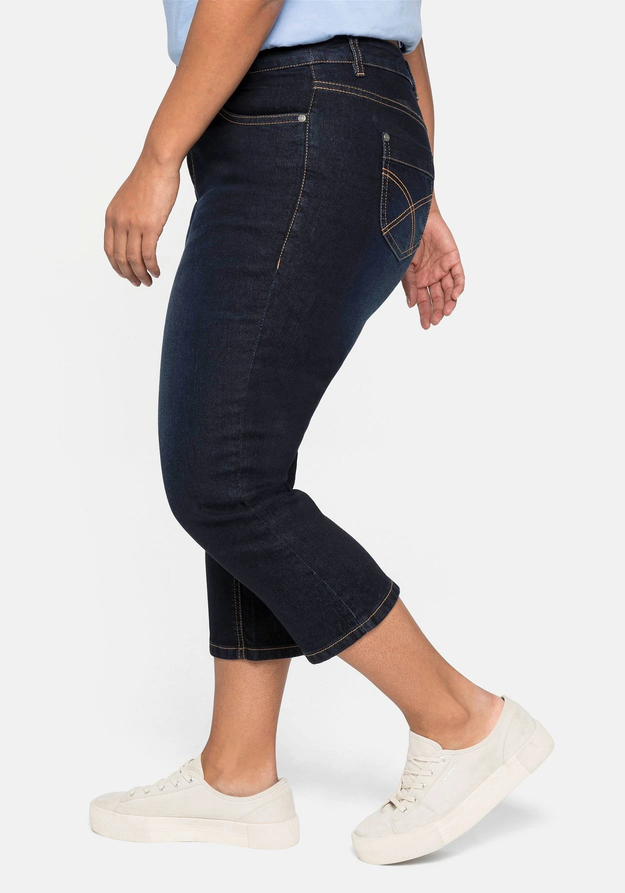 Jeans in Caprilänge. Der cleane Style zeigt sich in individueller Waschung, Catfaces und kontrastfarbene Nähte ergänzen den Look. Dazu passen der Formbund mit Gürtelschlaufen, Knopf und Reißverschluss sowie die klassischen fünf Taschen, die hinten bestickt sind.