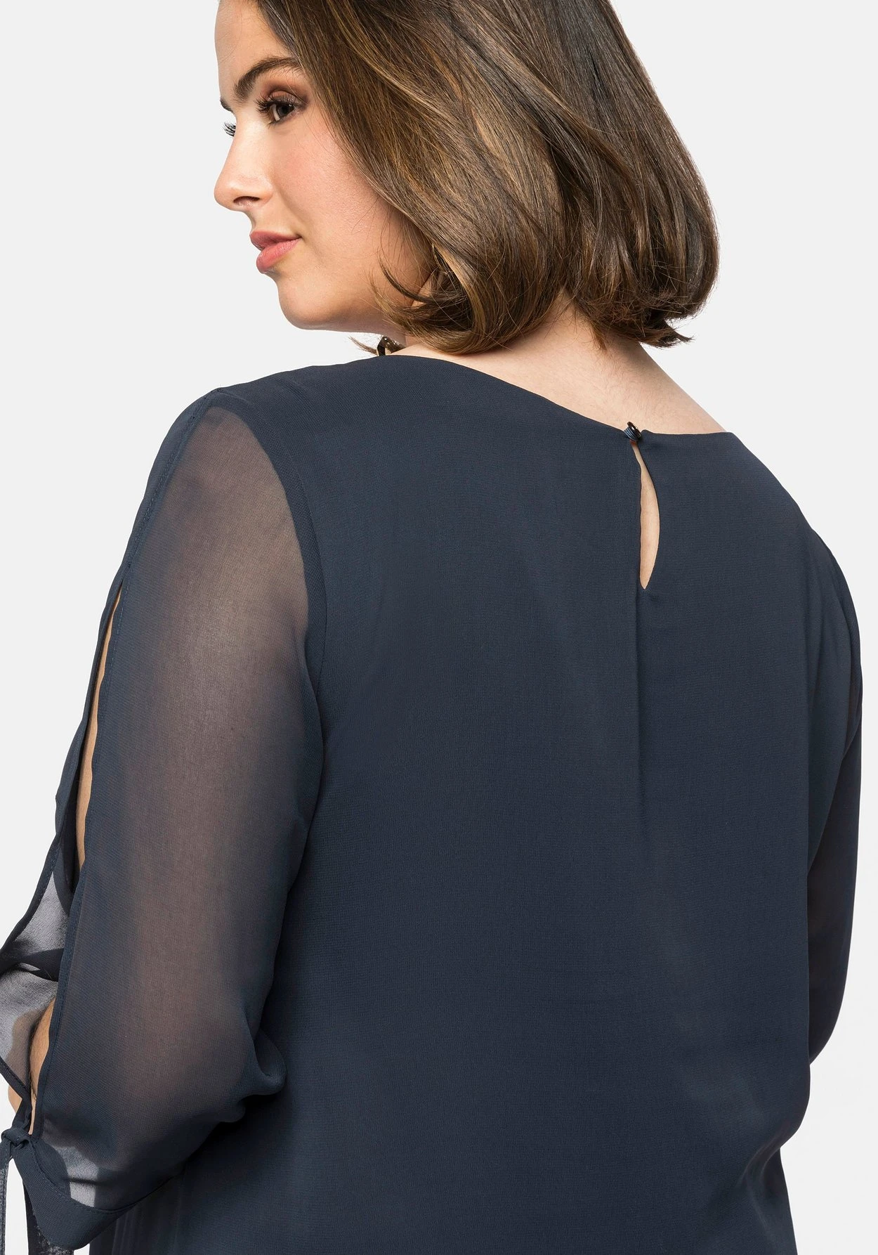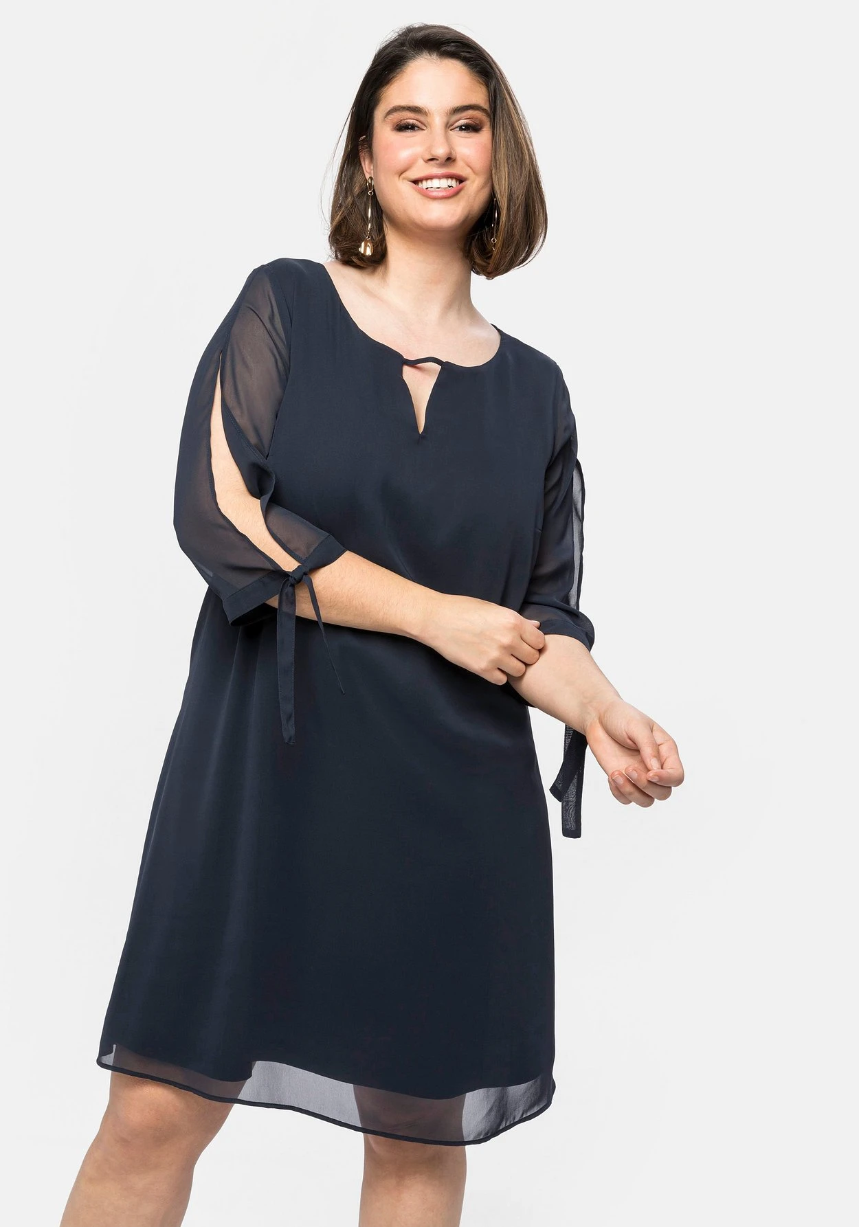 Cocktailkleid aus Chiffon. Die unkomplizierte Schlupfform wird durch besondere Details raffiniert ergänzt: So macht der V-förmige Cut-out den Rundhalsausschnitt zum Eyecatcher, im Rücken überrascht der mit einem Schmuckknopf verzierte Schlüssellochausschnitt. Highlight sind die 3/4-langen geschlitzten Ärmel, die mit einem Bindeband enden.