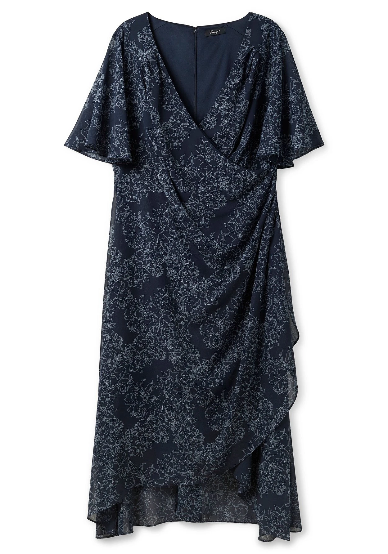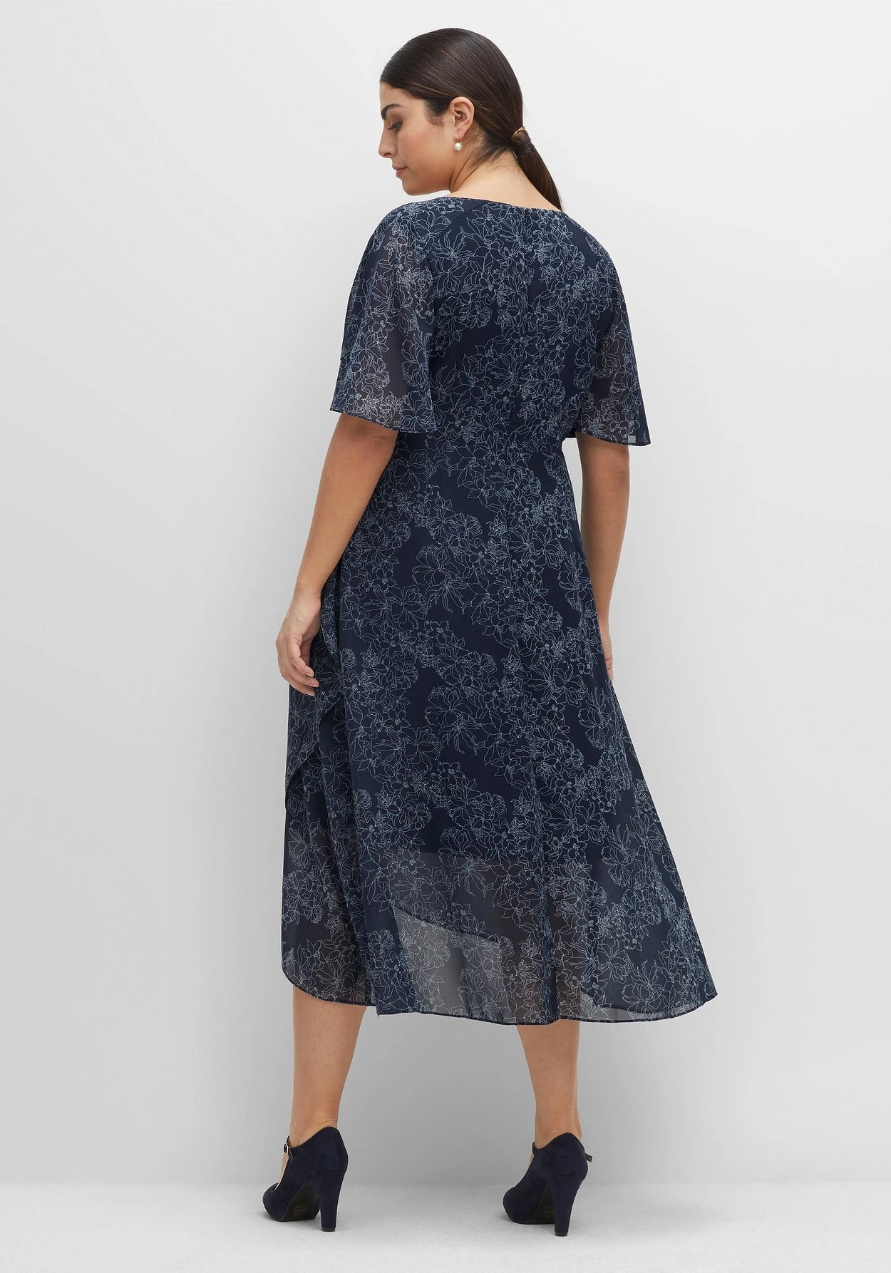 Abendkleid aus zartem, allover bedrucktem Chiffon. Die elegante Wickeloptik lässt einen großzügigen V-Ausschnitt entstehen, hinten ermöglicht ein nahtfeiner Reißverschluss einen leichteren Einstieg. Weit geschnittene Ärmel begeistern mit luftigem Tragegefühl, der längere Schnitt endet hinten in Wadenlänge und verleiht dem Kleid femininen Charme. Vorn zeigt sich das Rockteil ebenfalls in Wickeloptik und betont so die Beine. Ein bezauberndes Cocktailkleid, das am Tag und am Abend die Aufmerksamkeit auf sich zieht.
