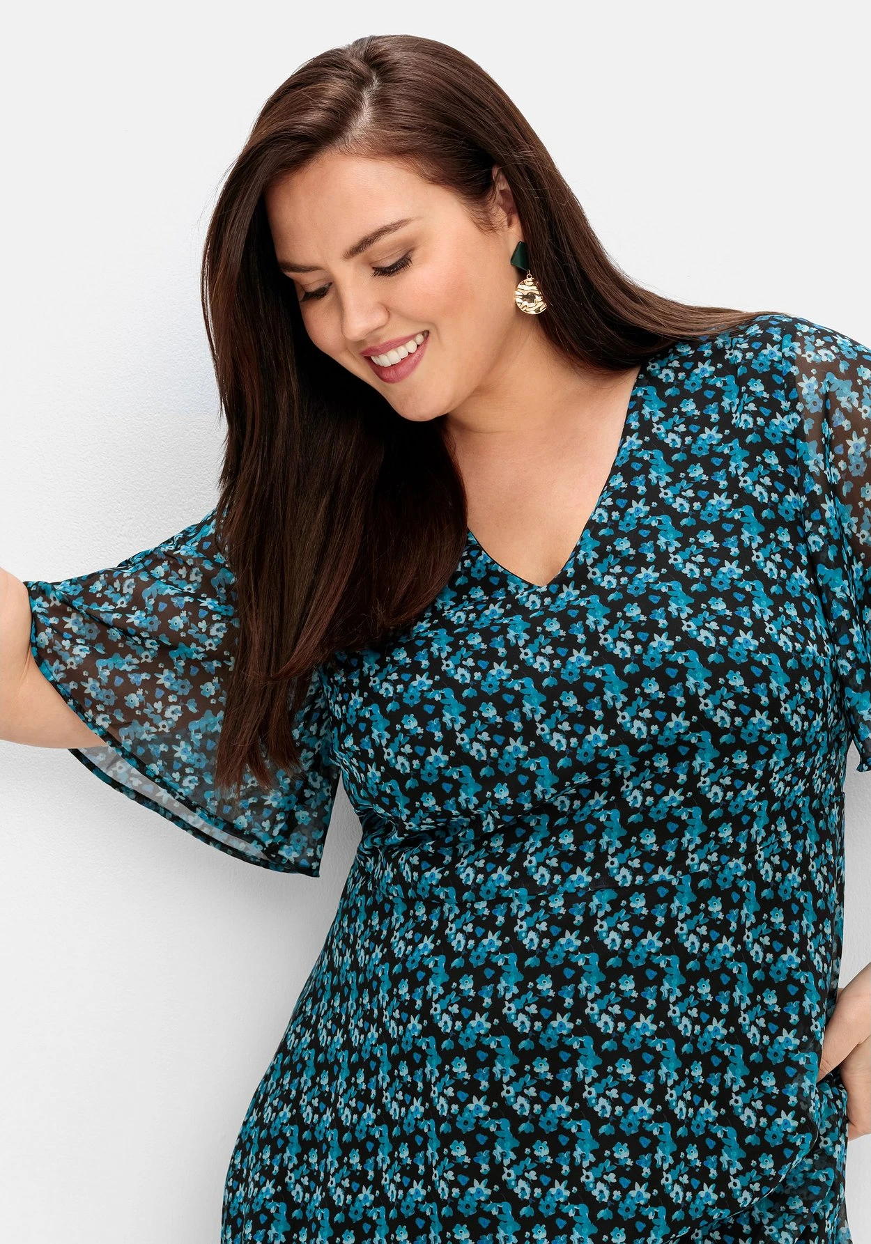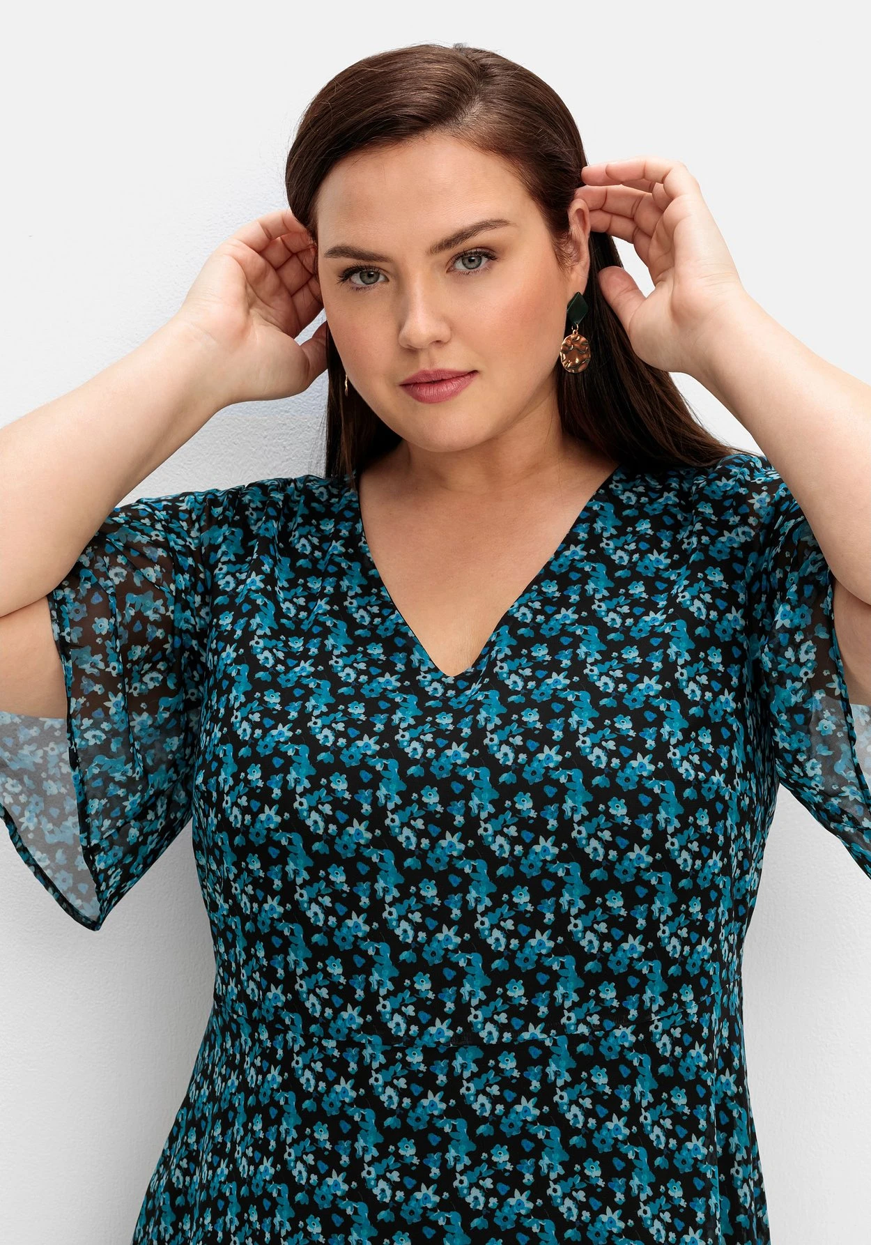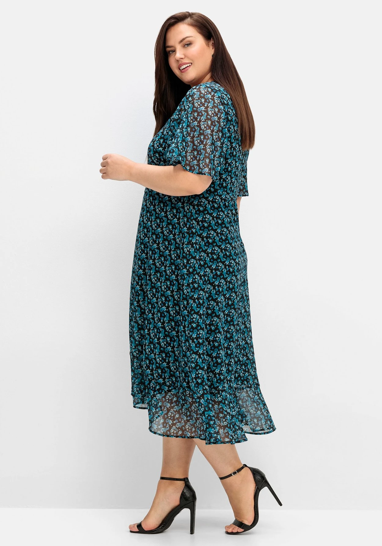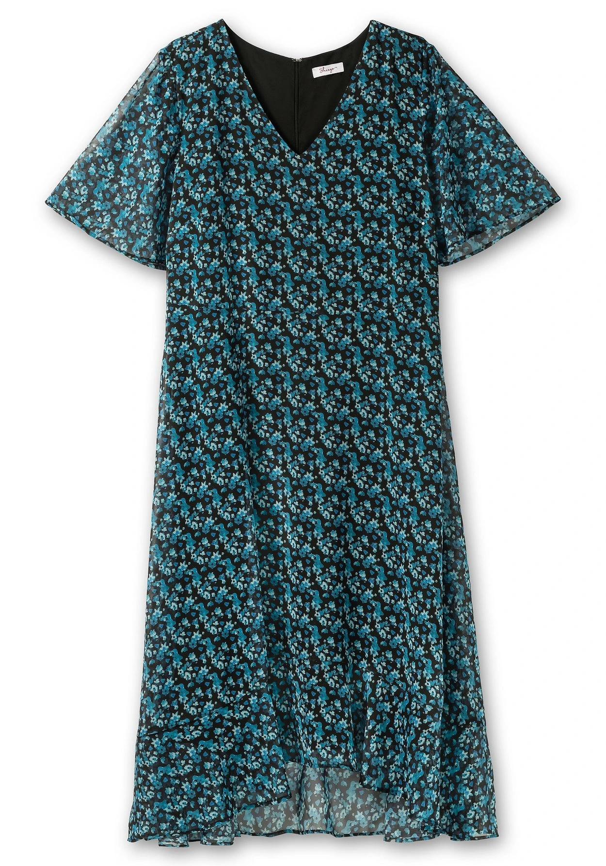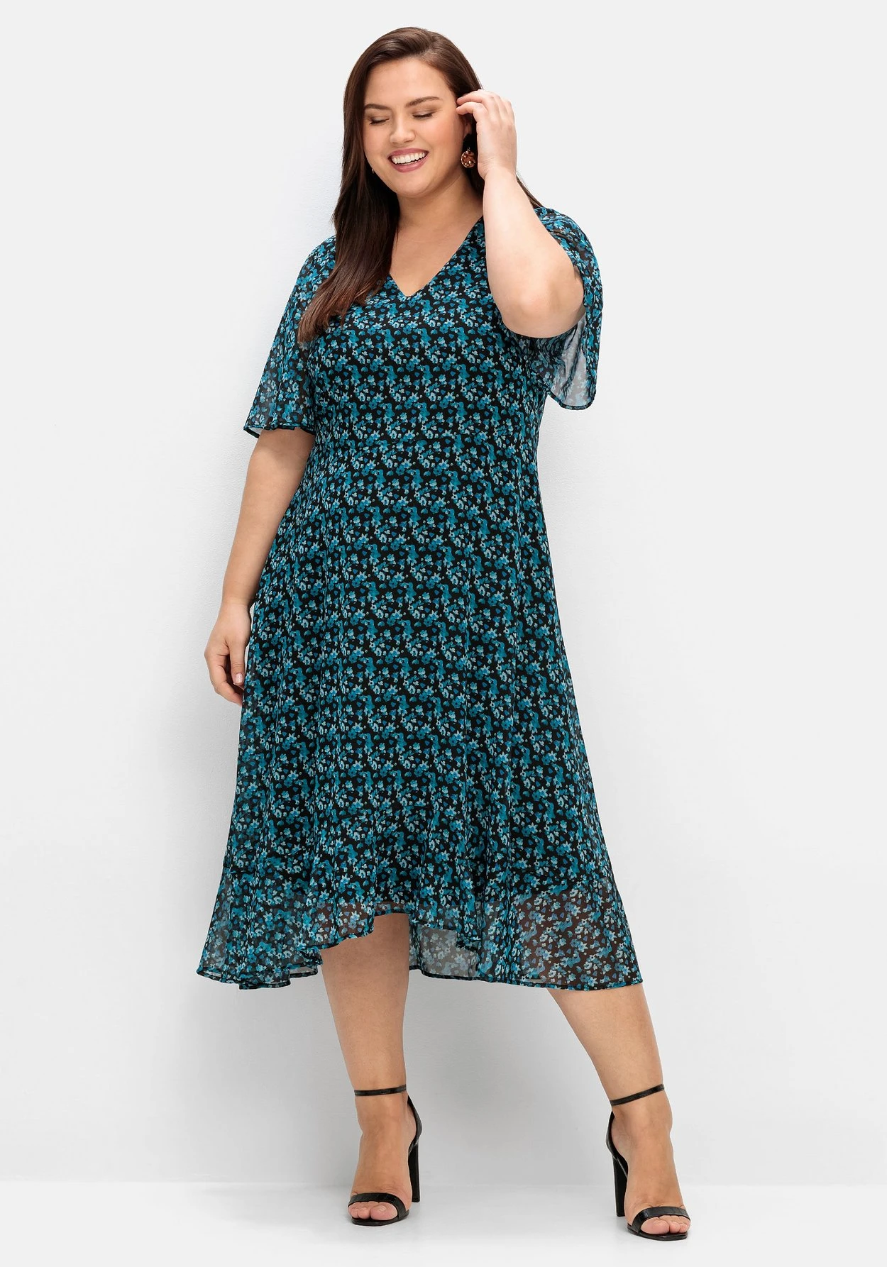 Chiffonkleid mit Blumendruck. In Zusammenspiel mit dem zarten, leicht transparenten Material und dem luftigen Schnitt entfaltet das Kleid seine feminine Wirkung. An den luftig fallenden Ärmeln und am Saum lässt es dezent ein wenig Haut durchschimmern, das Unterkleid macht den Body blickdicht. Durch den V-Ausschnitt wird der Oberkörper optisch gestreckt, hinten ist ein nahtfeiner Reißverschluss eingearbeitet. Der lange Rock ist hinten länger als vorn, der Volant am Saum gibt zusätzlichen Schwung.