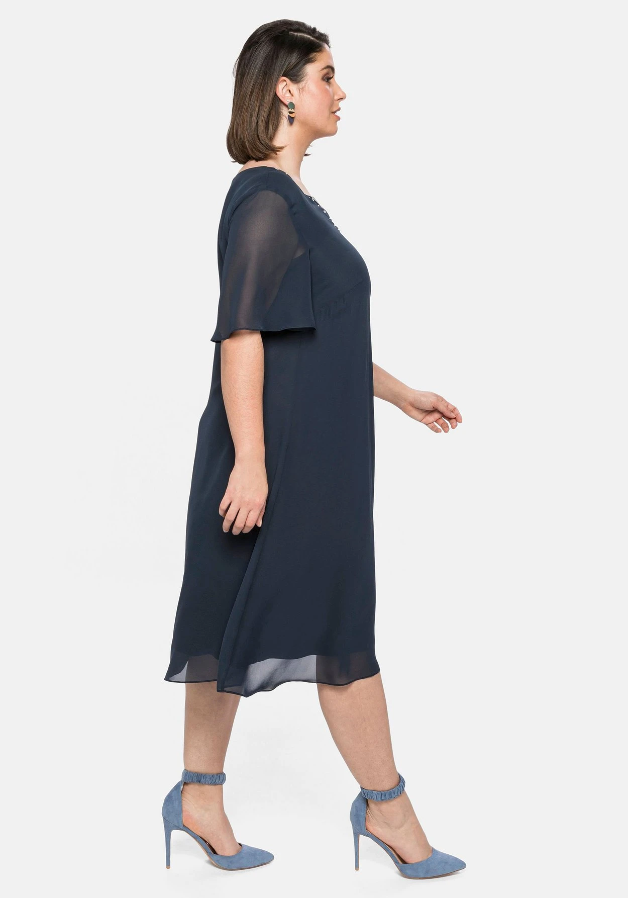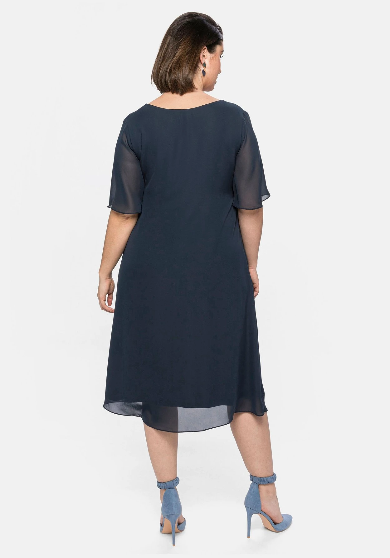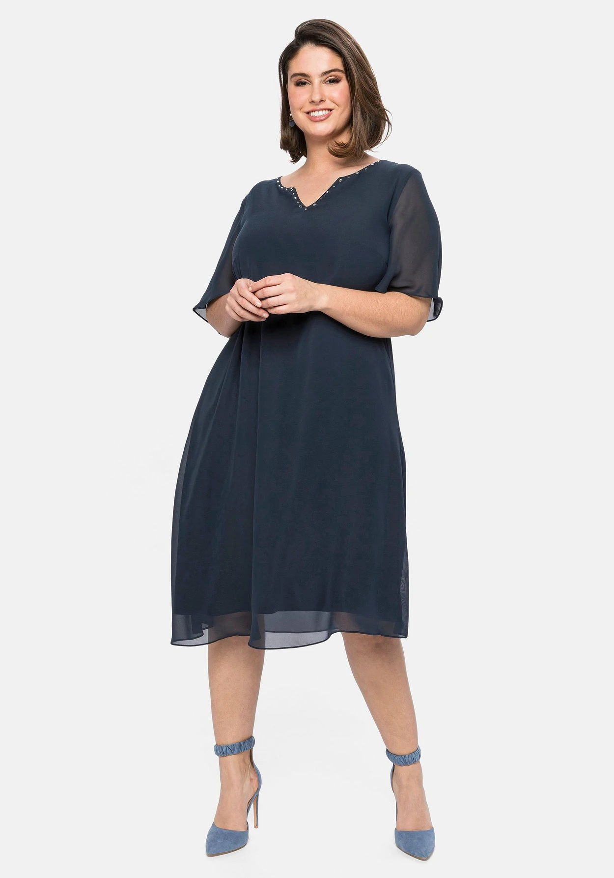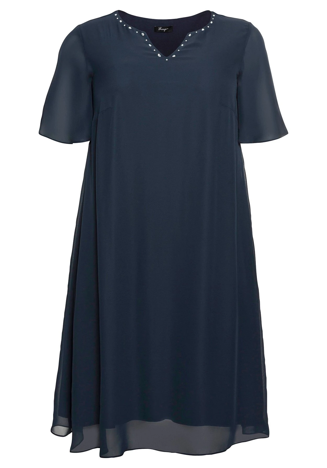 Chiffonkleid in leicht ausgestellter A-Linie. Für feminine Eleganz sorgt die obere Lage aus leicht transparentem Chiffon, das Unterkleid aus elastischem Single-Jersey macht den Look absolut blickdicht. Der ansonsten sehr cleane Schnitt kommt mit Rundhals und kleinem V-Ausschnitt. Glänzende Highlights setzen dabei die unterschiedlich großen Schmucksteine, die den Ausschnitt hübsch einrahmen. Semintransparente Flügelärmel ergänzen den festlichen Style.