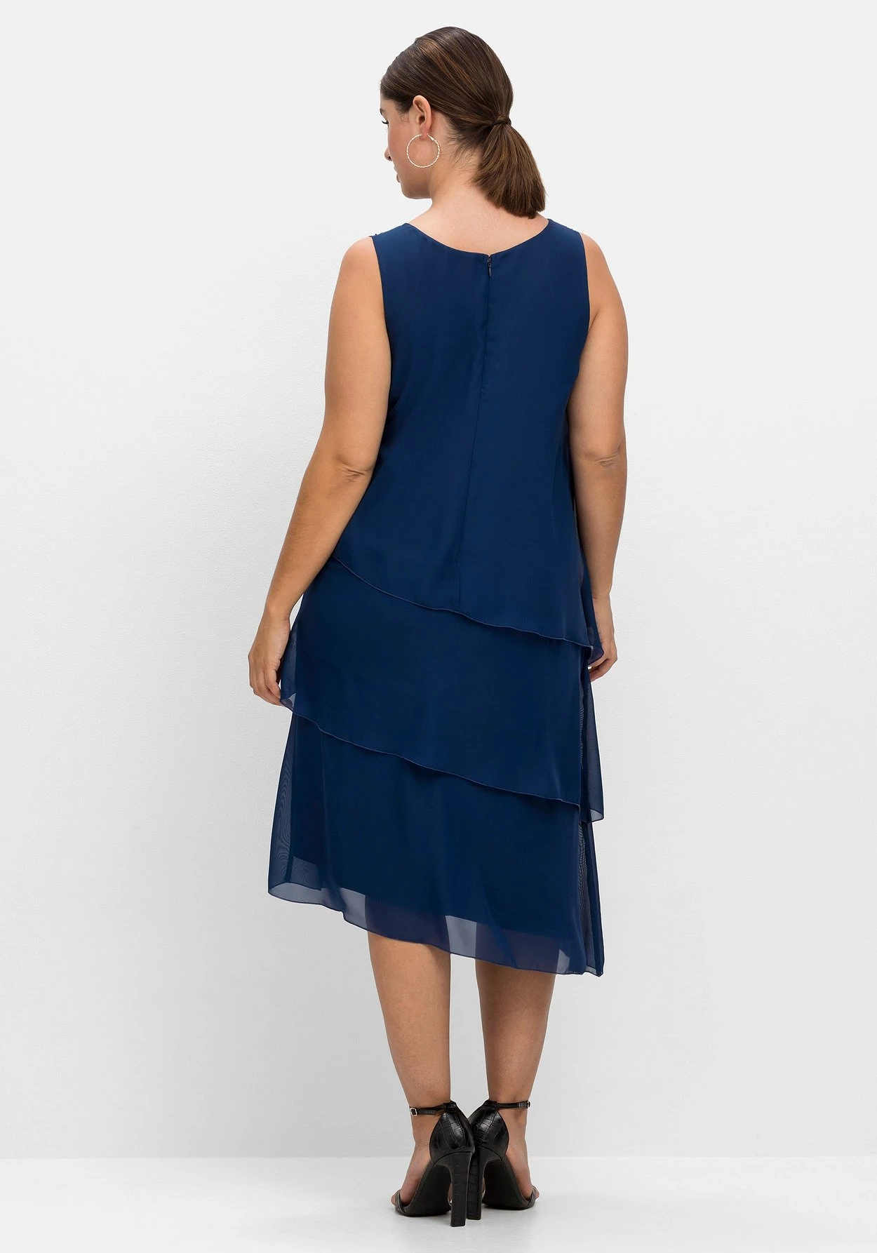 Abendkleid im Lagenlook. Zum absoluten Hingucker wird der raffiniert gearbeitete Cut-out-Ausschnitt. Das Kleid ist mit farblich darauf abgestimmten Zierstäbchen und Pailletten besetzt, die den glamourösen Look zusätzlich unterstreichen. Die in schräg verlaufenden Lagen drapierten Volants schwingen mit jedem Schritt wunderschön mit. Öffnen und schließen lässt sich das Kleid mit einem nahtfeinen Reißverschluss im Rücken.