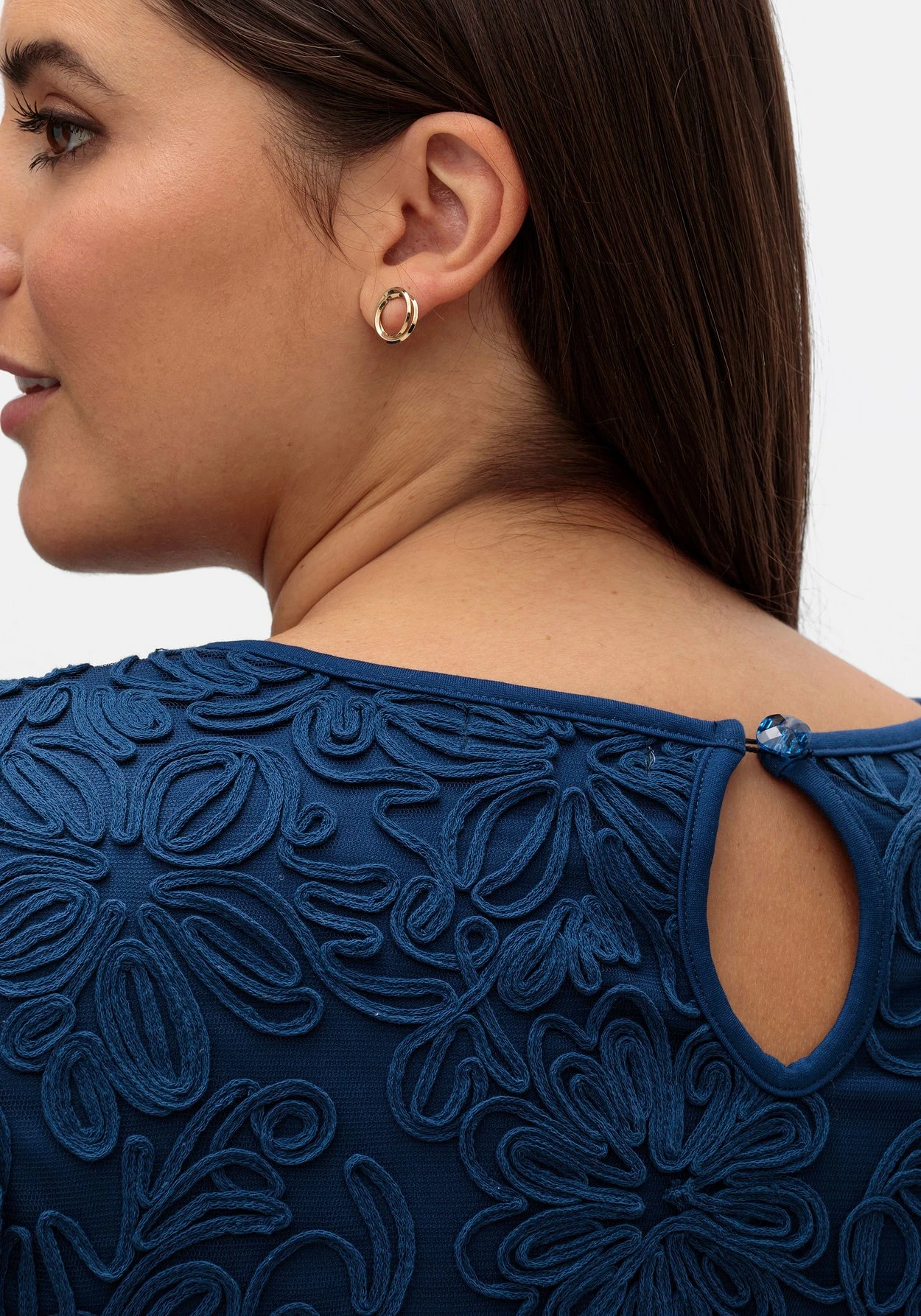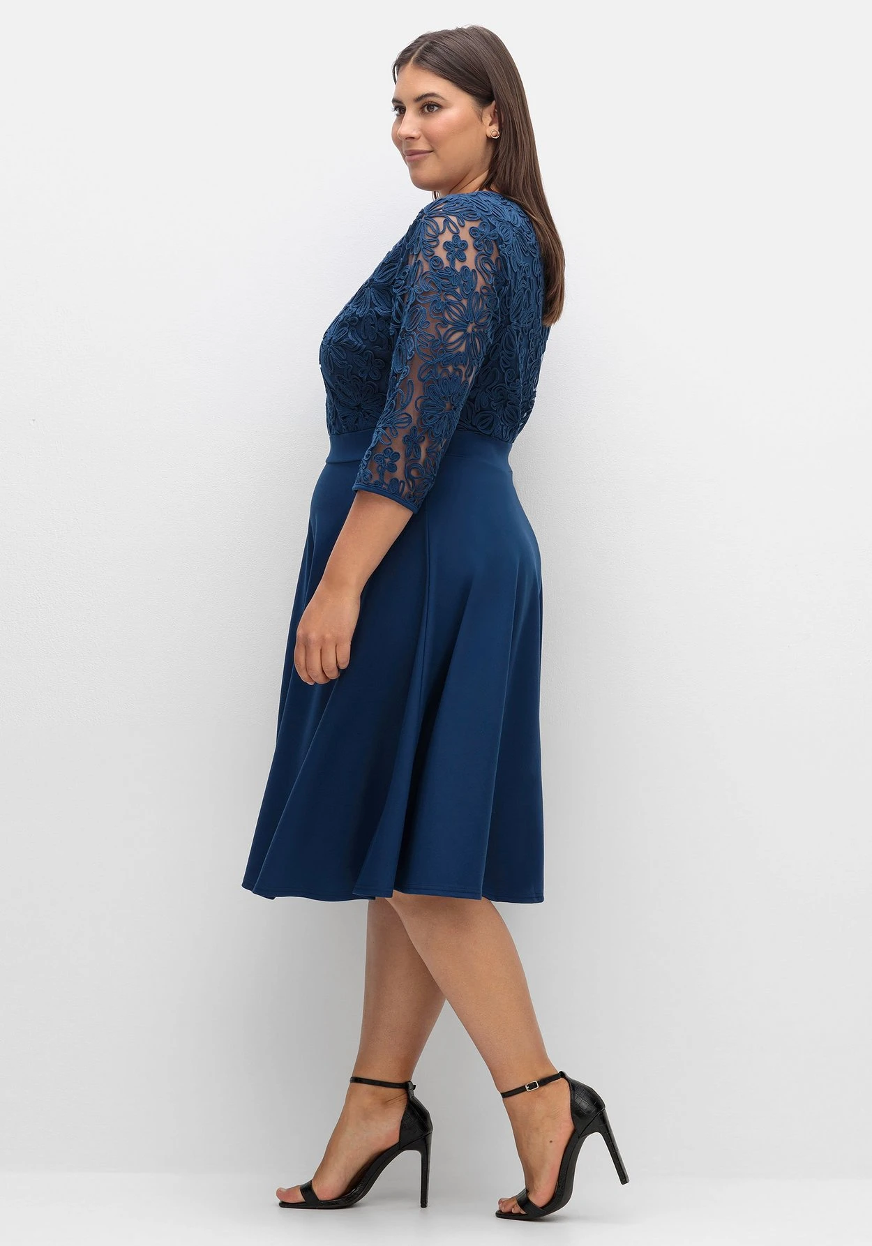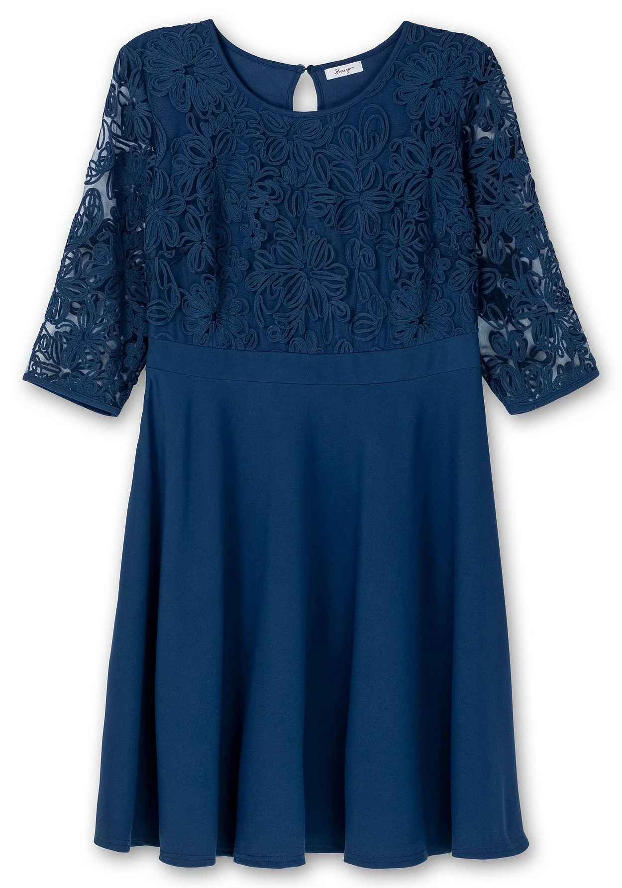 Cocktailkleid in fließender Qualität. Die aufwendigen Zierborten verleihen dem Kleid raffinierte Eleganz, gleichzeitig lassen sie die transparent gehaltenen 3/4-langen Ärmel angezogener wirken. Durch das Taillenband rückt die Körpermitte in den Fokus, der sich anschließende, leicht ausgestellte Rock umspielt locker die Beine. Der Rundhalsausschnitt ist im Nacken mit Schlitz und Knopf gearbeitet, ein nahtfeiner seitlicher Reißverschluss ergänzt den festlichen Style.