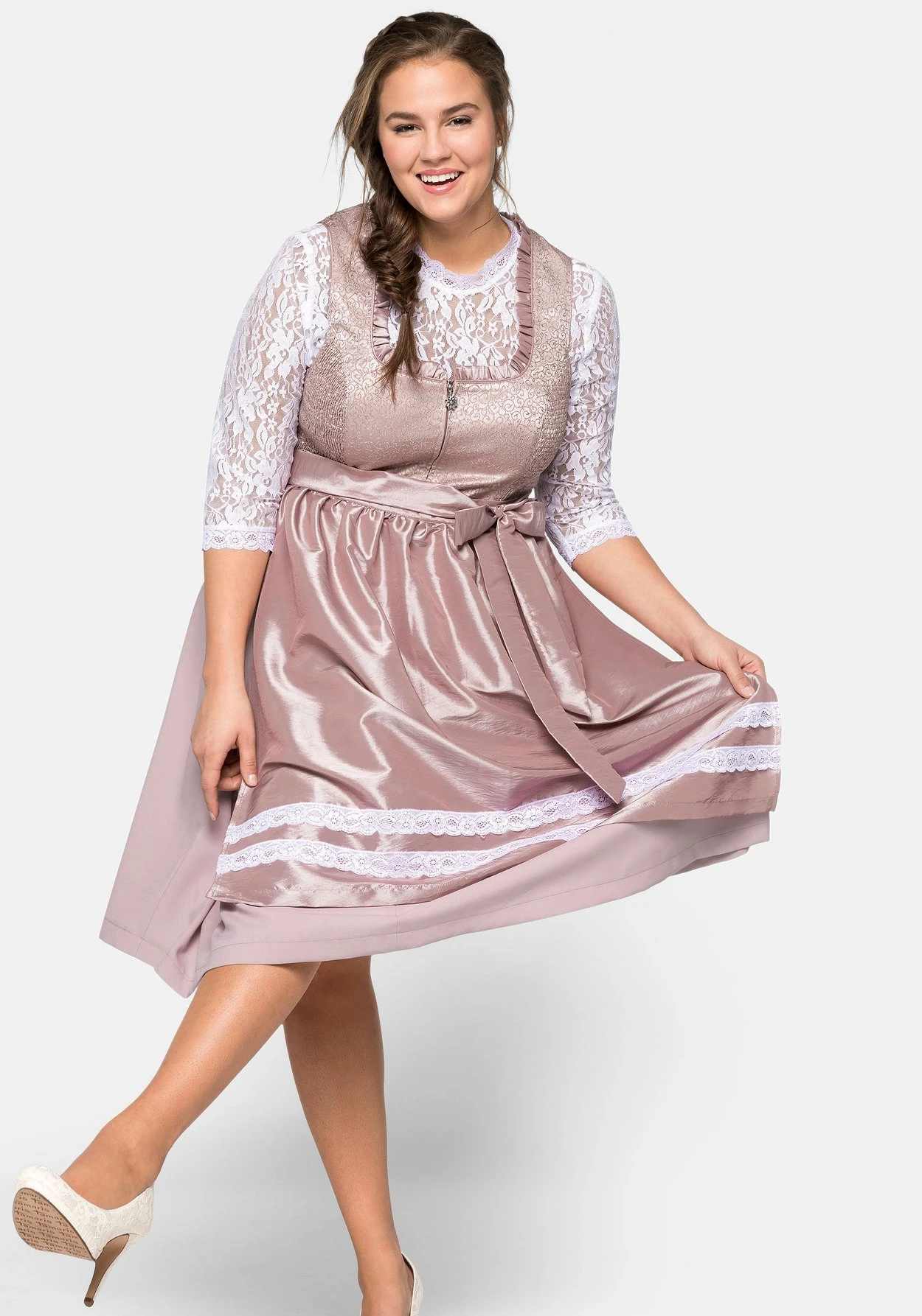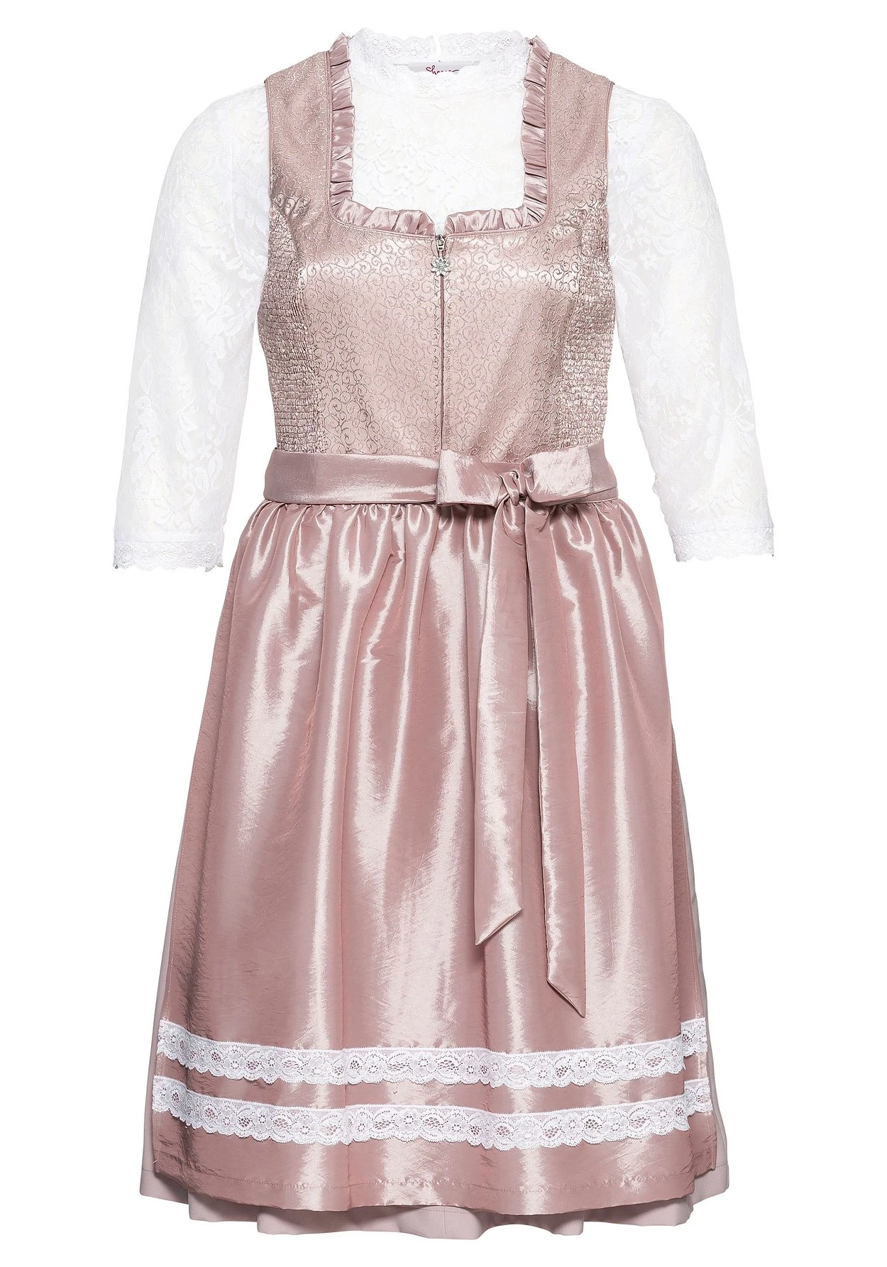 Dirndl dreiteilig mit Schürze und Spitzenbluse. Die leicht transparente Bluse aus Spitze zeichnet sich durch die 3/4-langen Ärmel und den elastischen Bund aus. Das Kleid erhält seinen edlen Look durch das bestickte Oberteil mit seitlichen Smokeinsätzen und einem Reißverschluss mit traditionellem Zipper vorn. Am Ausschnitt dient ein Rüschenbesatz als feminines Detail. Das Rockteil ist einfarbig, weit schwingend und hat seitlich nahtfeine Taschen. Besonders hochwertig wirkt die changierende, abknöpfbare Schürze mit Spitzenbesatz.