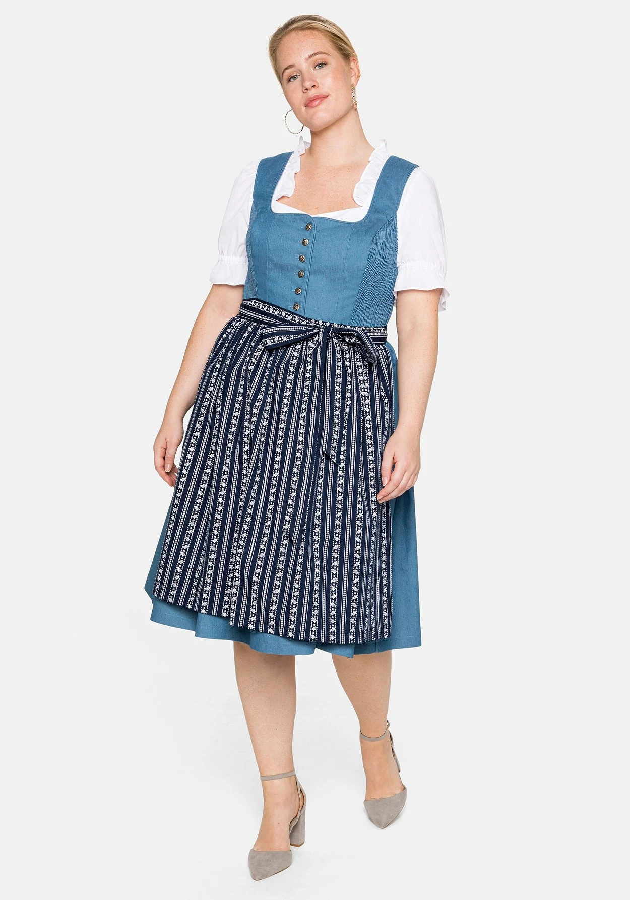 Dirndl mit Schürze, 2-teilig. Das unifarbene, in Jeansoptik gehaltene Kleid wirkt jung und modern, die floral bedruckte Schürze setzt hierzu einen verspielten Kontrast. Die kurze Knopfleiste erhält durch die metallfarbenen, geprägten Knöpfe eine rustikale Note. Am Oberteil ist das Dirndl gefüttert, seitliche Smokeinsätze sorgen für den idealen Sitz. Zwei nahtfeine Taschen seitlich sind eine praktische Ergänzung.
