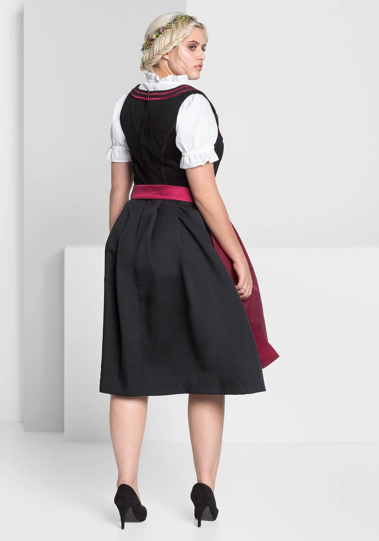 Dieses sheego Dirndl ist der perfekte Begleiter fürs Oktoberfest. Die wunderschöne Korsage in Samt-Optik erhält durch eine kontrastfarbene Stickerei eine besondere Note. Rüschenbesätze an Ausschnitt und Ärmeln zieren die Bluse zusätzlich. Mit dem Bindeband lässt sich der Ausschnitt individuell raffen. Hinten erleichtert ein nahtfeiner Reißverschluss das Ankleiden.