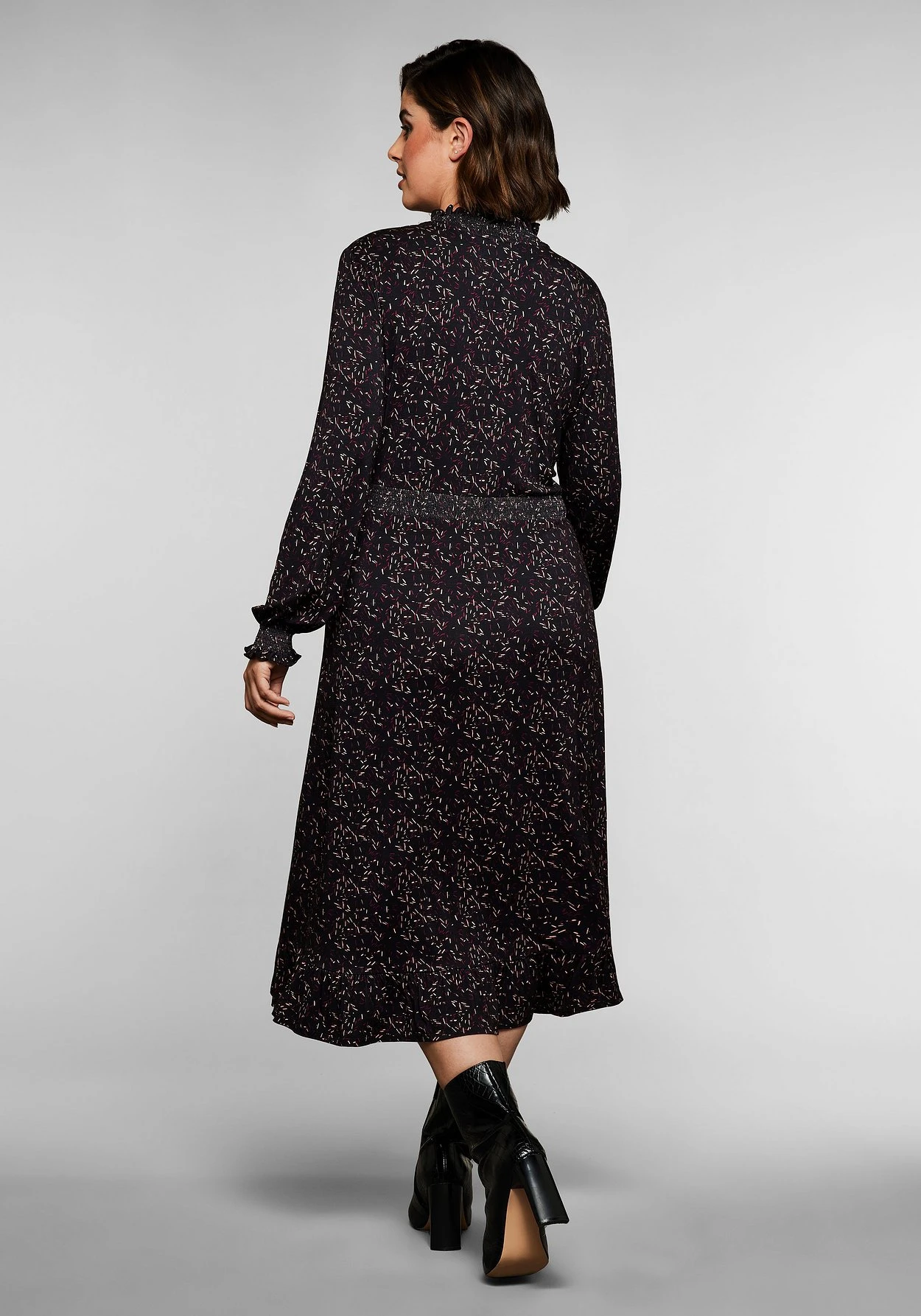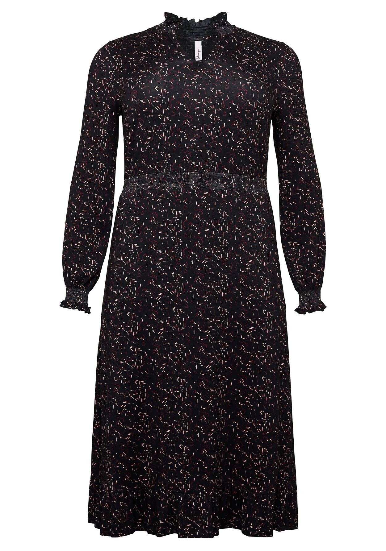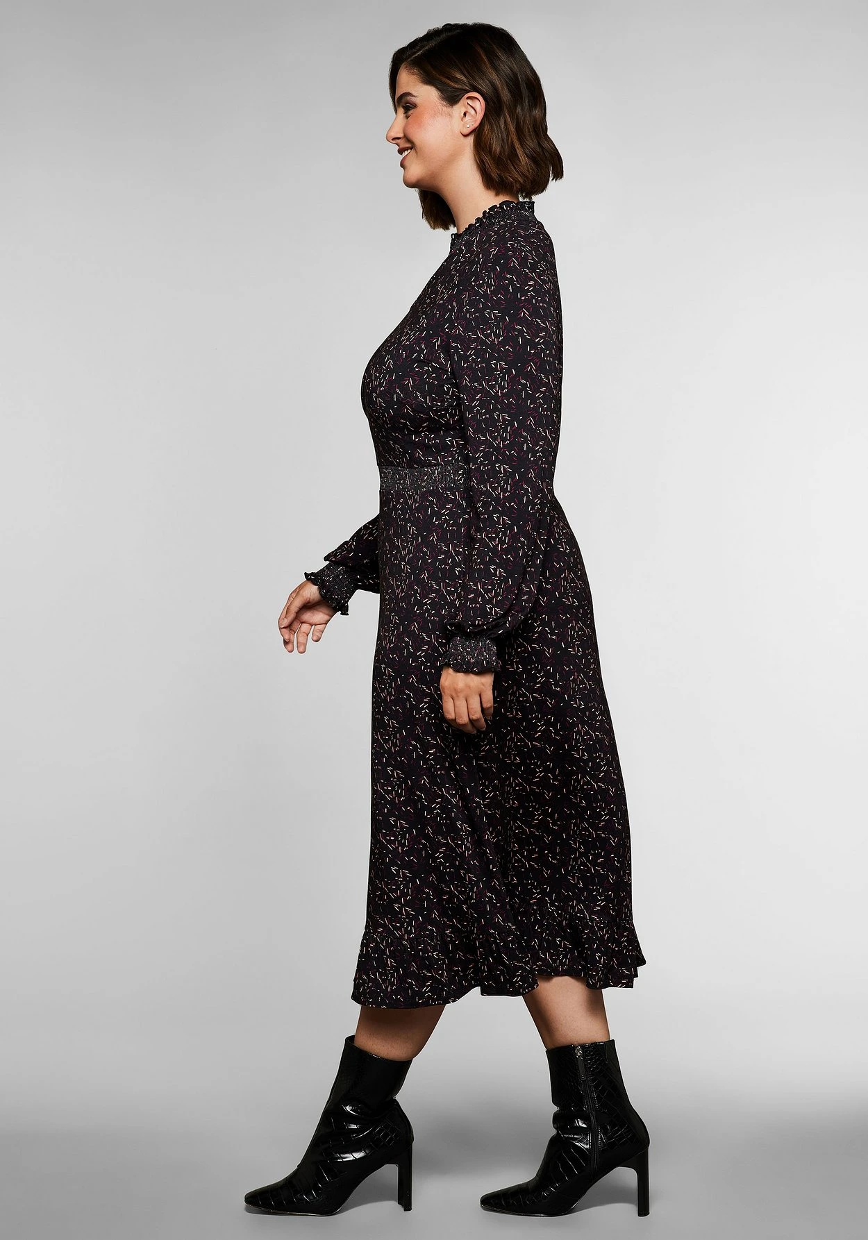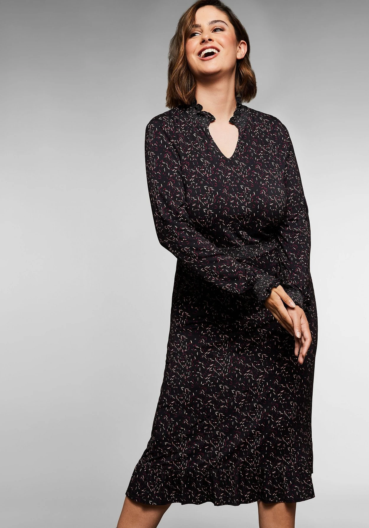 Kleid mit Alloverprint. Für Charme sorgt der gesmokte Stehkragen, der in einen V-Ausschnitt übergeht. Auch die langen Ärmel enden mit Smok-Bündchen, die gesmokte Taille sitzt bequem und betont die feminine Silhouette. Verspieltes Finish ist der Volant am Saum.