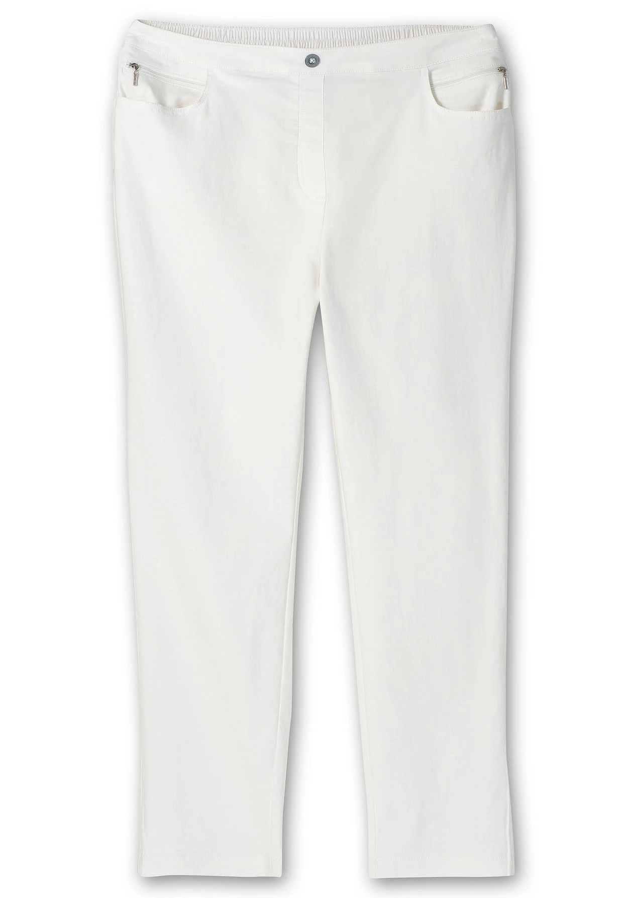 Bengalinhose in elastischer Qualität. Die Schlupfhose ist hinten am Bund mit elastischen Einsätzen gearbeitet und lässt sich dadurch bequem an- und ausziehen. Der Zierknopf und die imitierte Reißverschlussblende verleihen ihr eine gepflegte Optik. Vorn besitzt sie zwei abgerundete Eingrifftaschen, schmückende Zierreißverschlüsse dienen als modische Details.