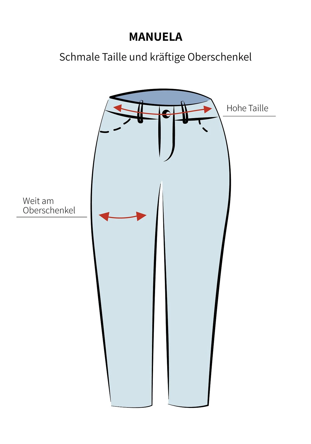 In gerader Beinform. Die Passform MANUELA besitzt eine hohe Taille und sitzt weit und bequem am Bein – perfekt für die Figur mit schmalerer Taille und kräftigeren Oberschenkeln.