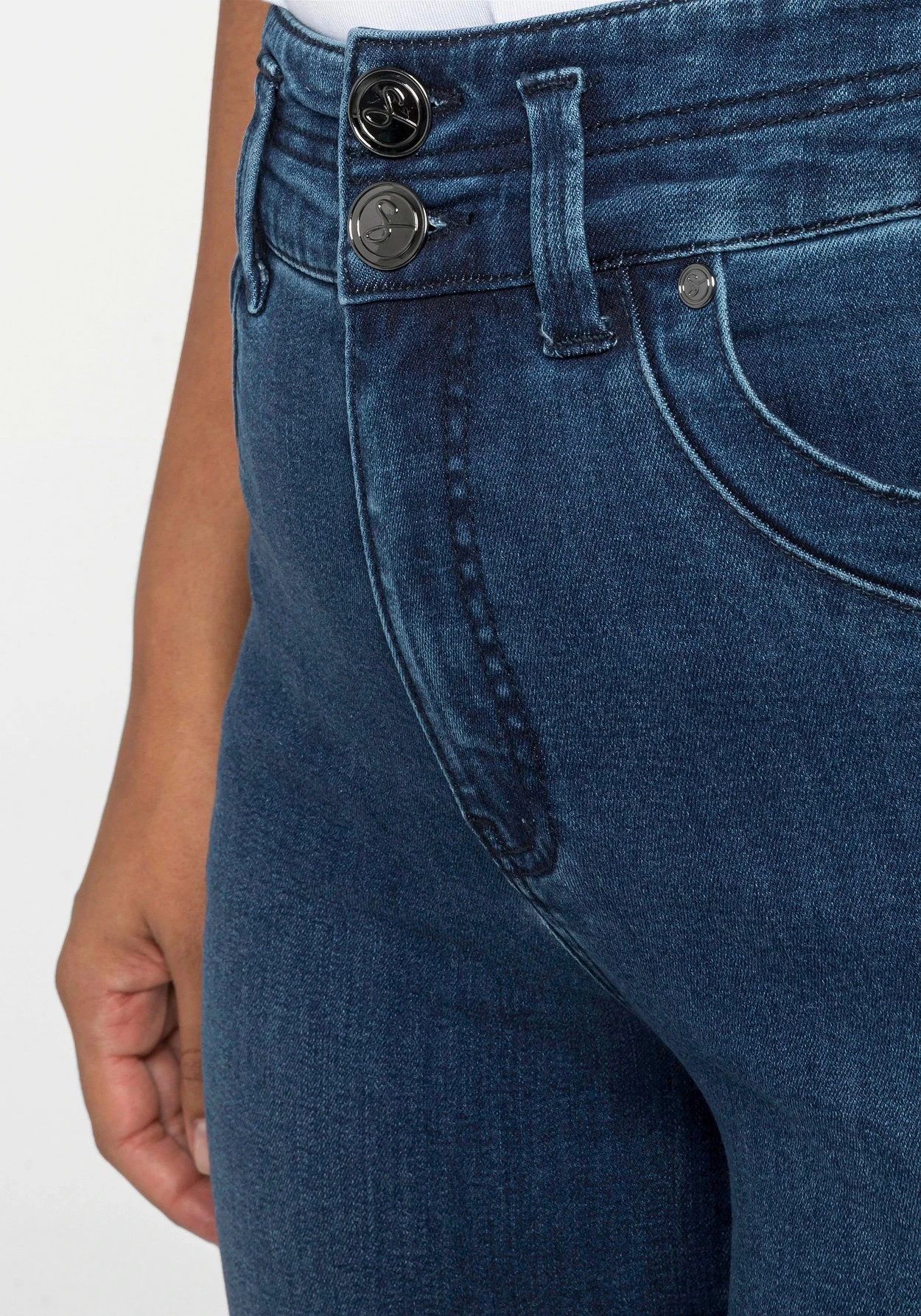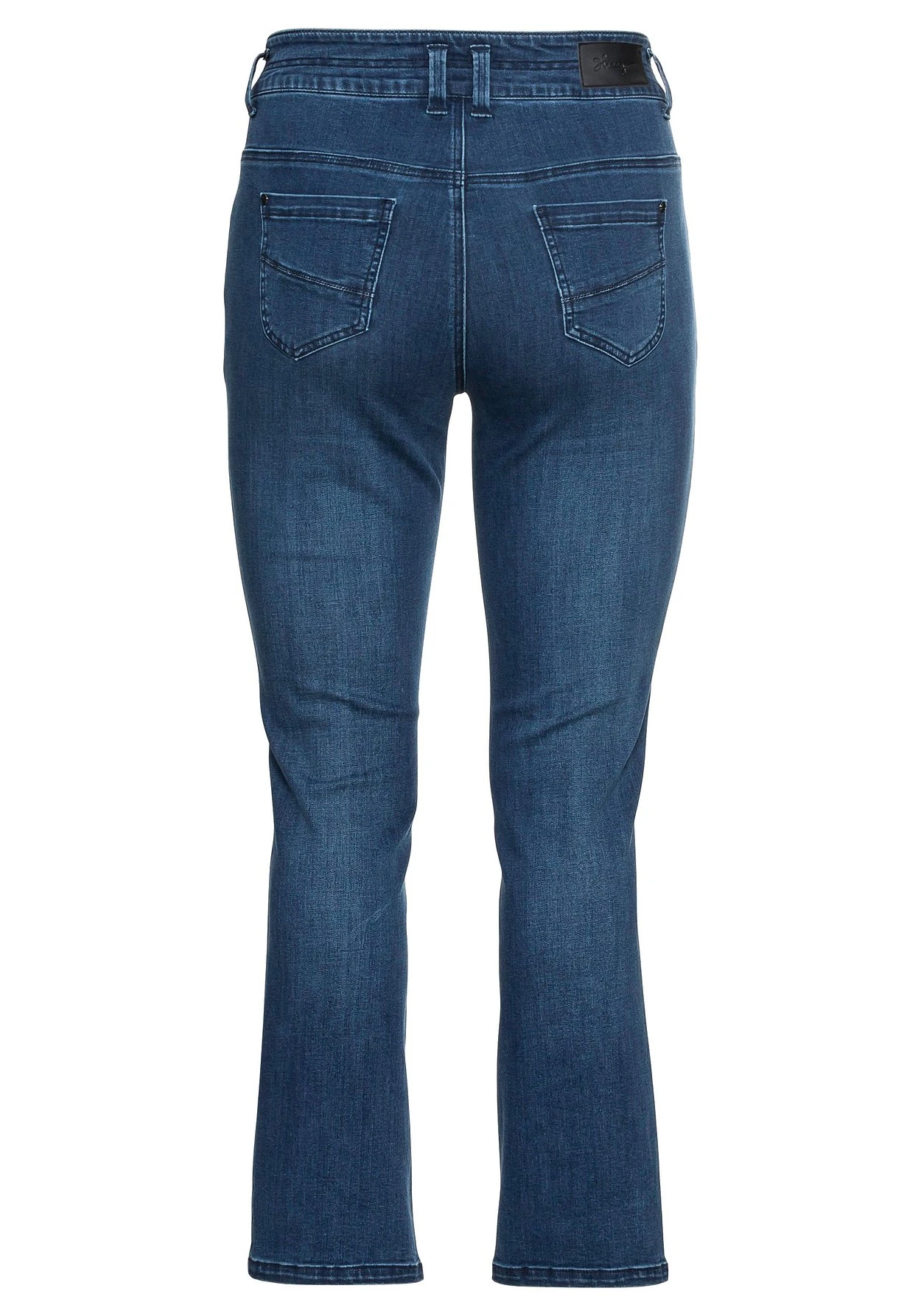 Gerade Jeans in Curvy-Schnitt MANUELA, bei schmalerer Taille und kräftigen Oberschenkeln. Der cleane Look zeigt sich mit Formbund, Gürtelschlaufen, zwei Knöpfen und Reißverschluss. Der Five-Pocket-Stil erhält durch die Stickerei an den Taschen vorn eine verspielte Note. Die individuelle Waschung macht den kombistarken Look perfekt.