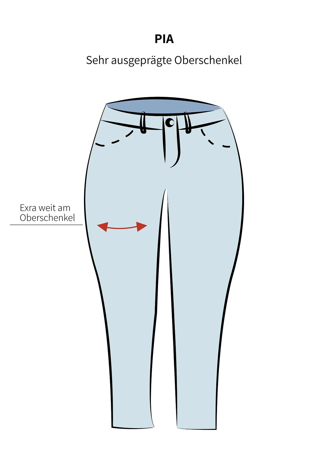 Die gerade geschnittene Jeans zeigt sich in der Passform PIA und ist damit ideal für die Figur mit sehr kräftigen Oberschenkeln geeignet. Dabei wirken die Teilungsnähte vorn optisch streckend. Die knöchelfreie Länge sorgt für eine moderne Silhouette.