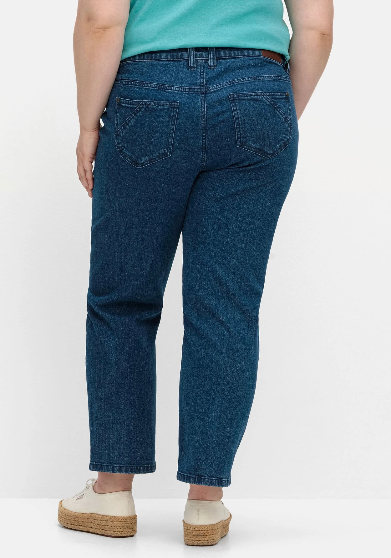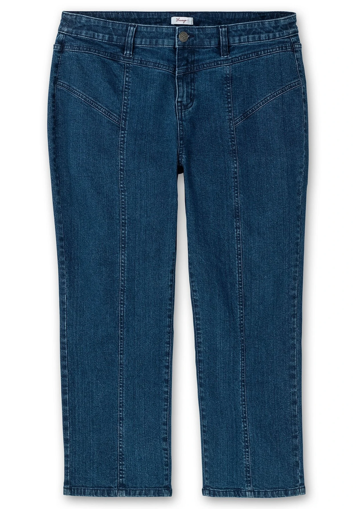 Gerade Jeans in der Passform PIA, ideal für die Figur mit sehr kräftigen Oberschenkeln. Die Hose ist in knöchelfreier Länge gearbeitet, Eyecatcher sind die Teilungsnähte vorn auf dem Oberschenkel. Der Formbund ist mit Gürtelschlaufen gearbeitet, aufgesetzte Taschen hinten sowie eine individuelle Waschung ergänzen den Look.