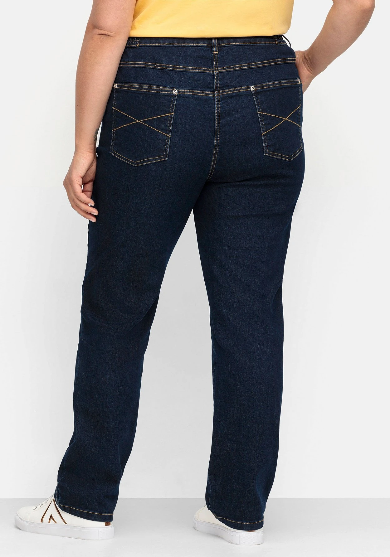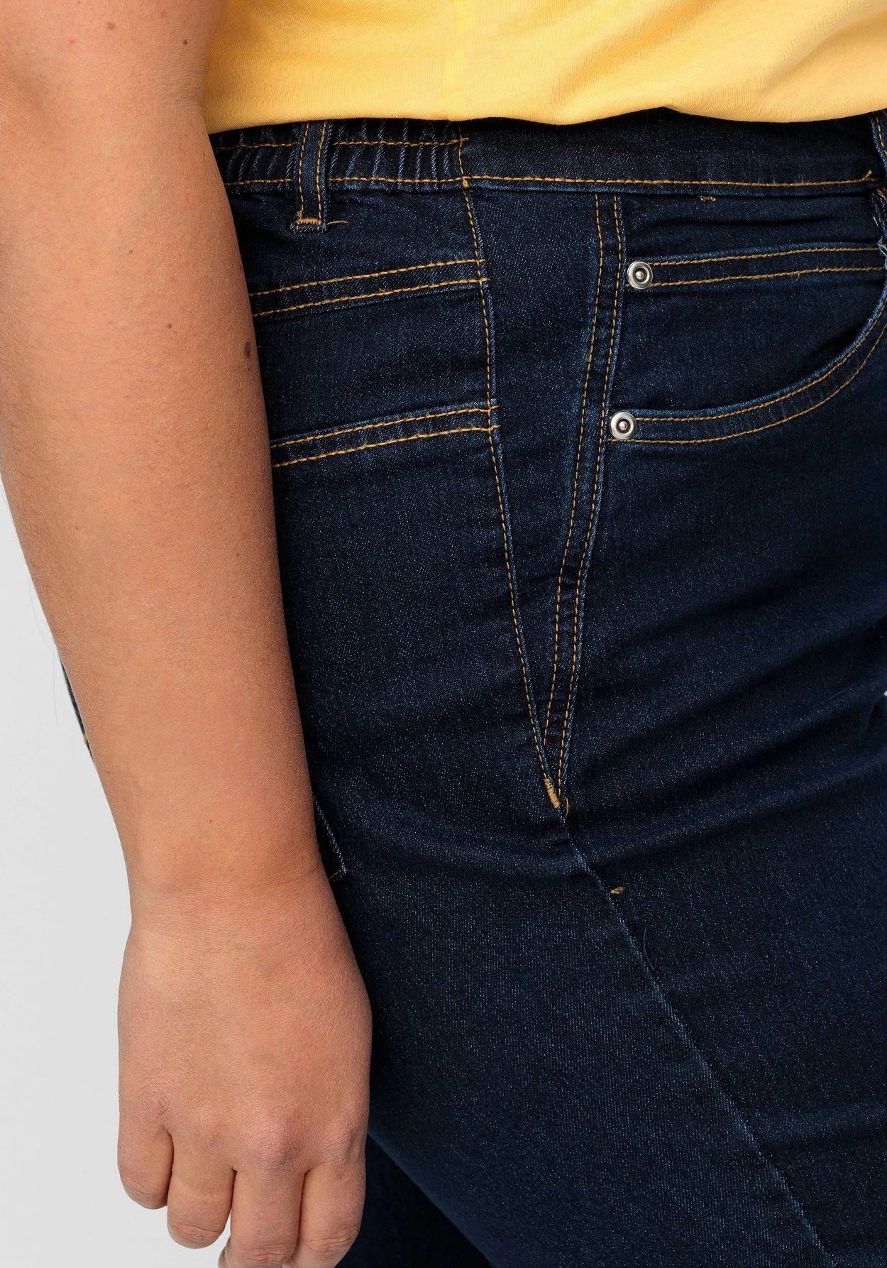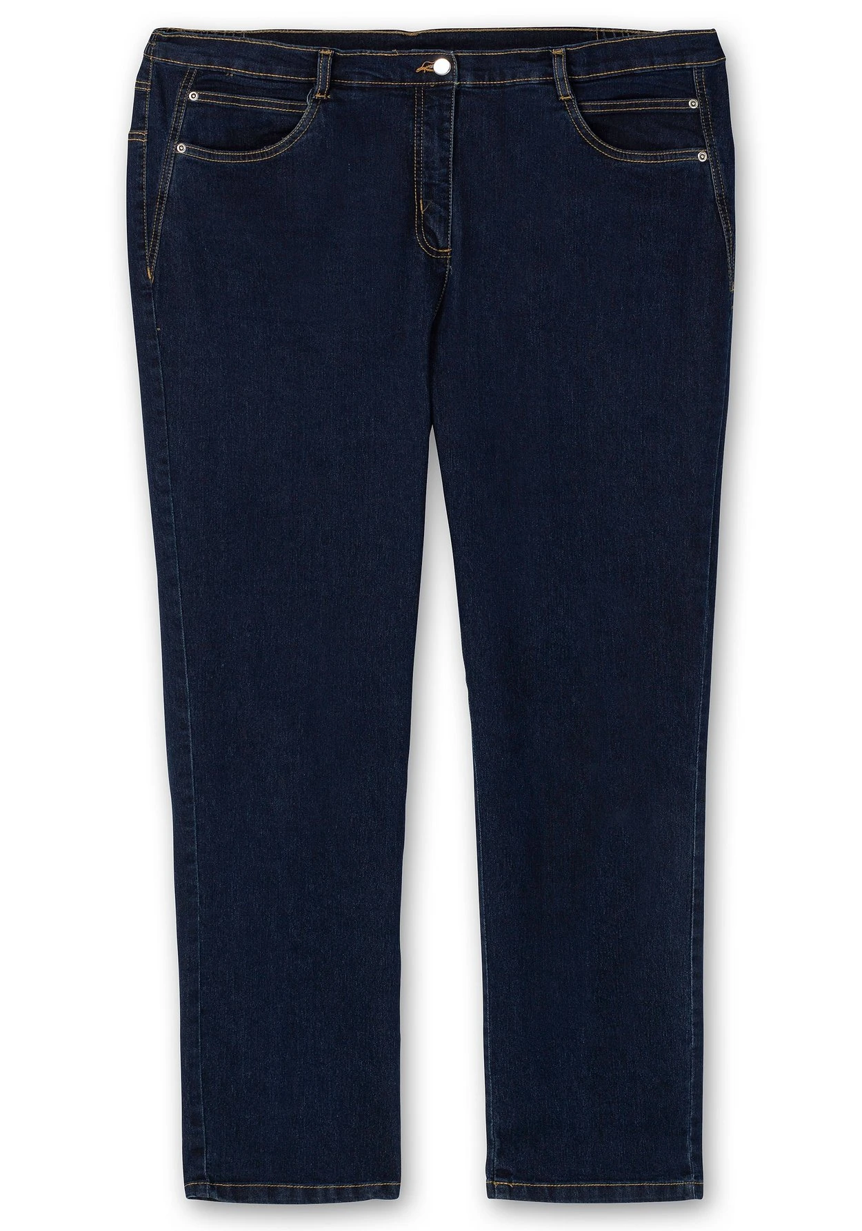 Stretch-Jeans in gerader Form. Der Komfortbund ist seitlich mit einem bequemen Dehnbund gearbeitet und engt dadurch nicht ein. Zu schließen lässt sich die Hose mit Knopf und Reißverschluss, dazu kommen praktische Gürtelschlaufen. Vorn befinden sich zwei abgerundete Eingrifftaschen, die jeweils mit kleinen Münztaschen ausgestattet sind. Hinten sind die Gesäßtaschen mit einer dekorativen Ziernaht versehen. Seitliche V-Einsätze zeichnen eine figurschmeichelnde Linie.