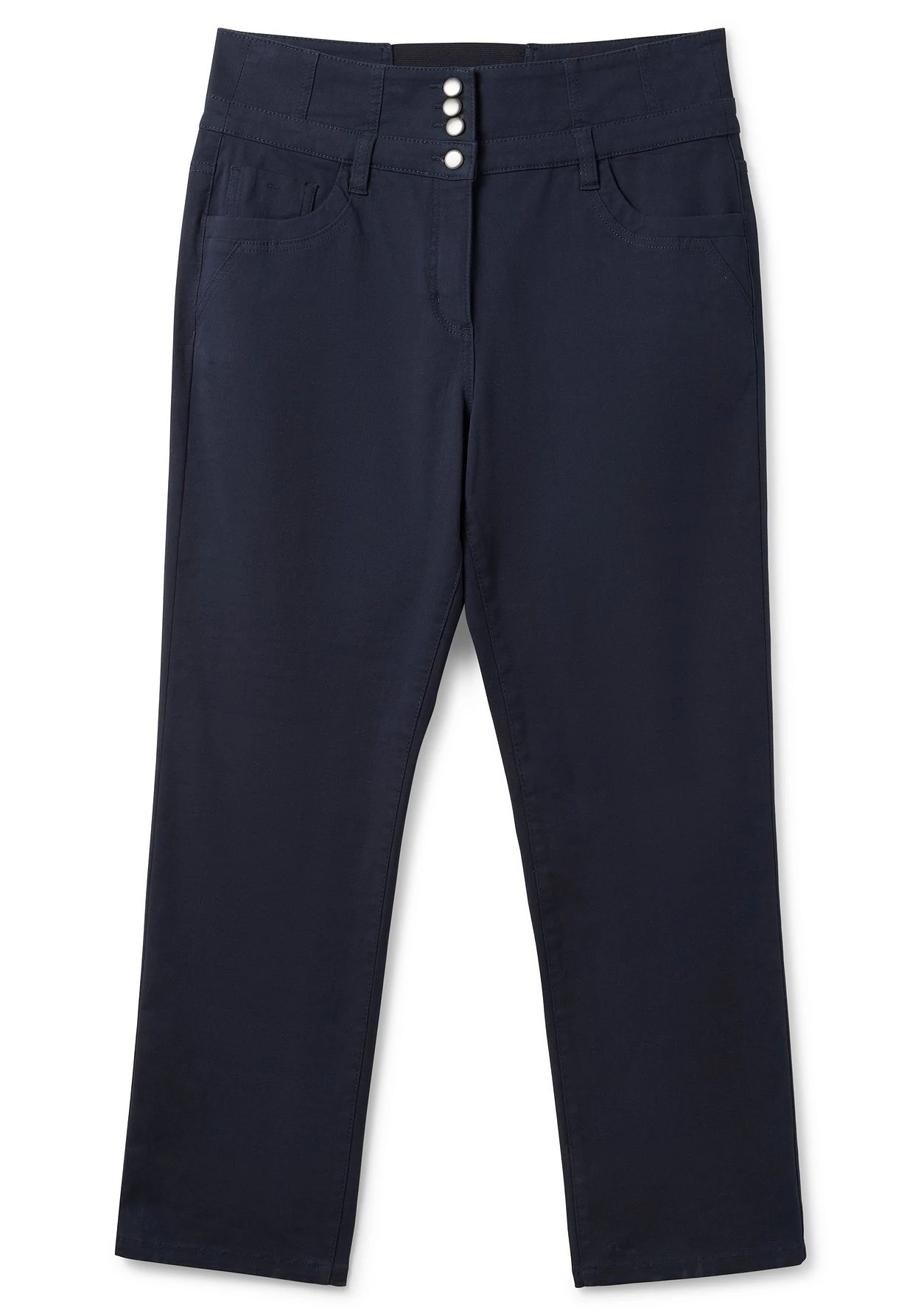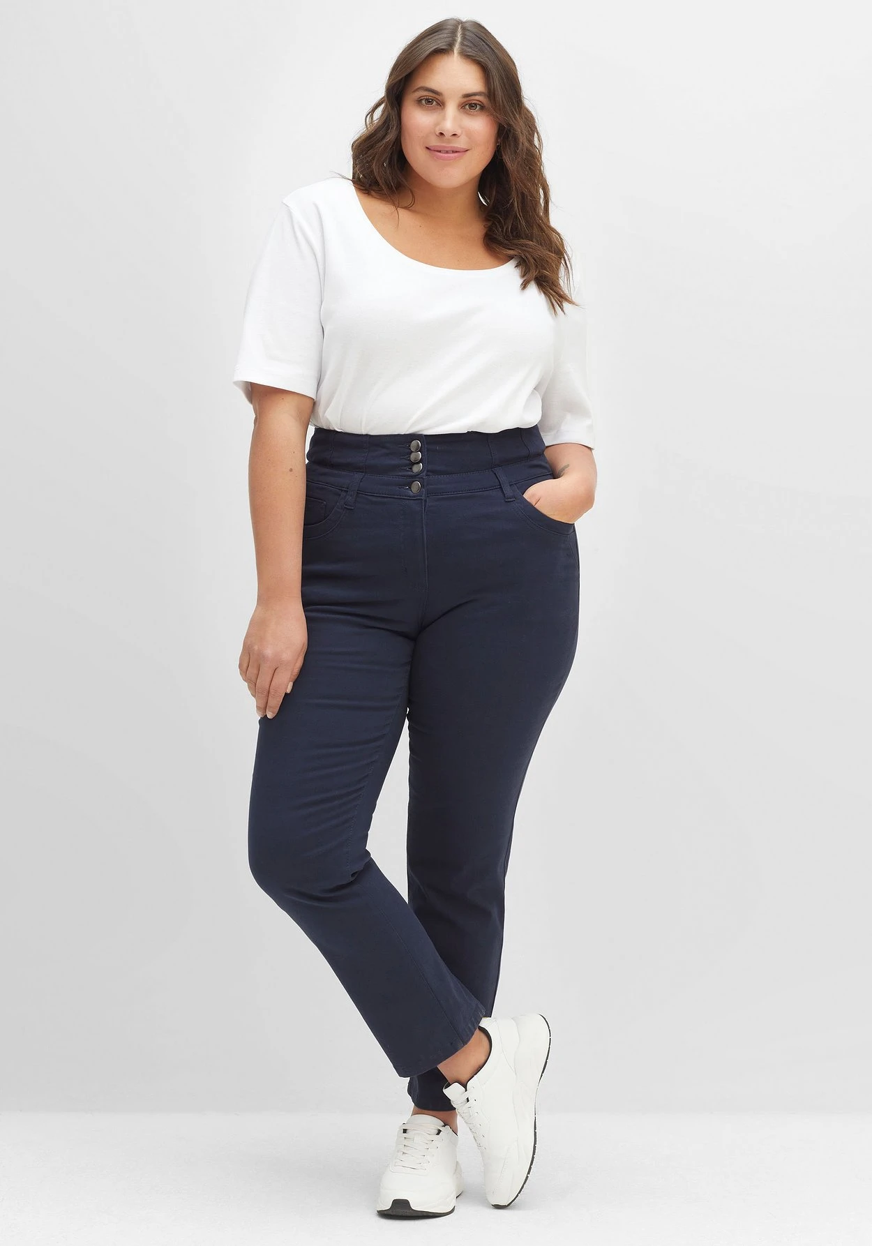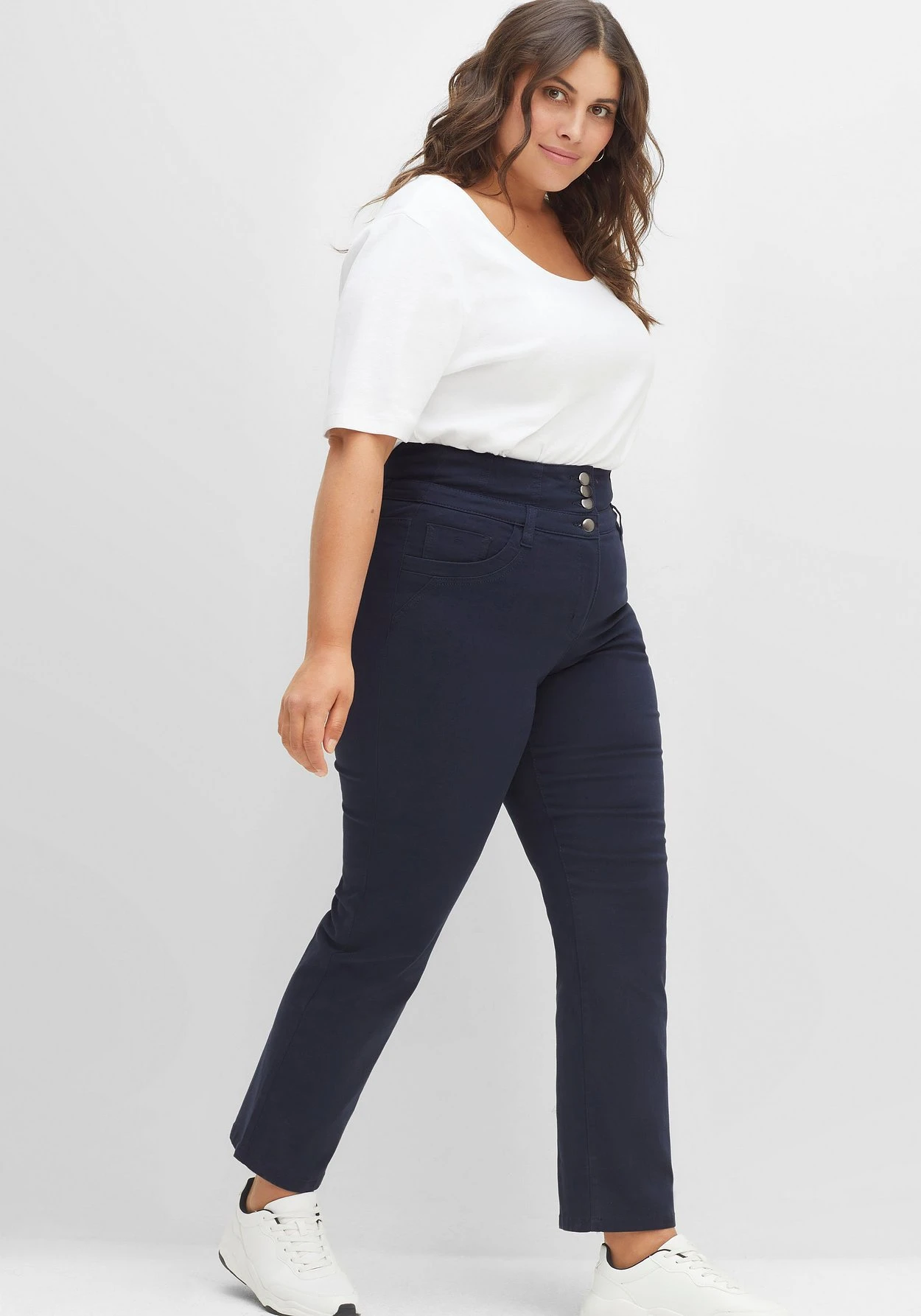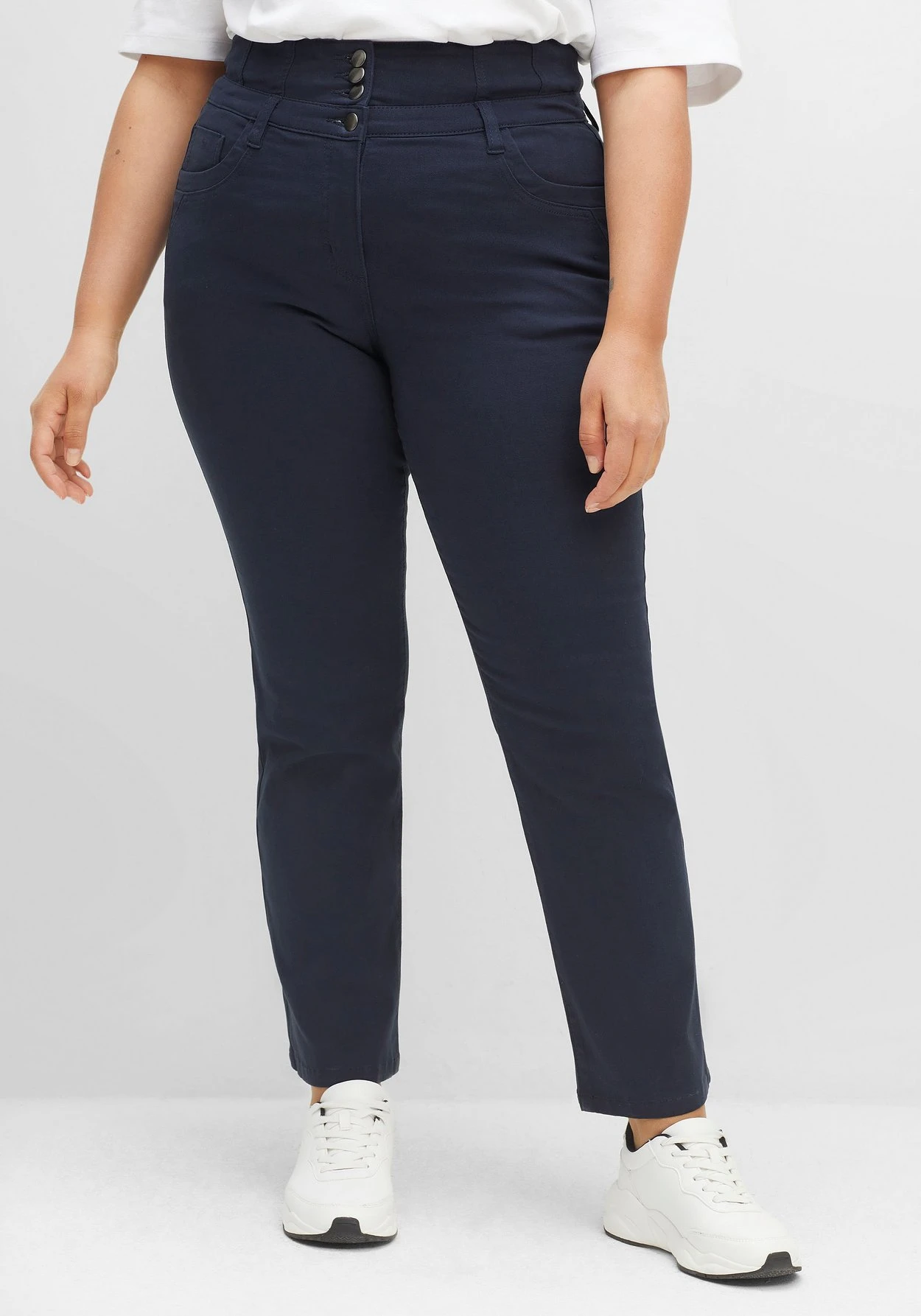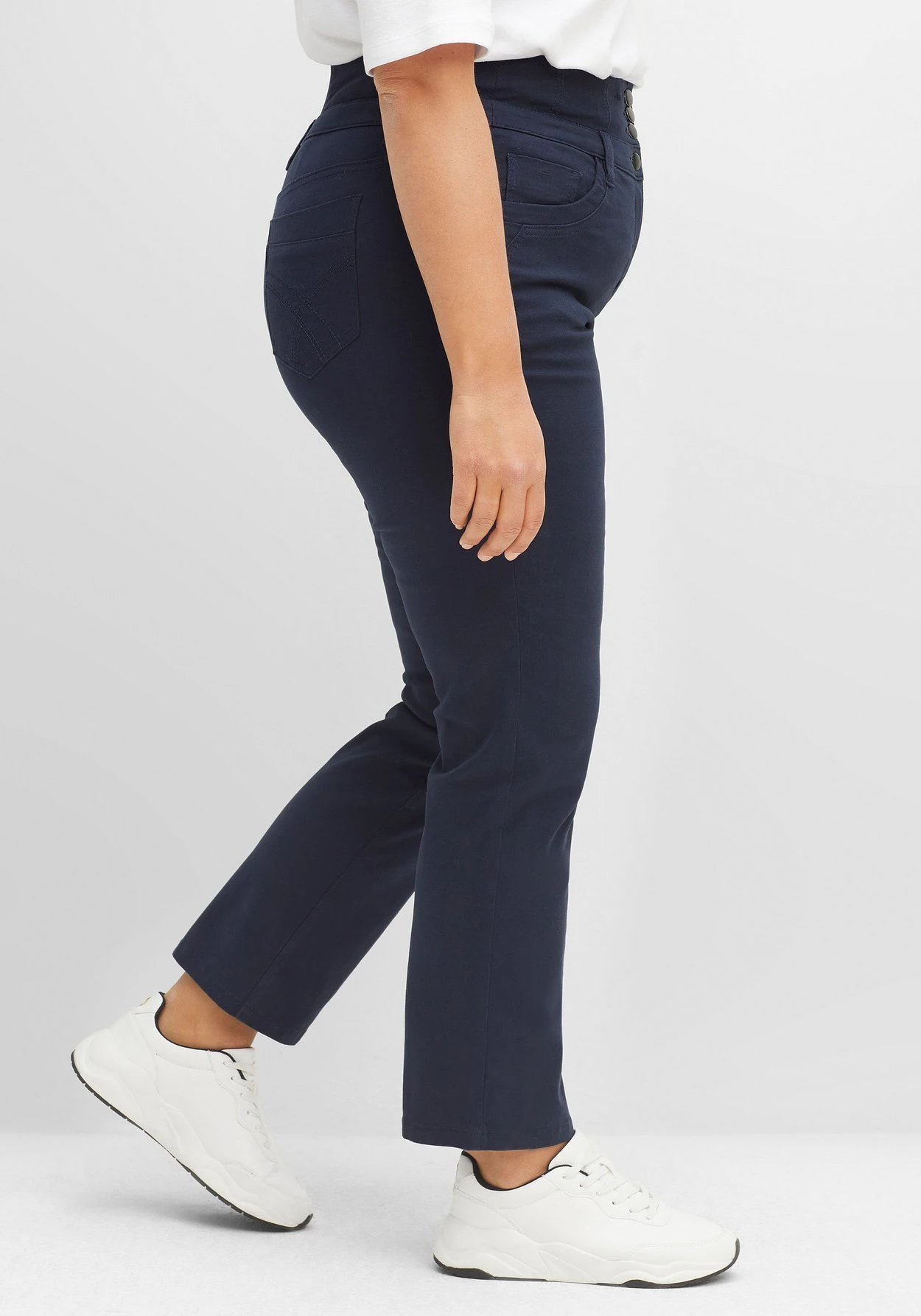 Gerade Hose in Curvy-Schnitt ANNE für Frauen mit schmalerer Taille, breiteren Hüften und etwas Bauch. Durch die fünf markanten Verschlussknöpfe wirkt der breite Hosenbund besonders dekorativ, hinten sorgt ein Stretcheinsatz für maximale Bequemlichkeit. Die Hose ist in 5-Pocket-Form gearbeitet und besitzt Gürtelschlaufen am Bund.