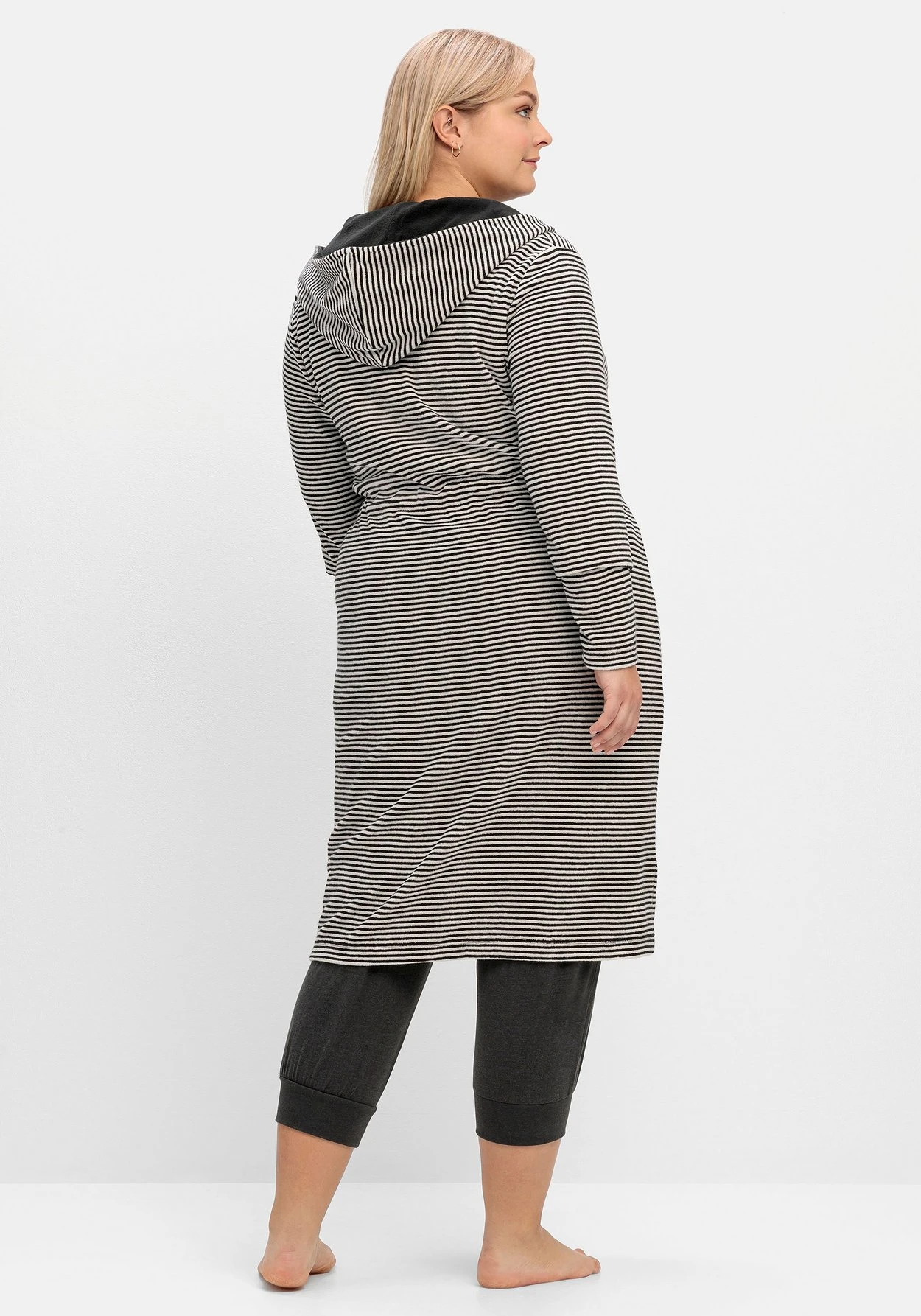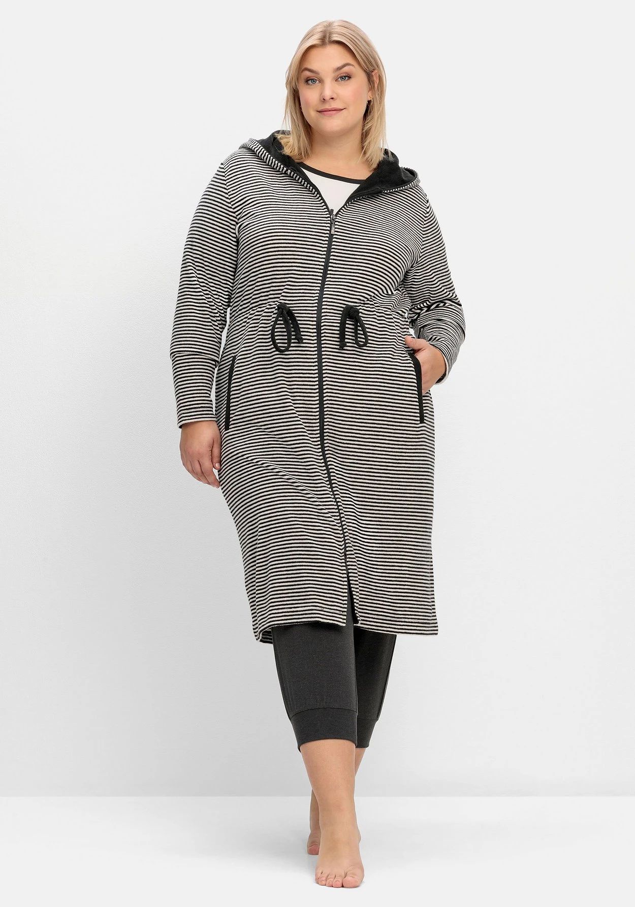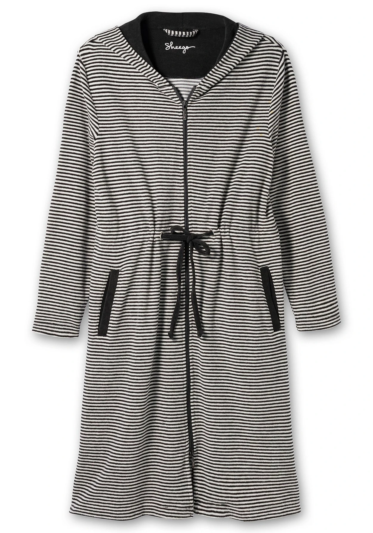 Bademantel mit Kapuze und Tunnelzug. Zu den charmanten Ringeln setzen unifarbene Details modische Akzente. So sind Kapuzeninnenseite, Einschubtaschen und das Bindeband in der Taille kontrastfarben gehalten, der praktische Zwei-Wege-Reißverschluss gibt Bewegungsfreiheit am Saum.