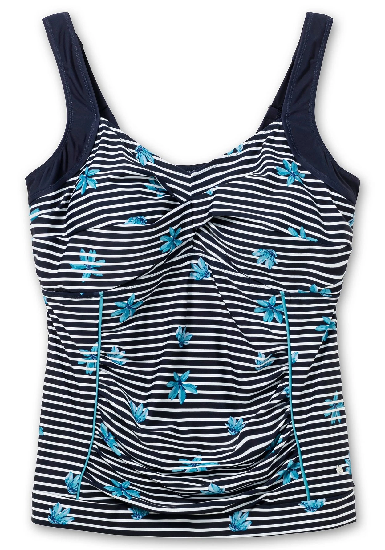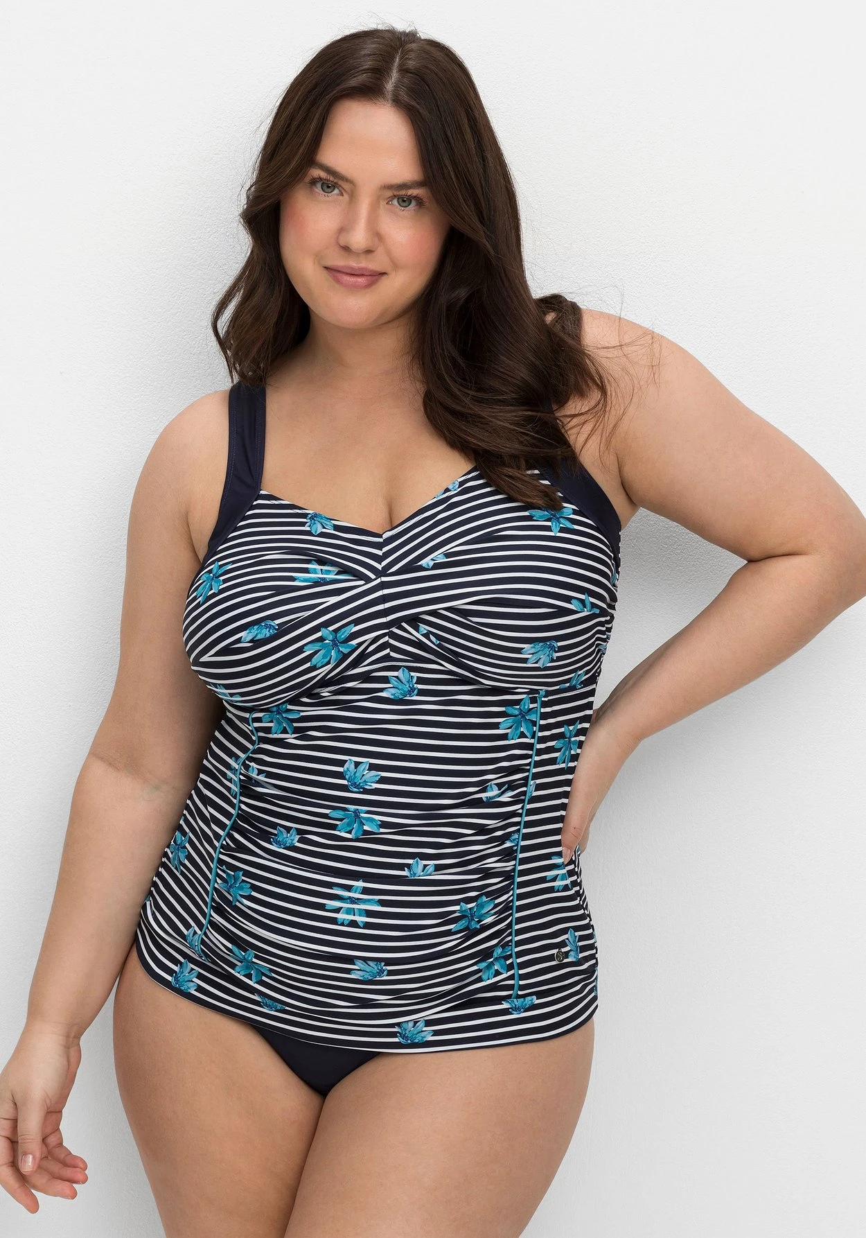 Tankini-Top im Mix aus Streifen und Blumen. Die raffiniert gewickelte Optik und die unifarbenen Kontrastpartien sind dazu eine modische Ergänzung. Wattierte Softcups und ein Unterbrustgummi geben der Brust Halt, breite verstellbare Träger sorgen für passgenauen Tragekomfort. Dank des Mix & Match-Charakters lassen sich dazu verschiedene Hosen aus der sheego Badekollektion kombinieren.