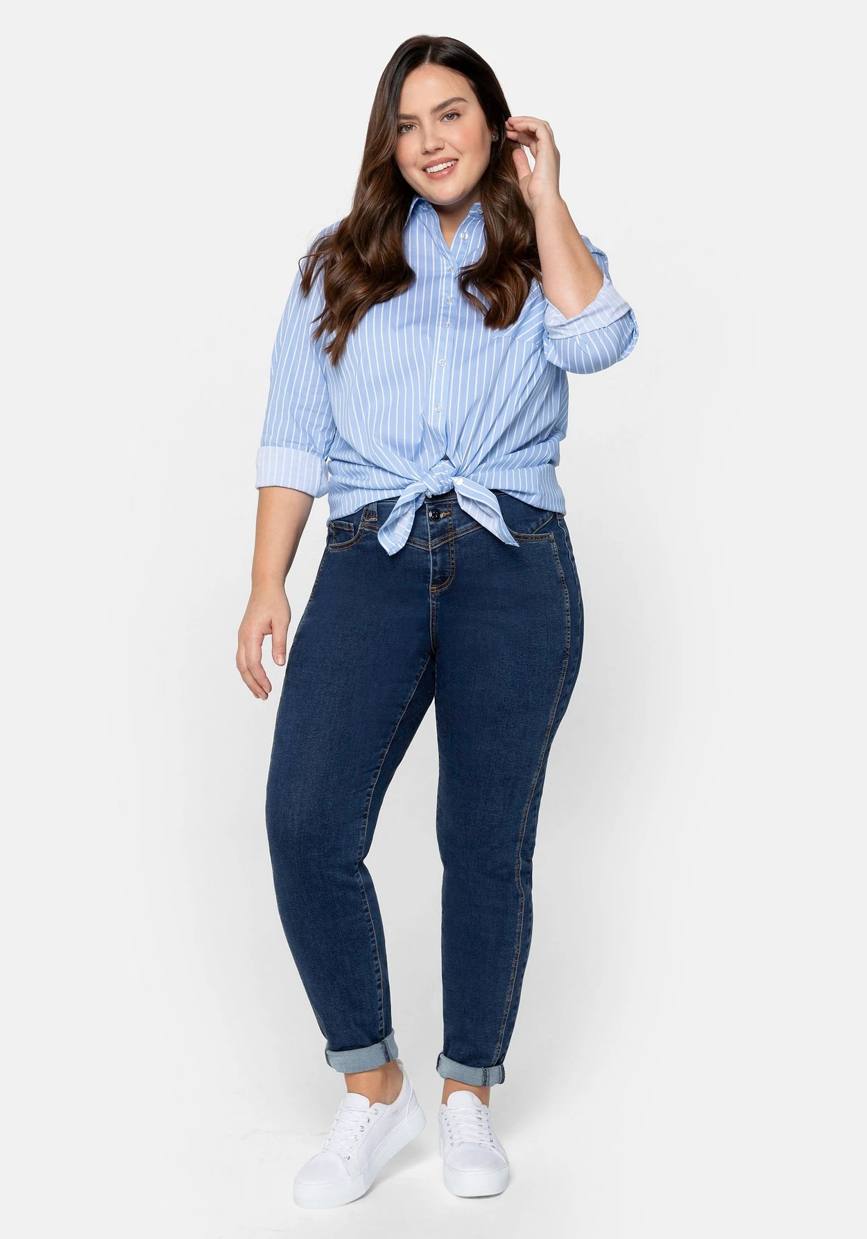 Die elastische Denimqualität trägt sich durch den hohen Baumwollanteil besonders angenehm. Mit dem Kauf dieses Produkts unterstützt du außerdem die Arbeit von „Cotton made in Africa“. Die Initiative leistet Hilfe zur Selbsthilfe durch Handel und will so die Lebensbedingungen afrikanischer Kleinbauern verbessern. Bei REPREVE® handelt es sich um eine aus recycelten Materialien entwickelte Polyesterfaser, die Plastikflaschen enthält. Das schont Ressourcen, Umwelt und Klima. sheego cares!