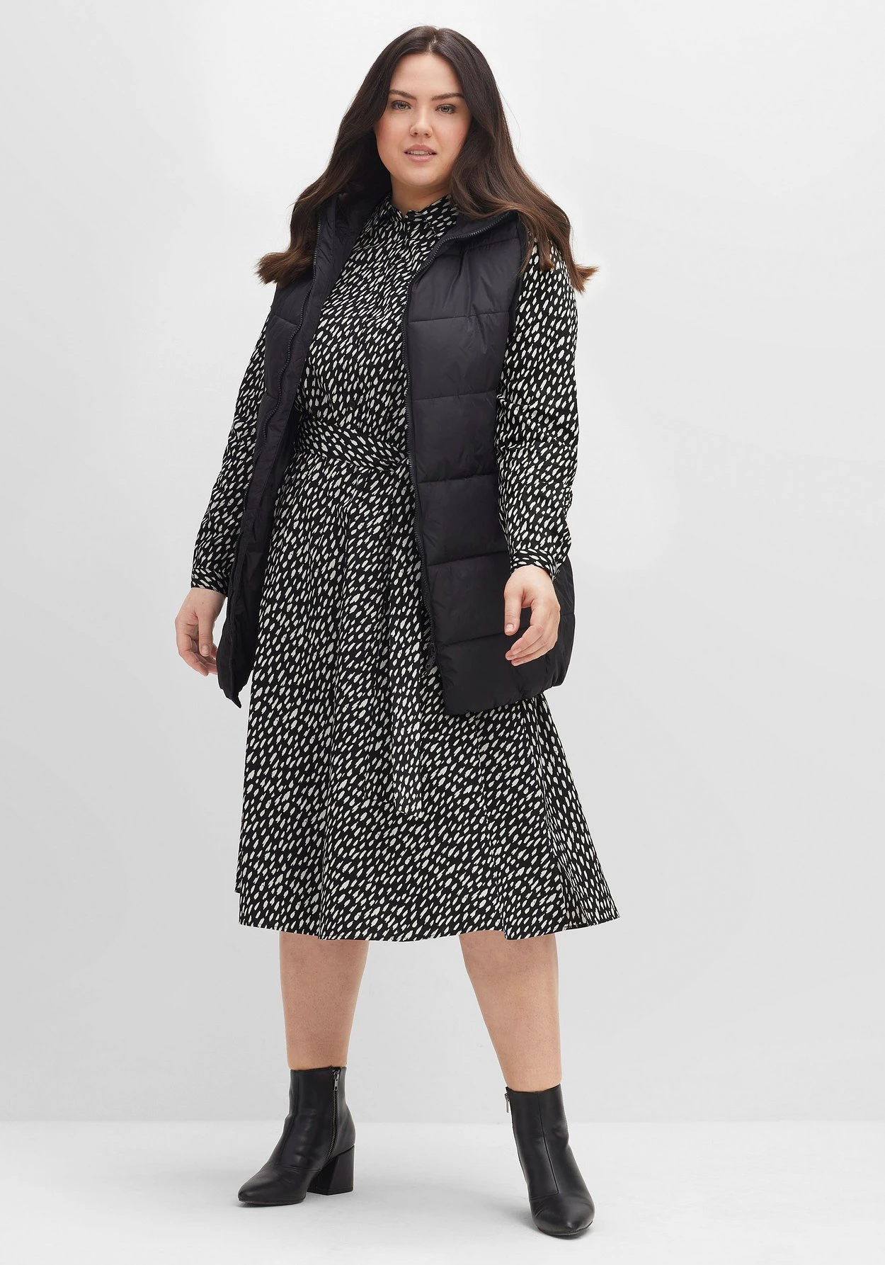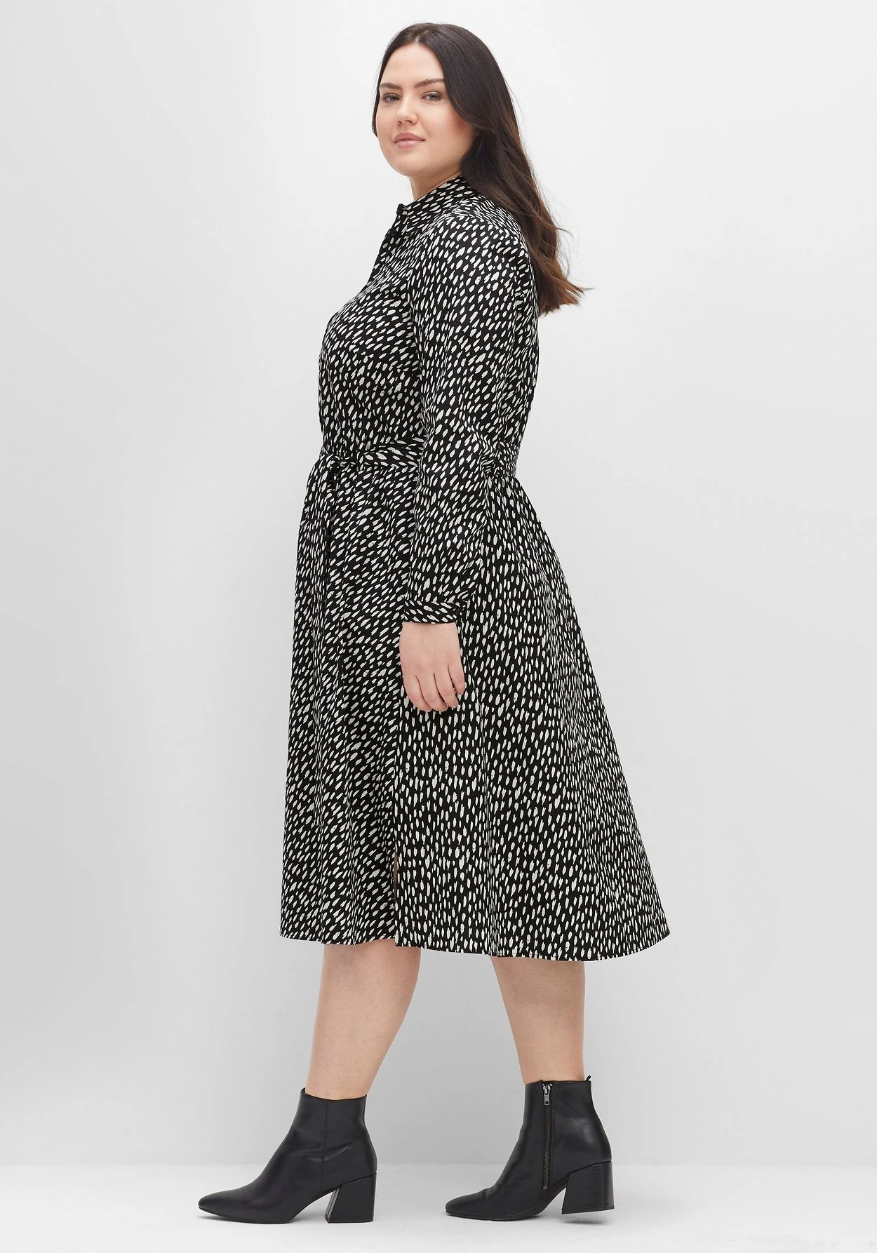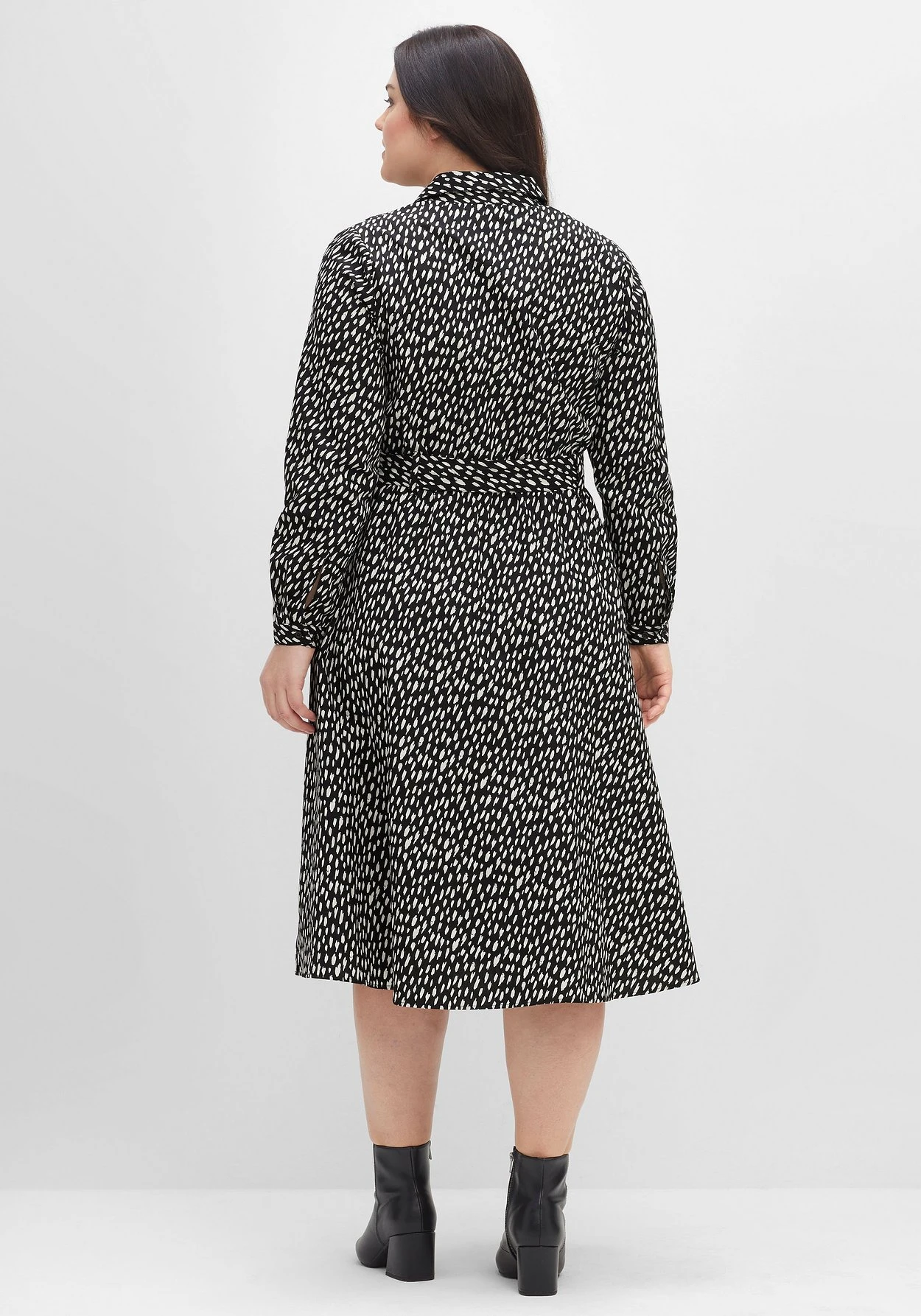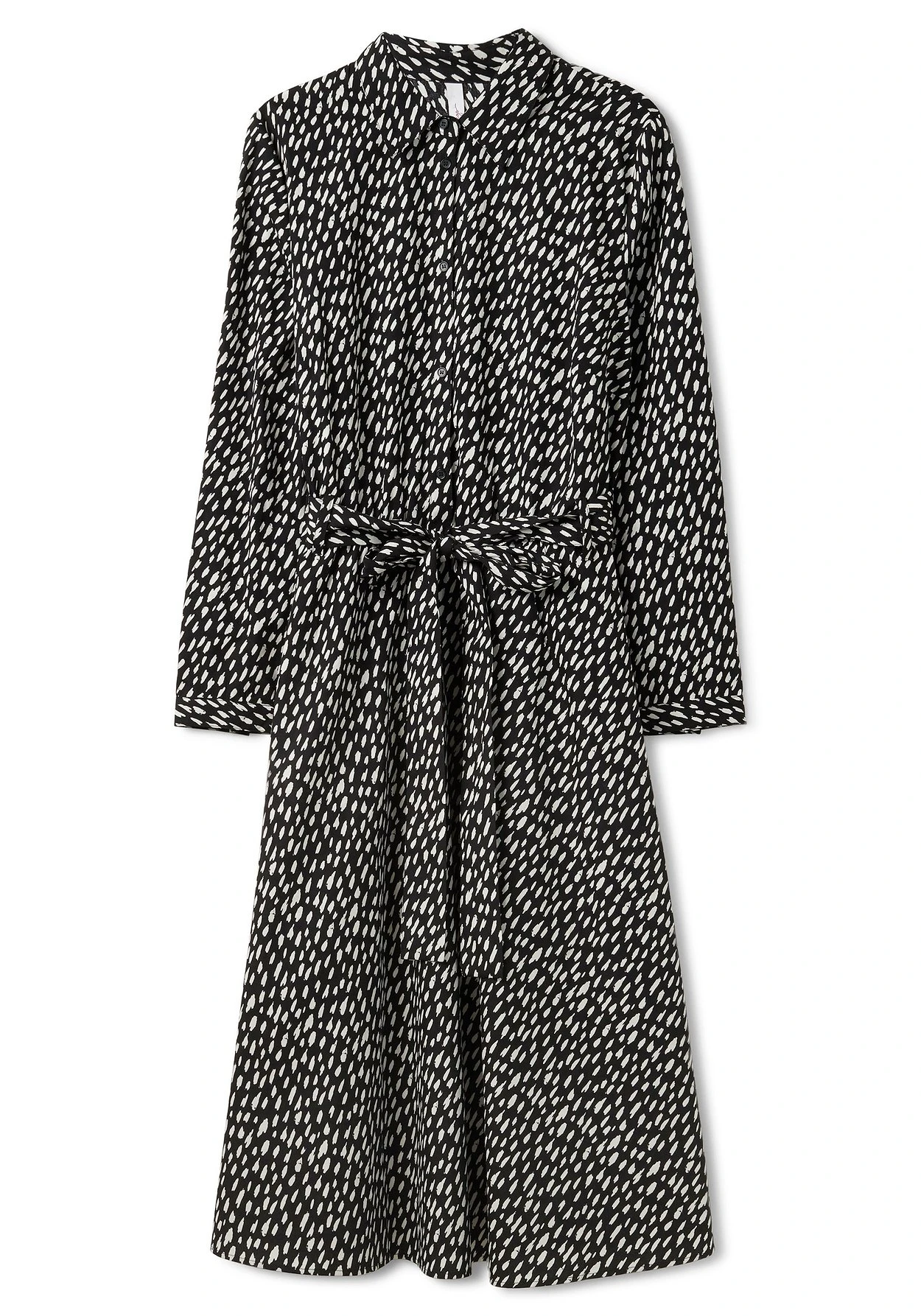 Hemdblusenkleid mit Tupfen-Alloverprint. Es ist mit typischen Stilelementen wie Hemdkragen, Knopfleiste und weitenverstellbaren Manschettenärmeln gestaltet. Die Taille wird durch einen Gummizugbund und einen separaten Bindegürtel lässig betont, das Rockteil fällt weit schwingend und sorgt so für eine schöne Silhouette. Die Knopfleiste verläuft bis zur Körpermitte und überlässt es dir, wieviel Dekolleté du zeigen möchtest.