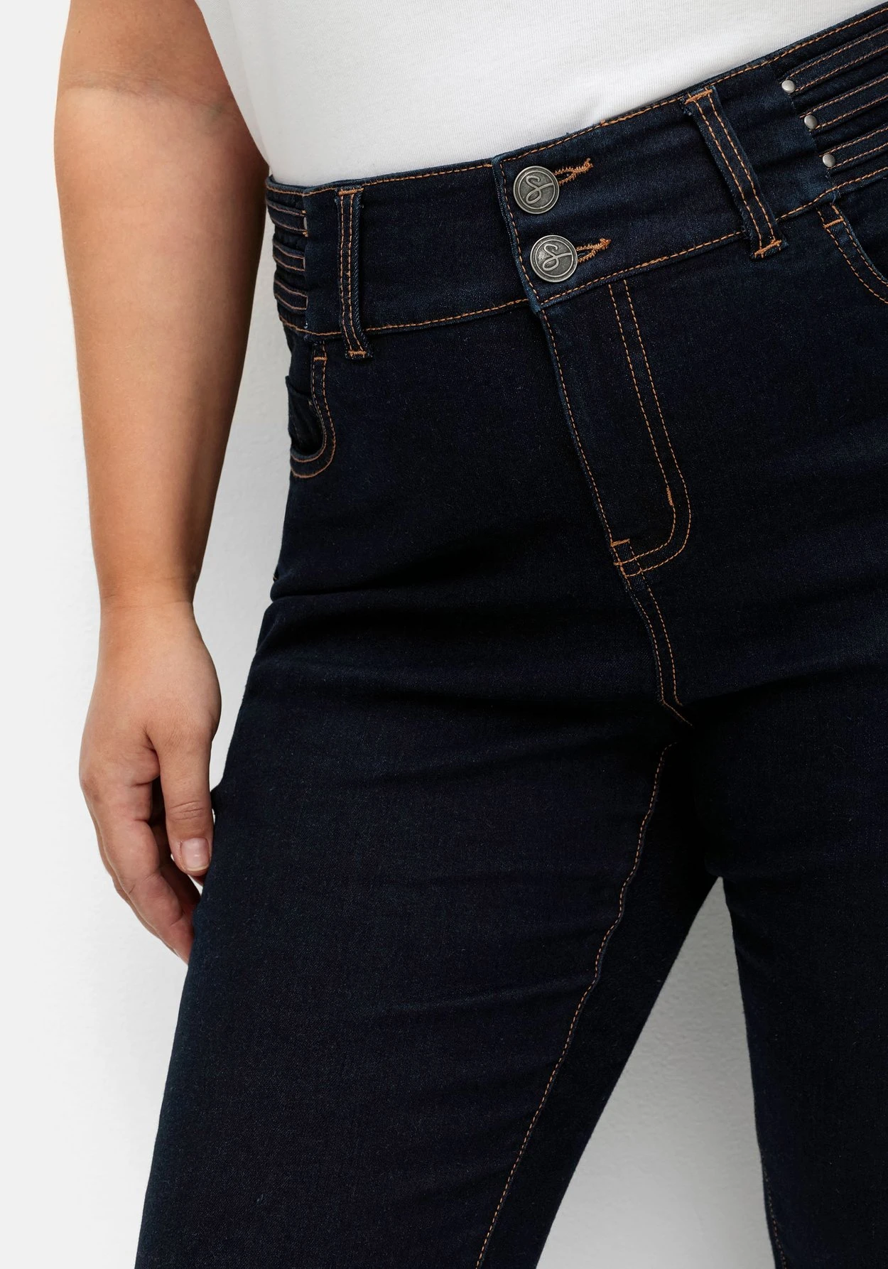 Skinny Jeans mit Push-up-Nähten am Po. Sofort ins Auge fällt der hohe, mit Dekobändern und Nieten, Gürtelschlaufen sowie Doppelknopf aufwendig gestaltete Bund. Hinten formen die Push-up-Nähte einen schönen Po. Die cleane, gepflegt wirkende Optik und die klassischen fünf Taschen ergänzen den Look.