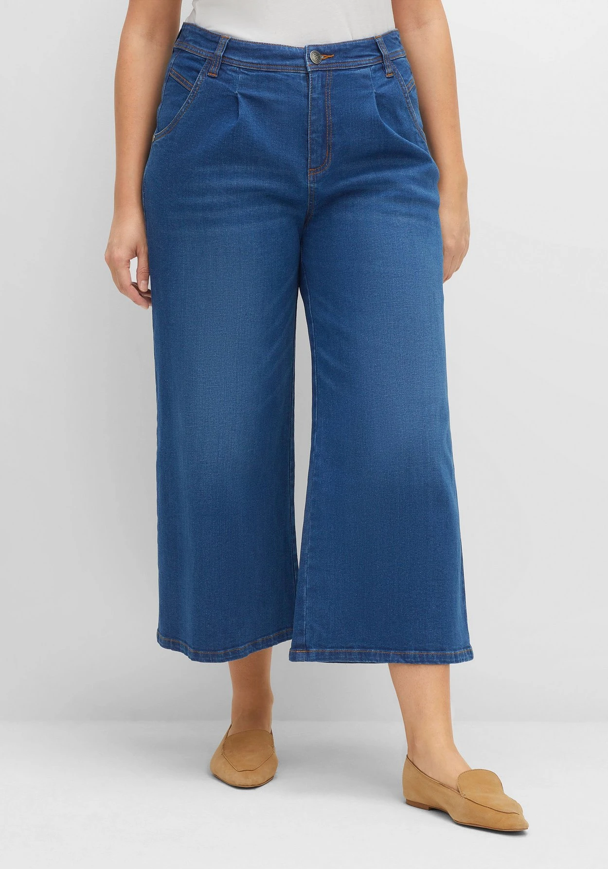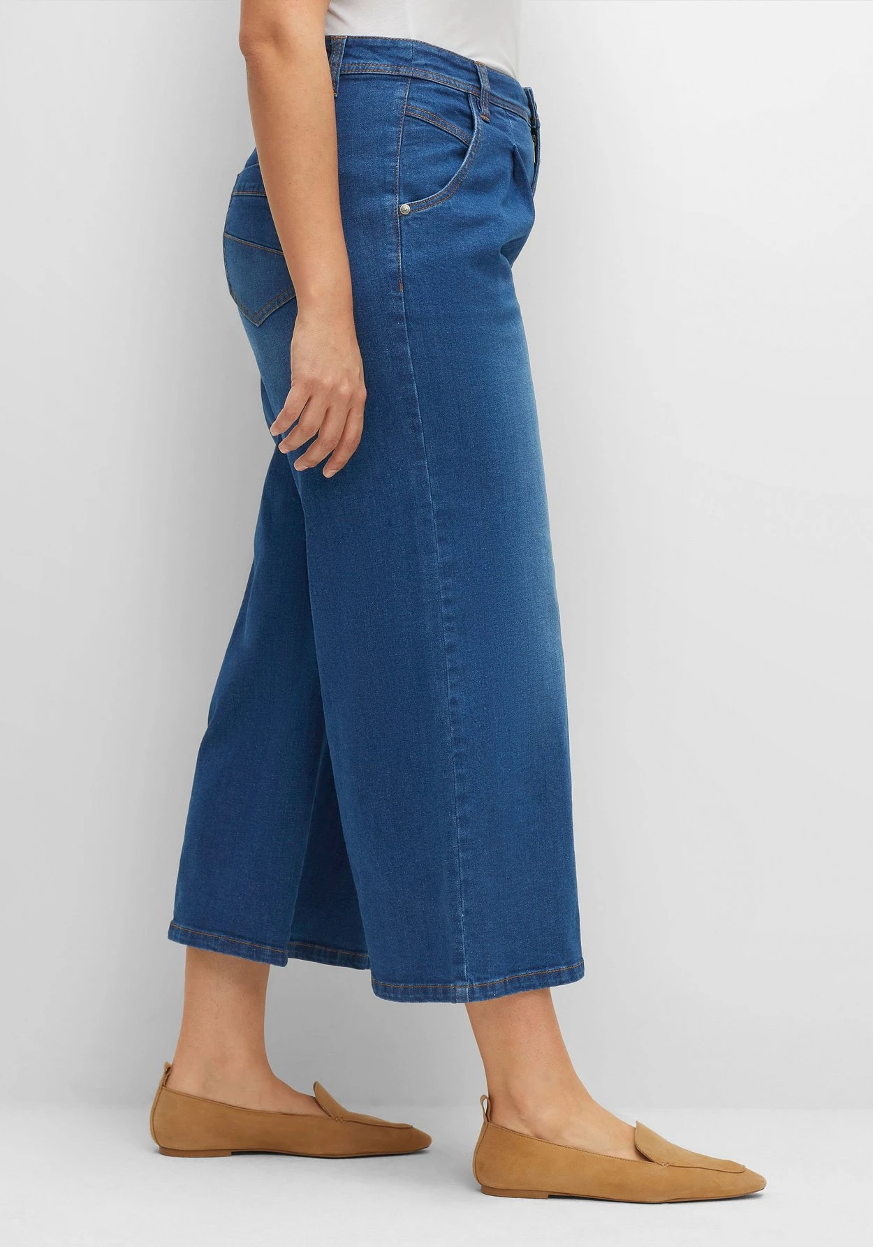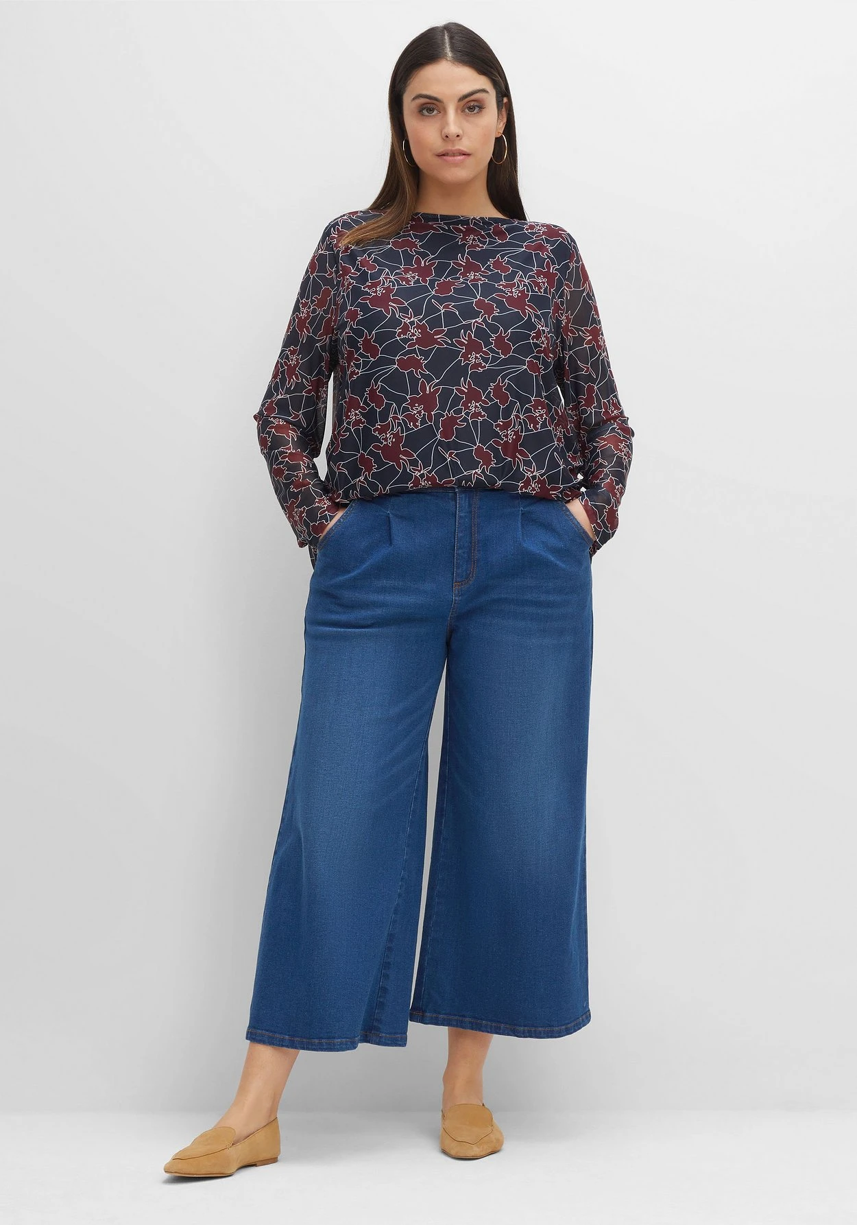 Für eine sehr moderne und zugleich feminine Silhouette sorgt der weite, wadenlange Culotte-Schnitt. Er trägt sich bequem und schmeichelt auch kräftigeren Beinen.