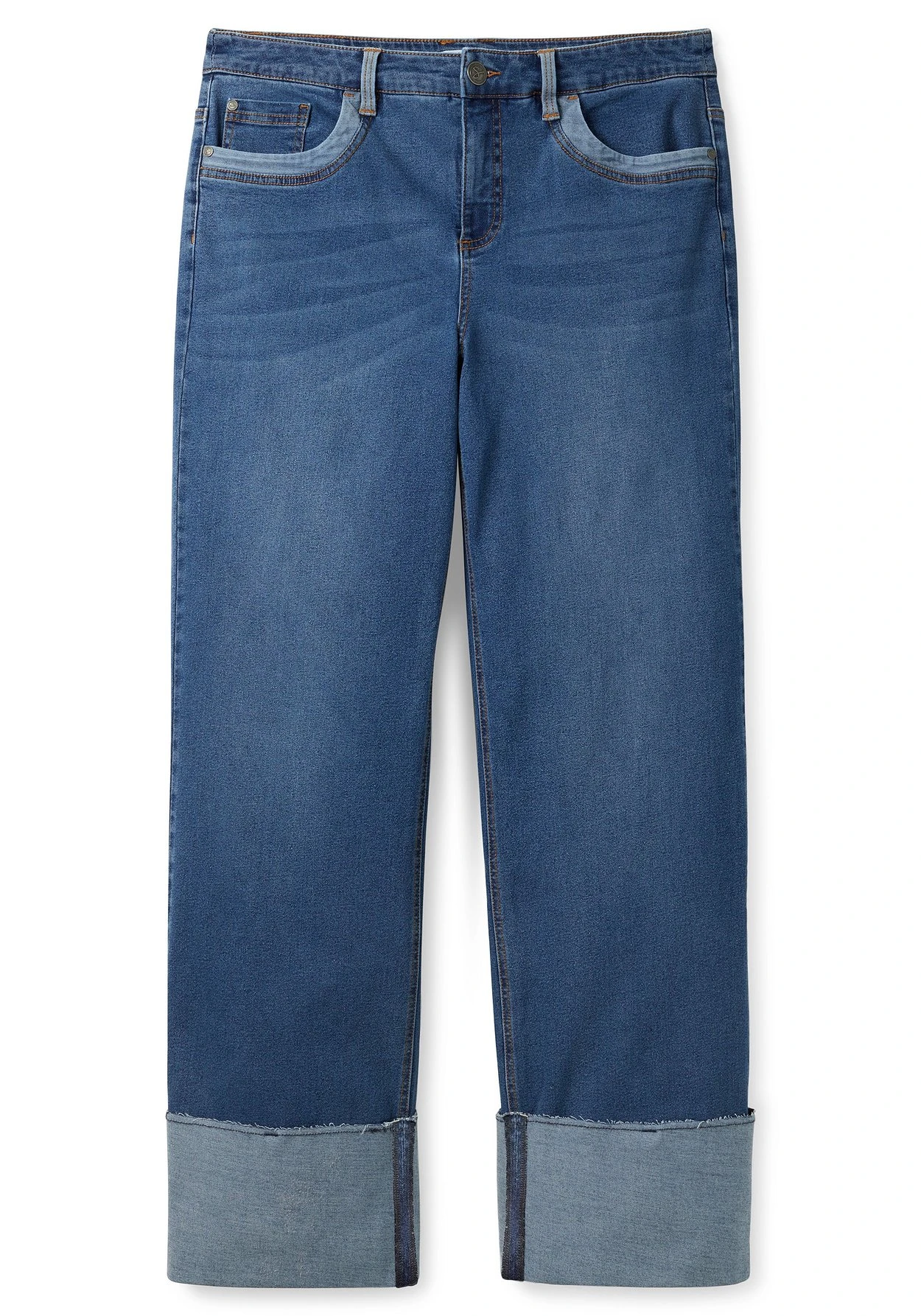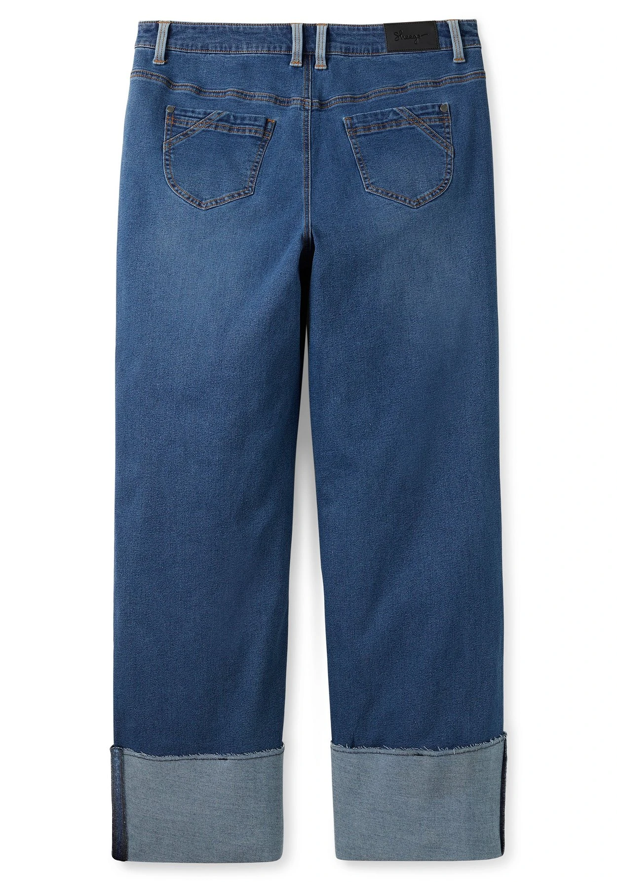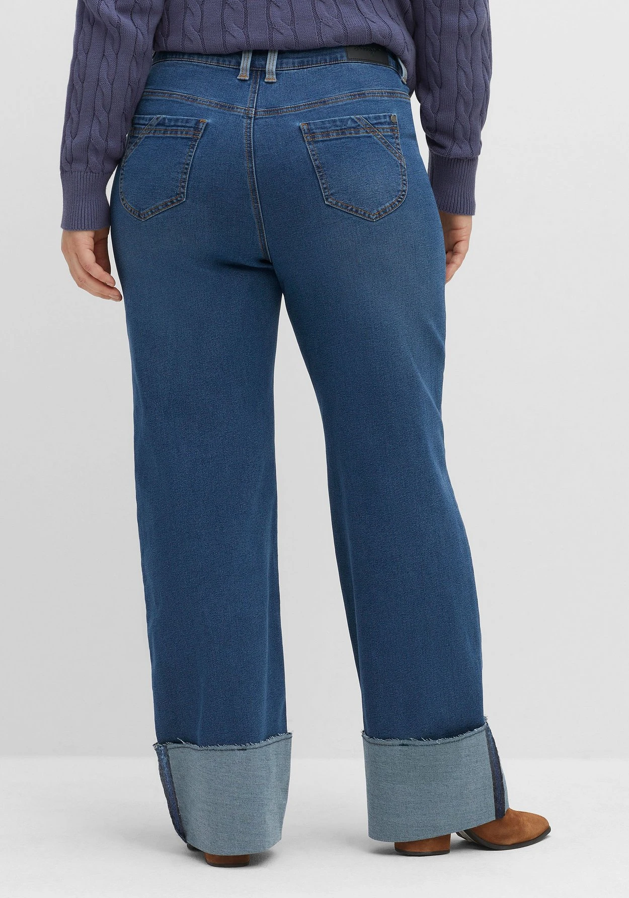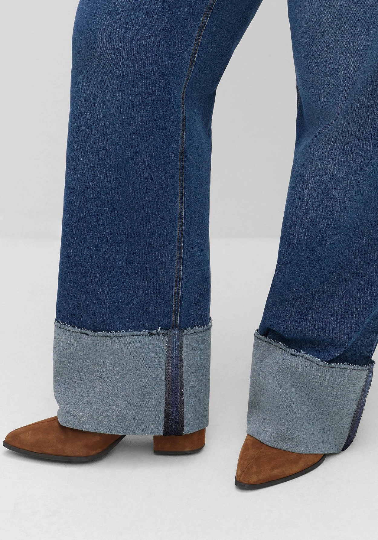 Jeans ELLA mit extraweitem Beinverlauf, für Frauen mit sehr kräftigen Oberschenkeln und Waden. Der auffällig breite, fixierte Umschlag am Saum sorgt für den lässigen Auftritt. Dazu kommen kontrastfarbene Details an Taschen und Gürtelschlaufen, Catfaces sowie eine individuelle Waschung. Die Passe hinten sorgt für den optimalen Sitz.