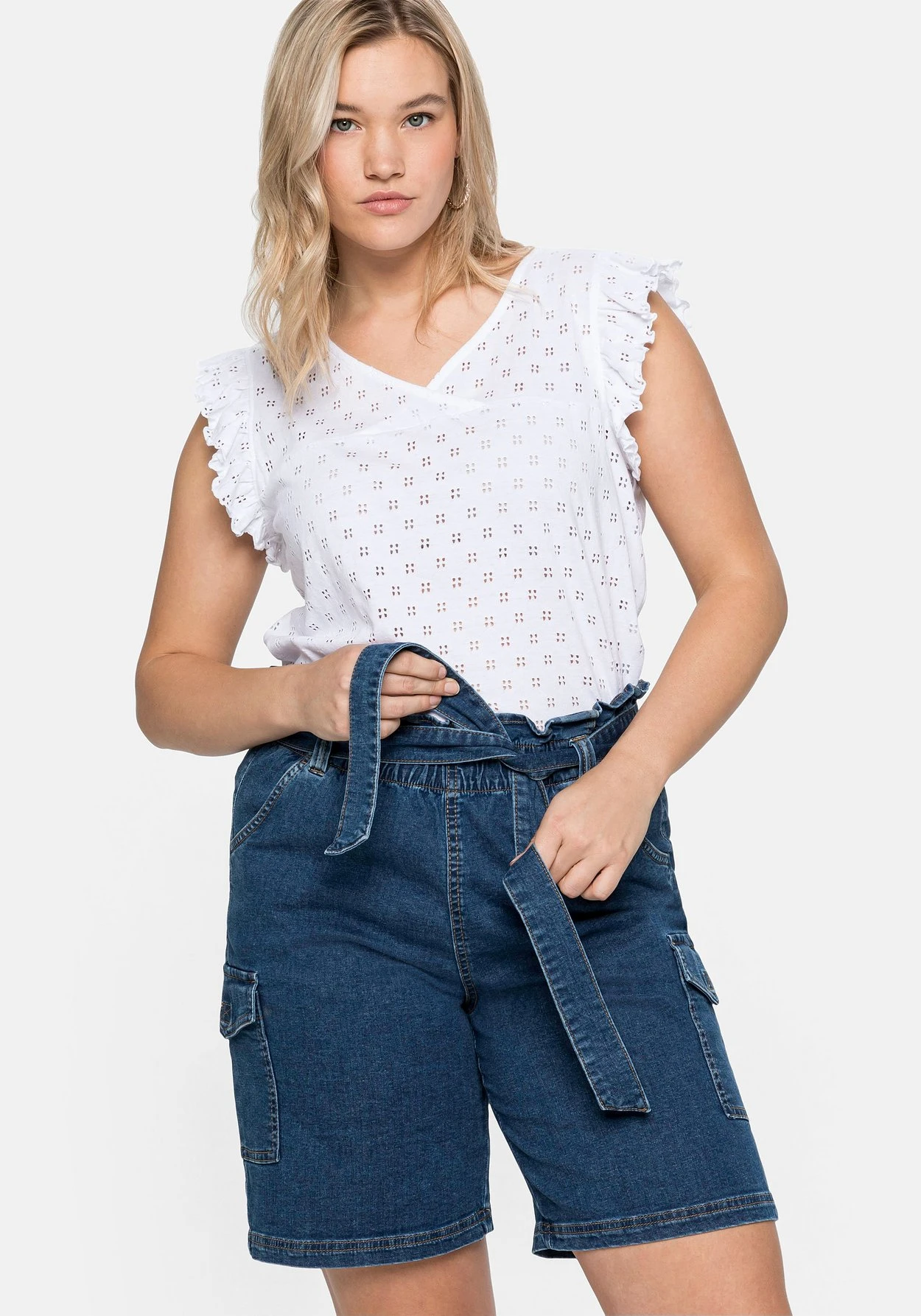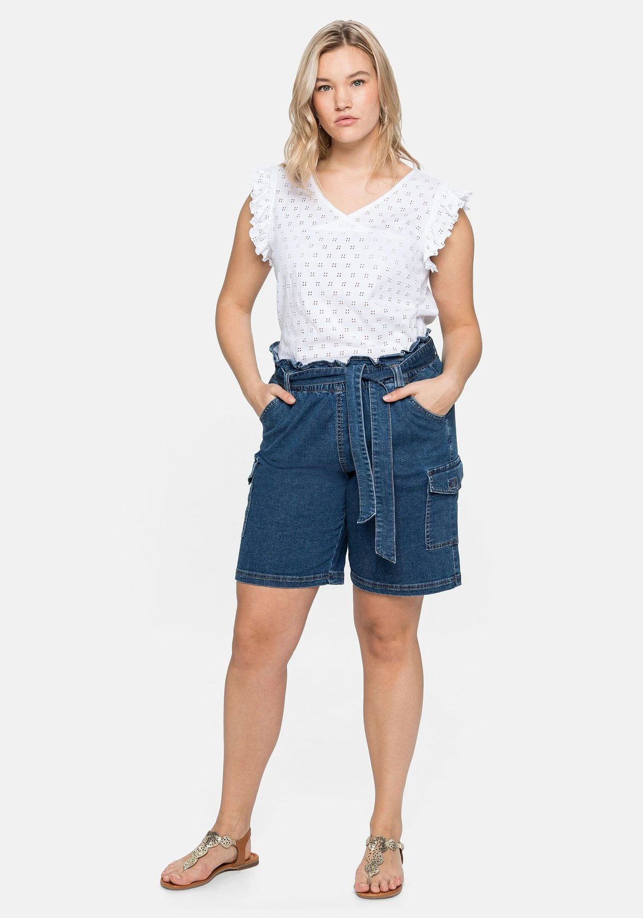 Jeans-Shorts in modischer Paperbag-Form. Der markante, hochgezogene High-Waist-Bund setzt trendstarke Akzente, ein Gürtel betont dabei feminin die Taille. Lässig im Cargo-Stil zeigen sich die seitlich auf den Hosenbeinen aufgesetzten Taschen. Diese werden durch Eingrifftaschen sowie Gesäßtaschen mit dezenter Stickerei praktisch ergänzt. Eine individuelle Waschung und Kontrastnähte runden den gelungenen Sommerlook modisch ab.