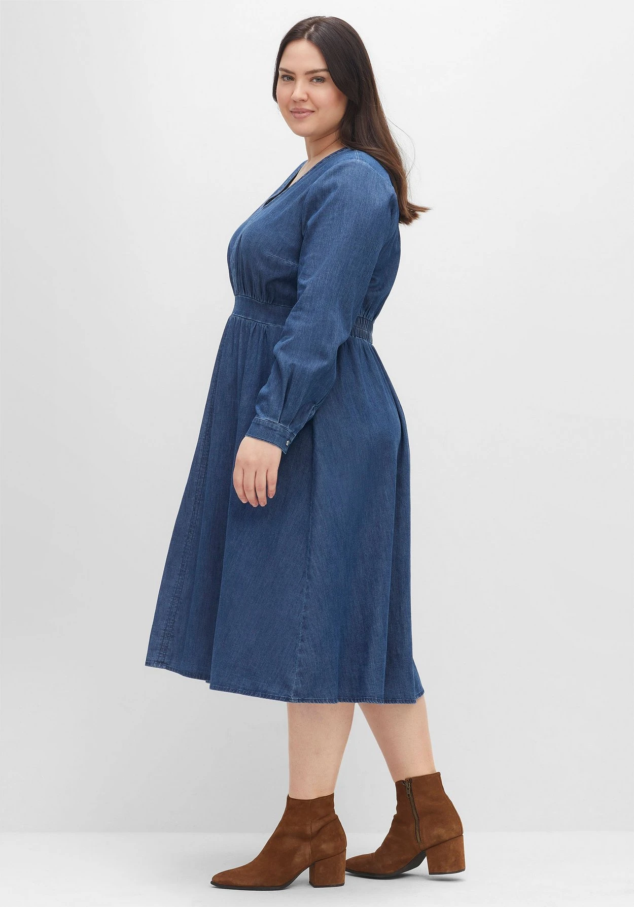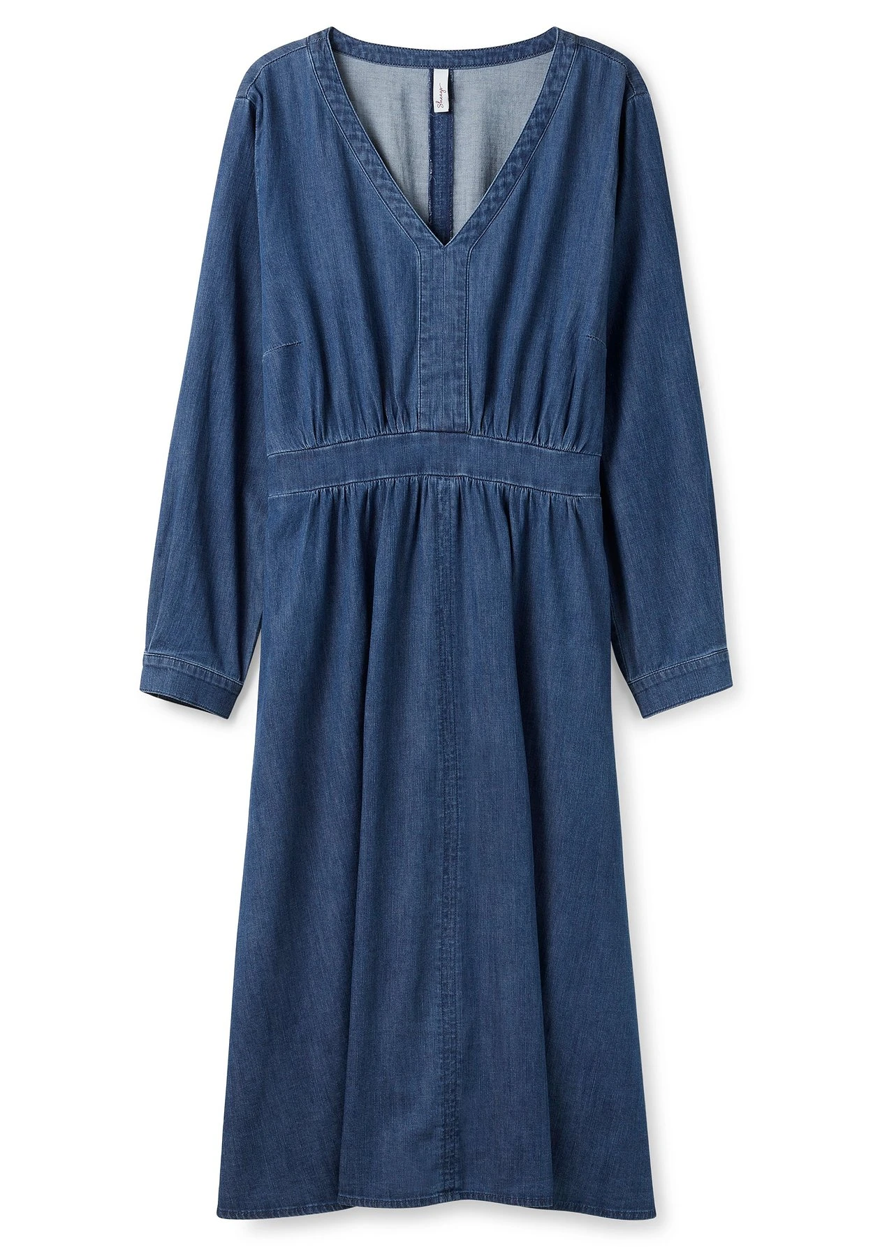 Kleid aus Denim. Der V-Ausschnitt wird durch eine Blende dekorativ betont, der lange Arm endet mit Manschette, Druckknopf und Schlitz. Besonders feminin wirkt die Silhouette durch die angekräuselte Blende auf Taillenhöhe, die dank Gummizugbund vorn und hinten perfekt sitzt.
