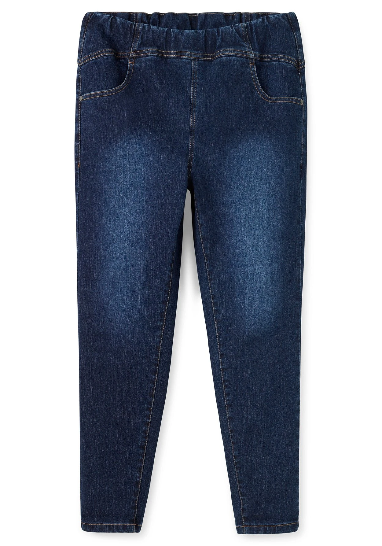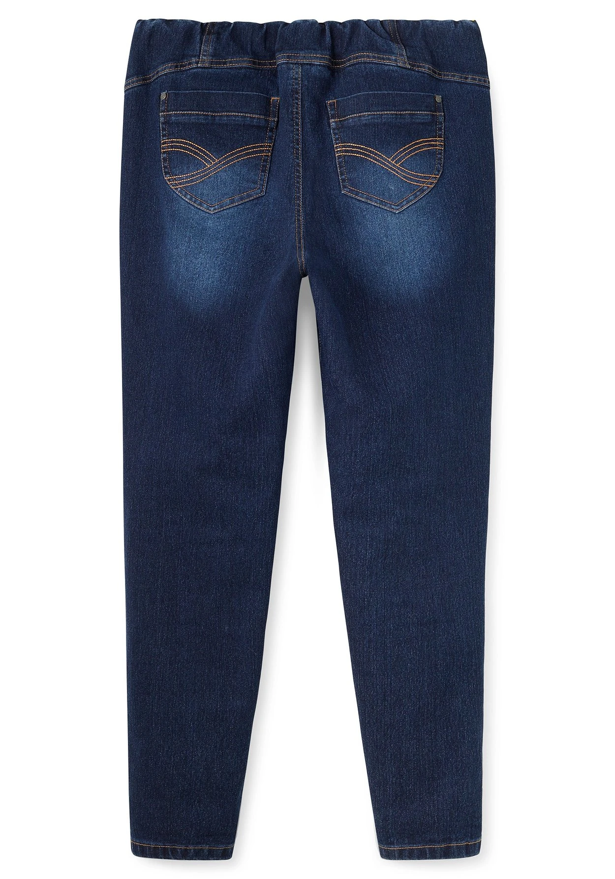 Jeggings in individueller Waschung. Charakteristisch ist hier der breite Gummibund, der die Taille in den Fokus rückt. Ziernähte vorn und bestickte, aufgesetzte Taschen hinten sorgen für die typische Jeanshosen-Optik.