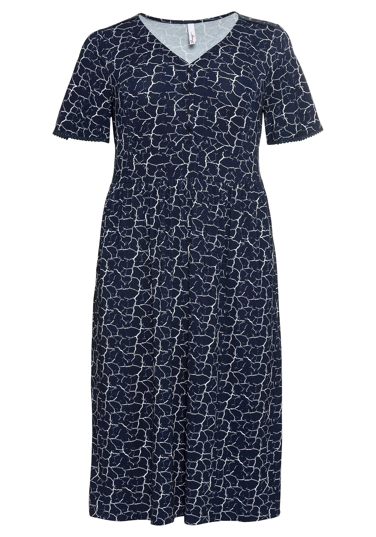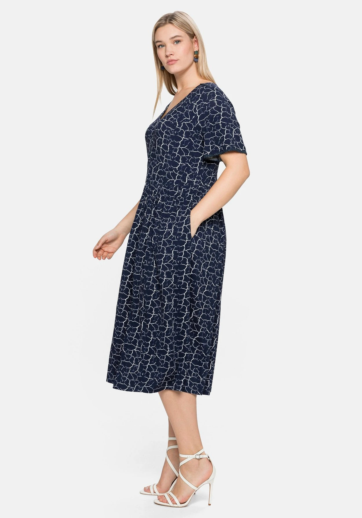 Jerseykleid mit Taschen. Der V-Ausschnitt geht in eine Knopfleiste über, an Schulterpasse und Ärmelsaum dient ein dezenter Spitzenbesatz als feminines Detail. Der grafische Alloverprint gibt dem Kleid seine moderne Optik.