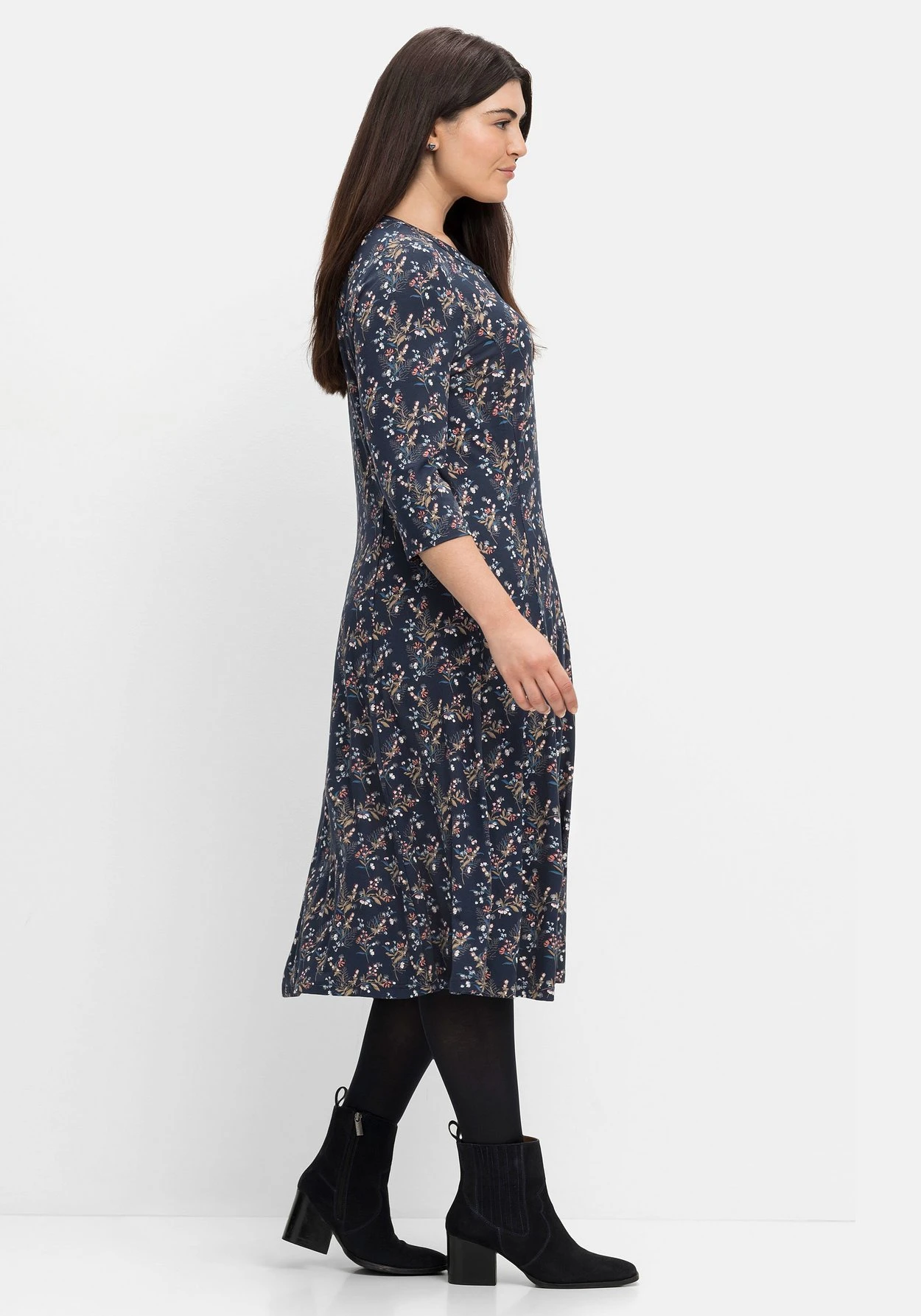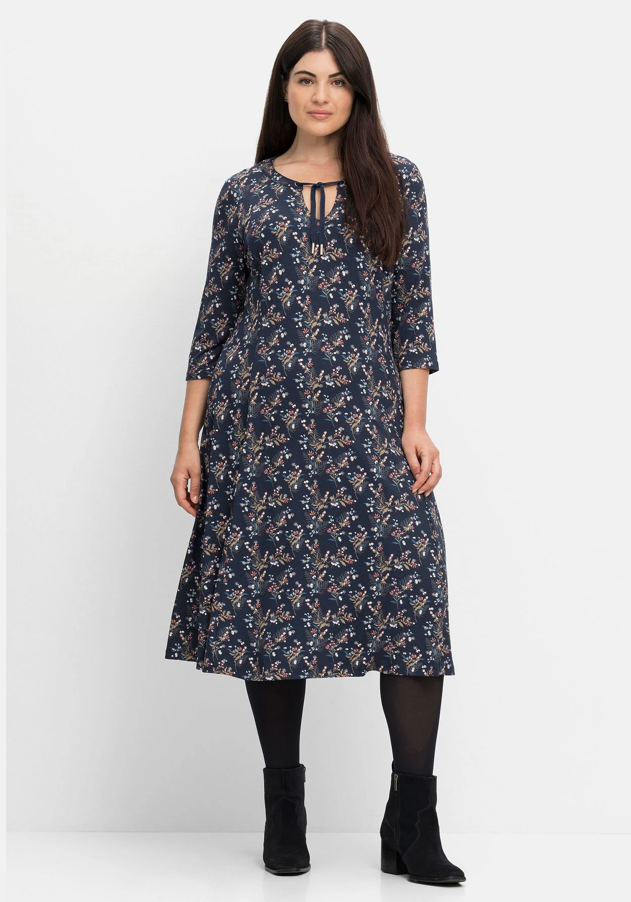 Jerseykleid mit Blumendruck. Der mit V-Cut und Bindeband raffiniert gestaltete Ausschnitt und die 3/4-langen Ärmel unterstreichen den femininen Look. Die taillierte Passform wird durch die Wiener Nähte schmeichelnd betont, darunter schließt sich ein ausgestellter Rock an.