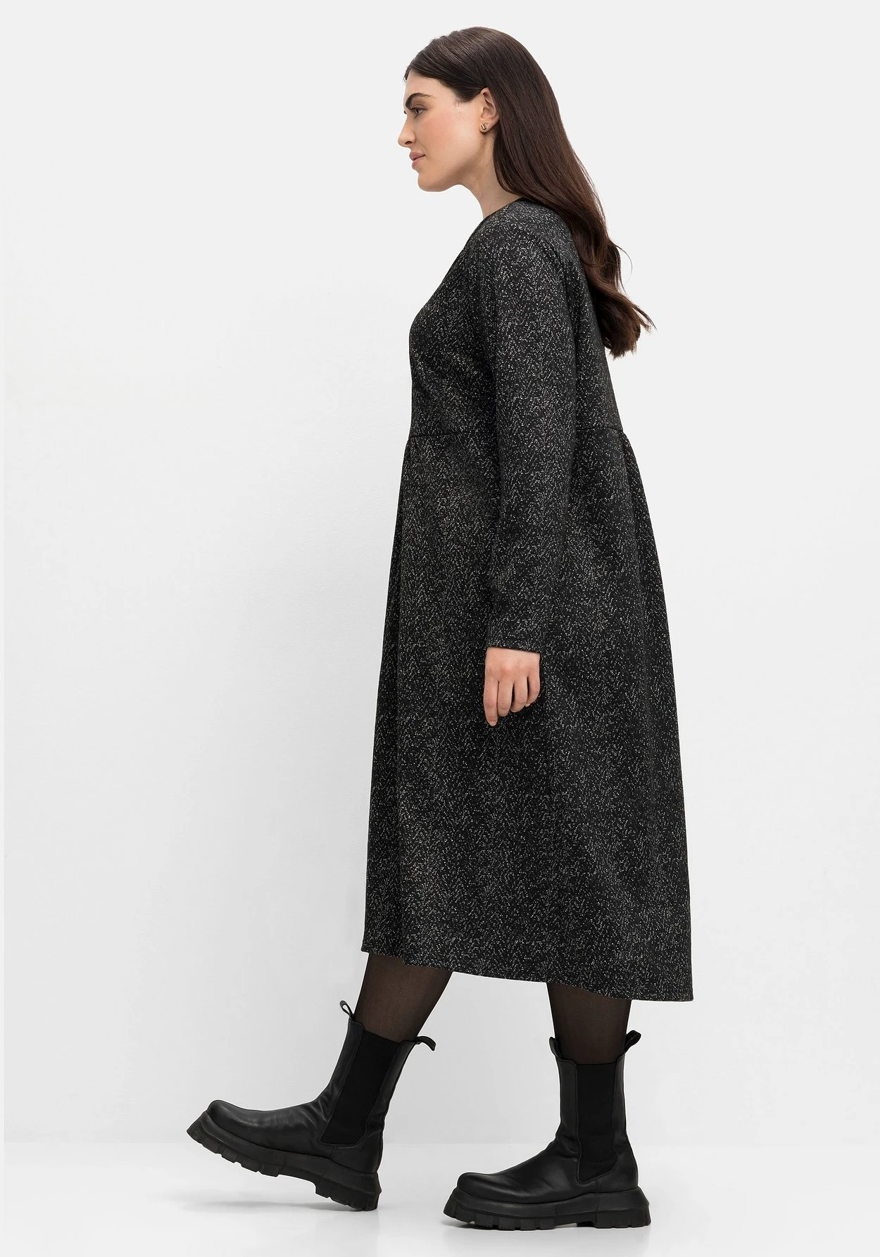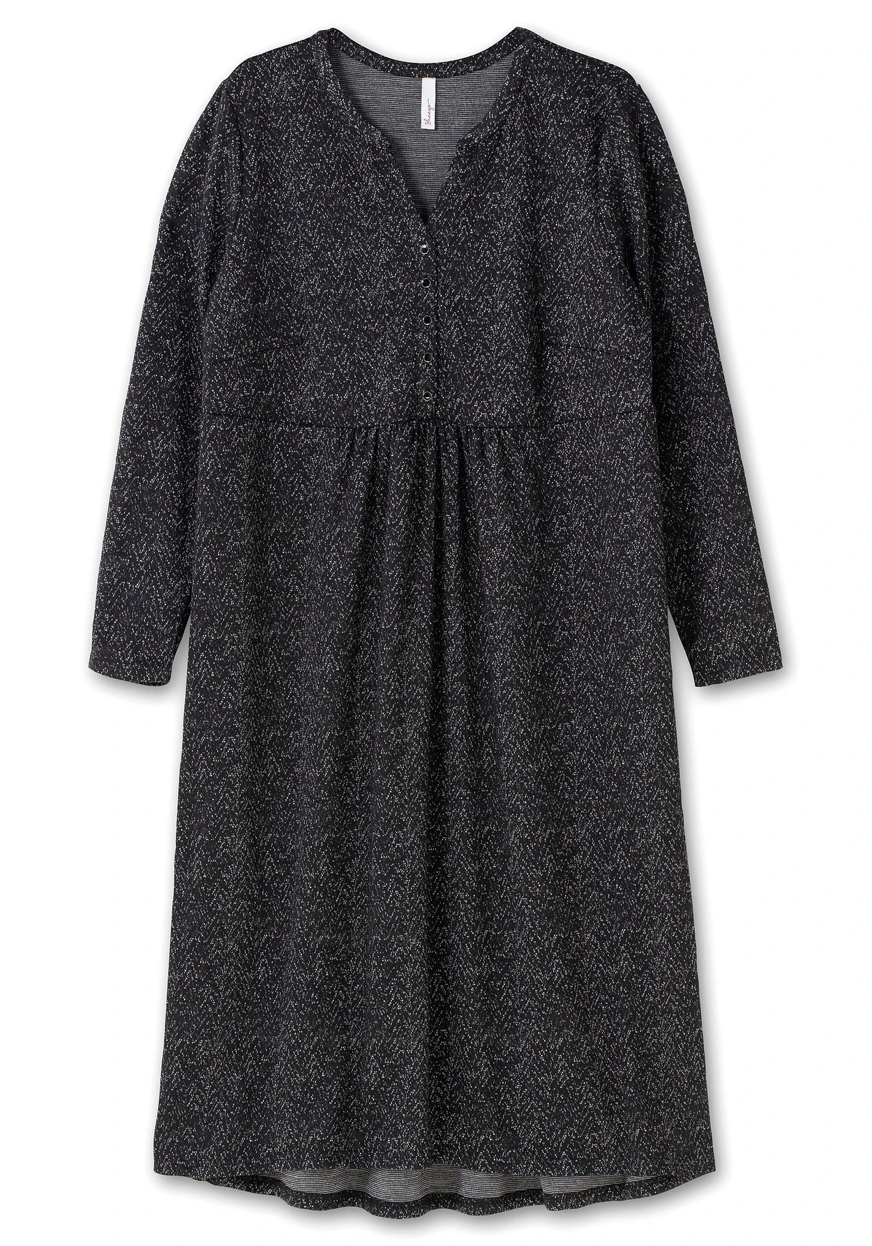 Jerseykleid mit Rundhals, V-Ausschnitt und kurzer Knopfleiste. Die erhöhte Taillennaht ist leicht gekräuselt und lässt das Rockteil feminin schwingen. Dazu ist das Rückenteil leicht verlängert und bedeckt schmeichelnd die Waden. Die Salz-und-Pfeffer-Optik macht das Kleid zu einem stilvollen Begleiter für modische Stylings.