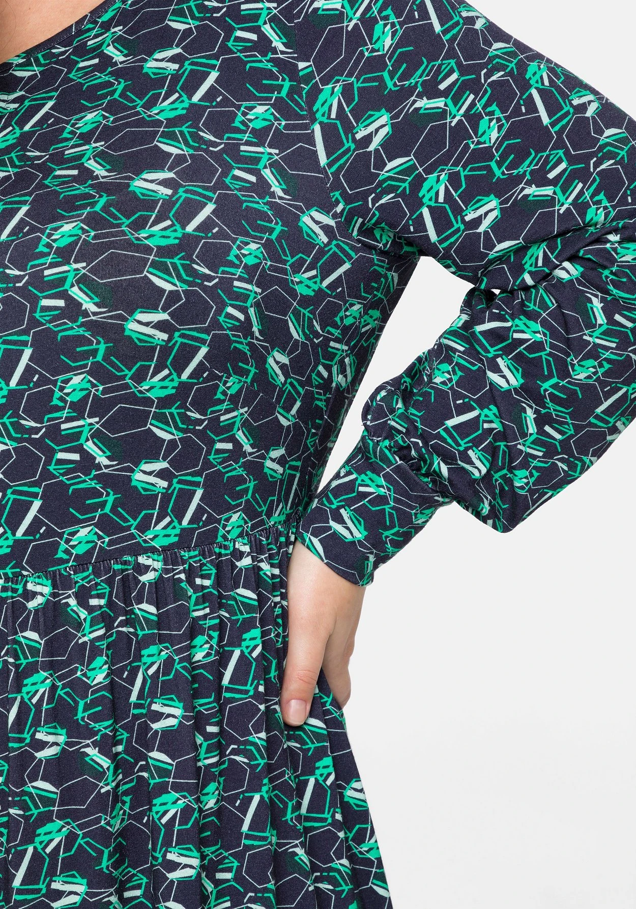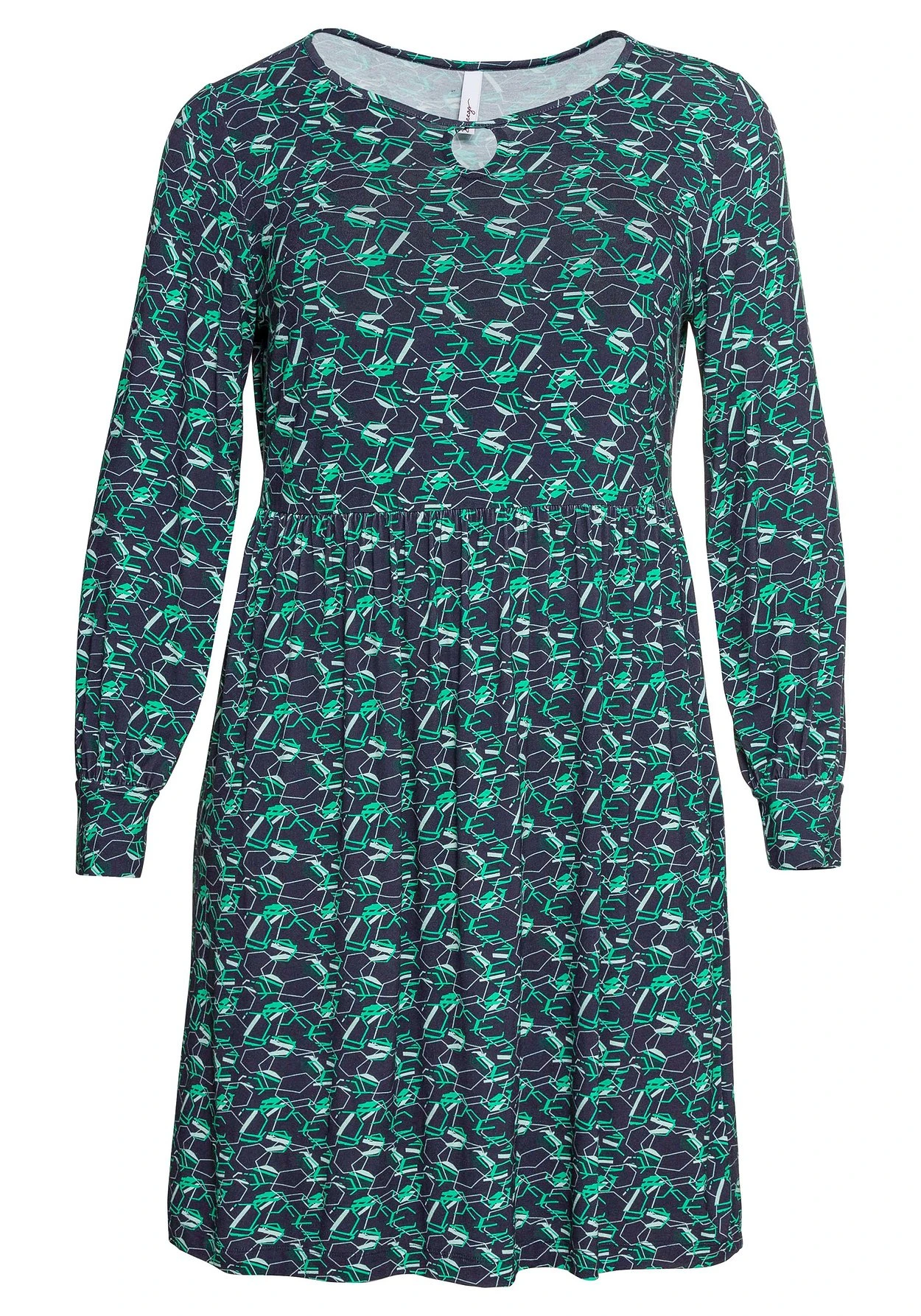 Jerseykleid mit grafischem Alloverdruck. Raffiniertes Detail ist der Schlüsselloch-Ausschnitt am Rundhalsausschnitt. Das Kleid besitzt lange Ärmel und ist in kniefreier Länge gestaltet.