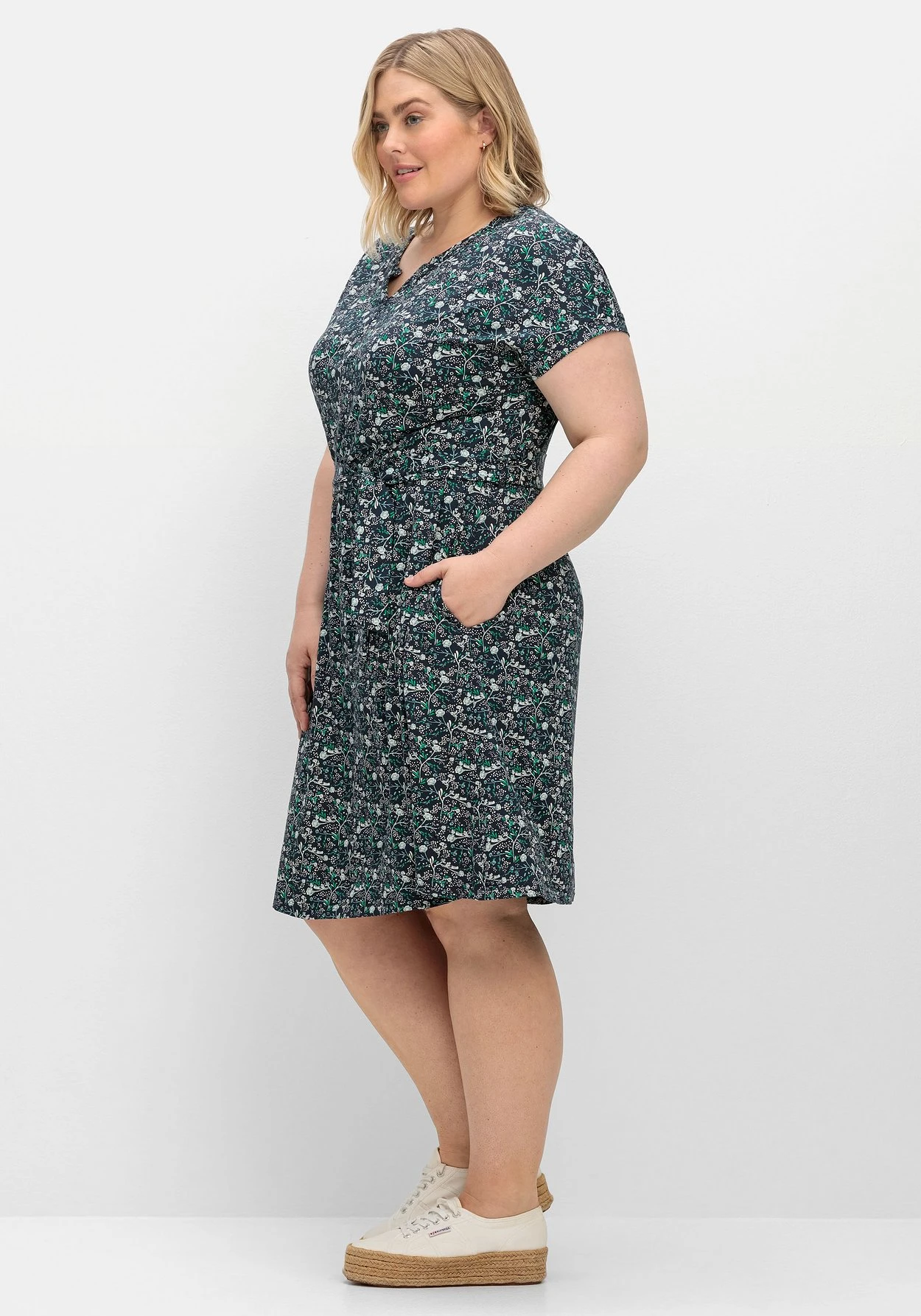 Jerseykleid mit Blumenprint. Das kurze Kleid besitzt einen bequemen Gummizugbund in der Taille, der Bindegürtel betont die Körpermitte zusätzlich. Für eine gepflegte Optik sorgen die Blenden an Ärmelsaum und Rundhalsausschnitt, der V-Cut am Ausschnitt ist mit einer Zierleiste gearbeitet. Die überschnittenen Schultern gehen in kurze Ärmel über. Eingrifftaschen in der Seitennaht sind eine praktische Ergänzung.