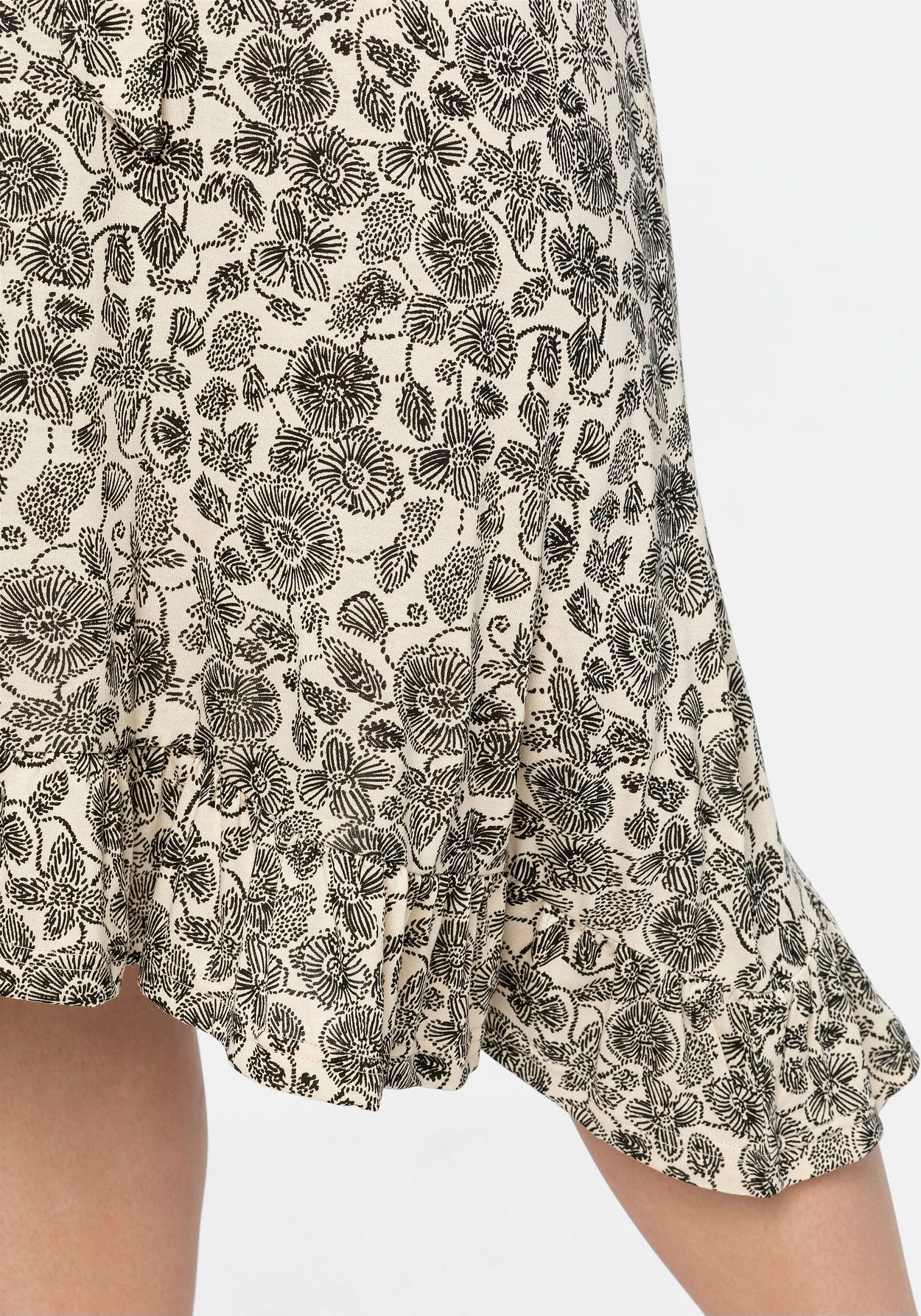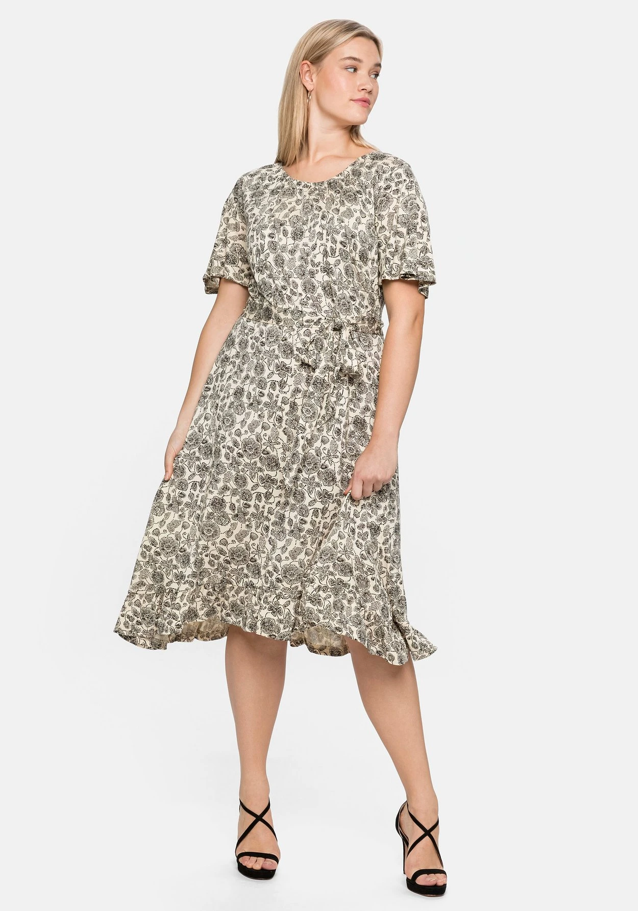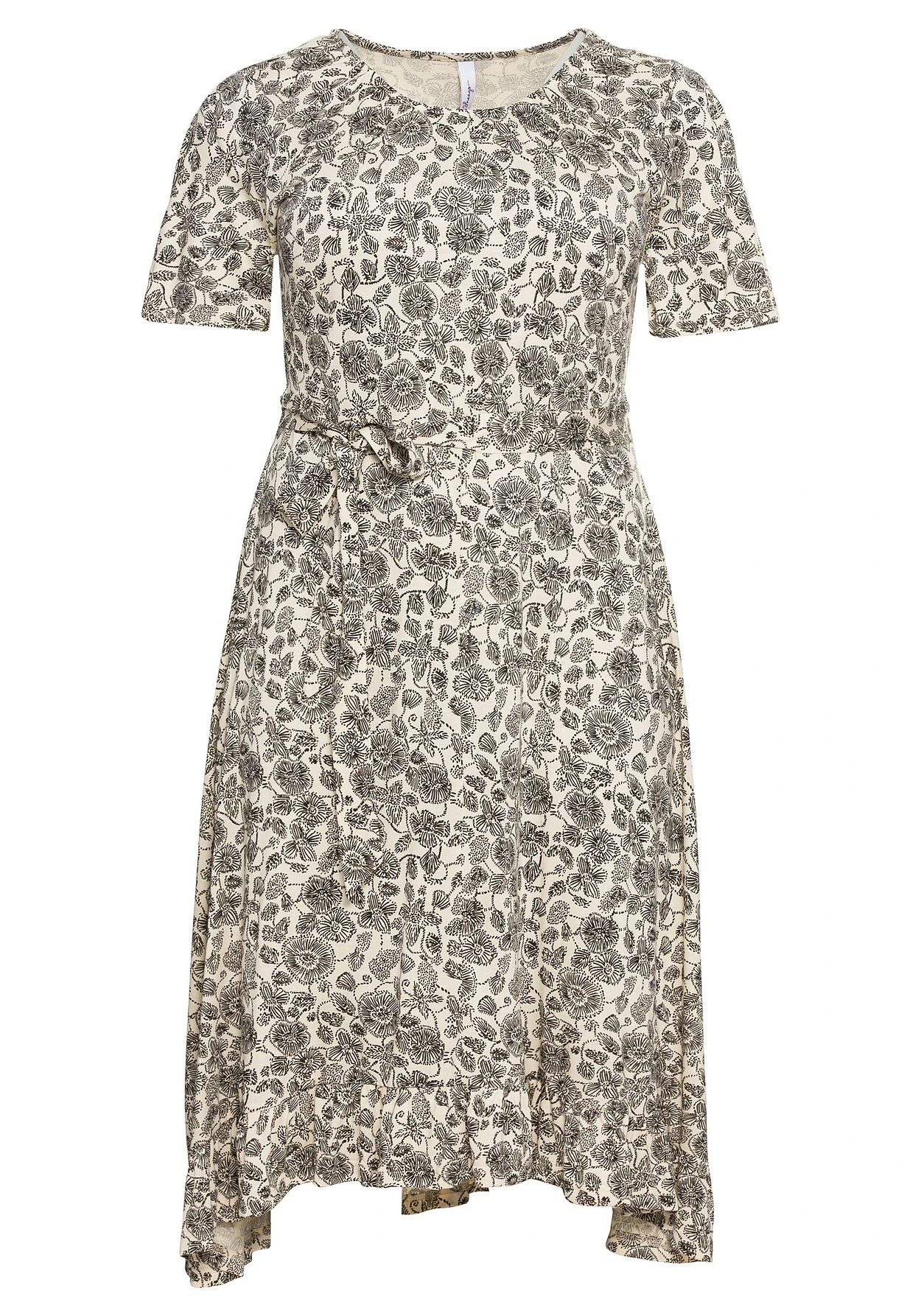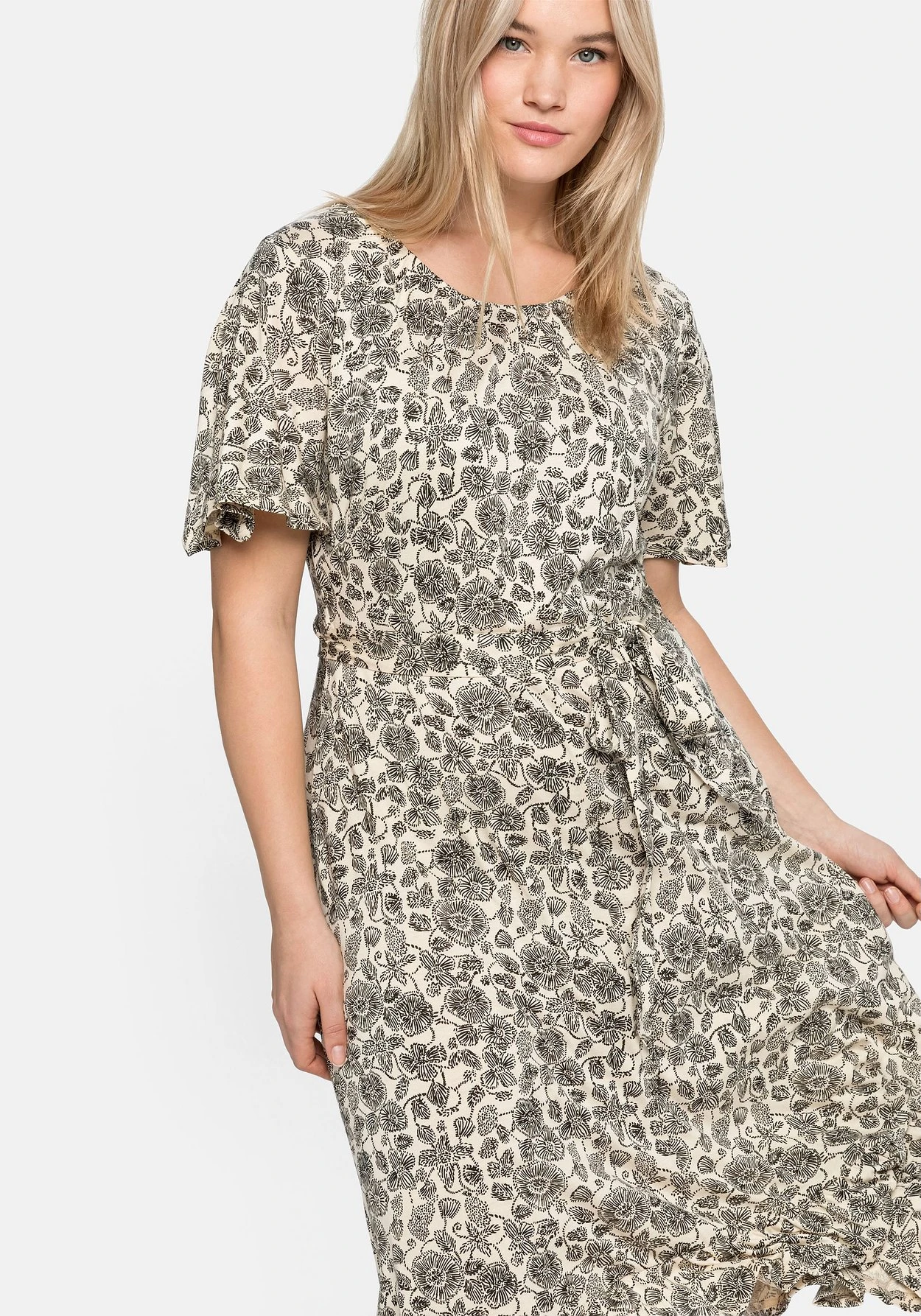 Kleid mit floralem Alloverdruck. Kurze Flügelärmel und der gekräuselte Rundhalsausschnitt geben ihm eine verspielte, feminine Note. Ein Bindeband an der Taillennaht betont die Körpermitte. Für Leichtigkeit und Schwung sorgt der dekorative Saum, der wunderschön mit Volants gestaltet ist.