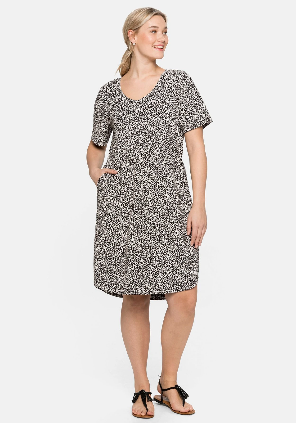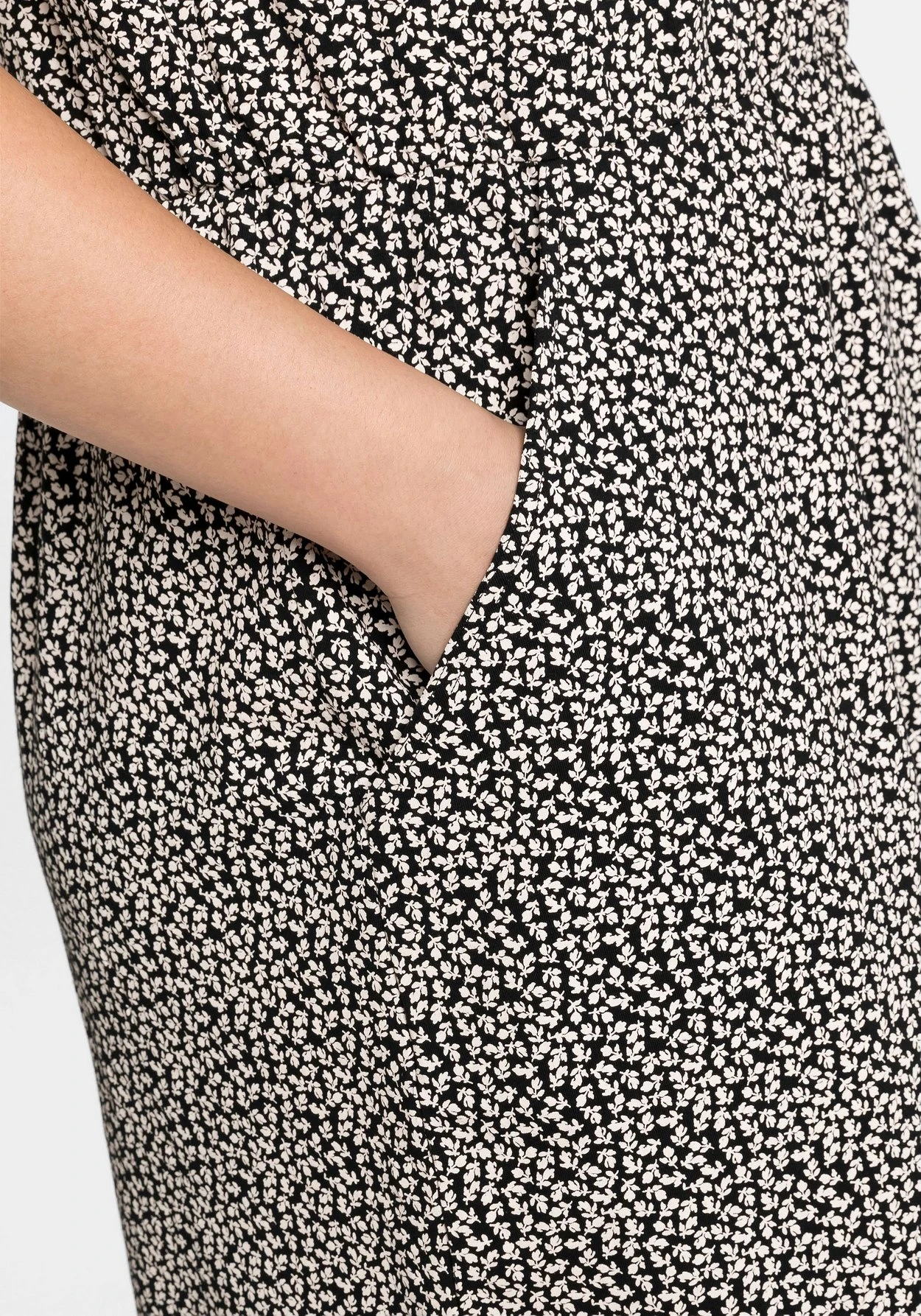 Jerseykleid im Millefleurs-Look. Durch den V-Ausschnitt und die kleinen, allover bedruckten Blumen wirkt das Kleid sehr feminin. Der kurze Arm ist leicht verlängert und schmeichelt so den Oberarmen. Eine elastische Taillennaht betont dezent die Körpermitte und sorgt so für eine schöne Silhouette. Schräg angesetzte Eingrifftaschen vorn ergänzen den Look.