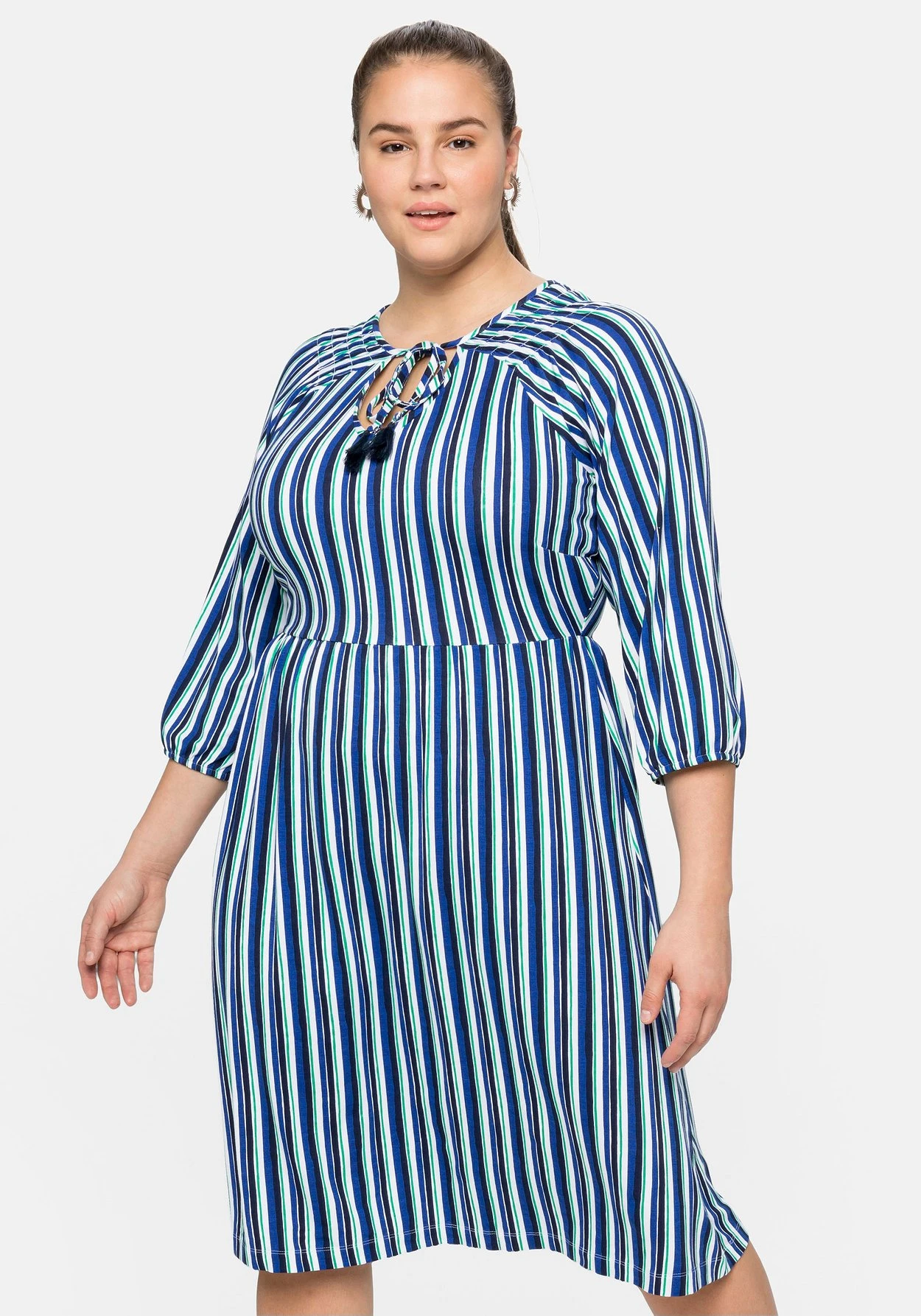 Gestreiftes Jerseykleid. Als Eyecatcher dient der V-Ausschnitt mit Bindeband, auch die gesmokten Partien an der Schulter sorgen für eine feminine Note. Die Raglanärmel besitzen eine schmeichelnde 3/4-Länge und enden mit Gummibündchen. Die leicht gekräuselte Naht in der Taille betont die Körpermitte und gibt der Silhouette Form.