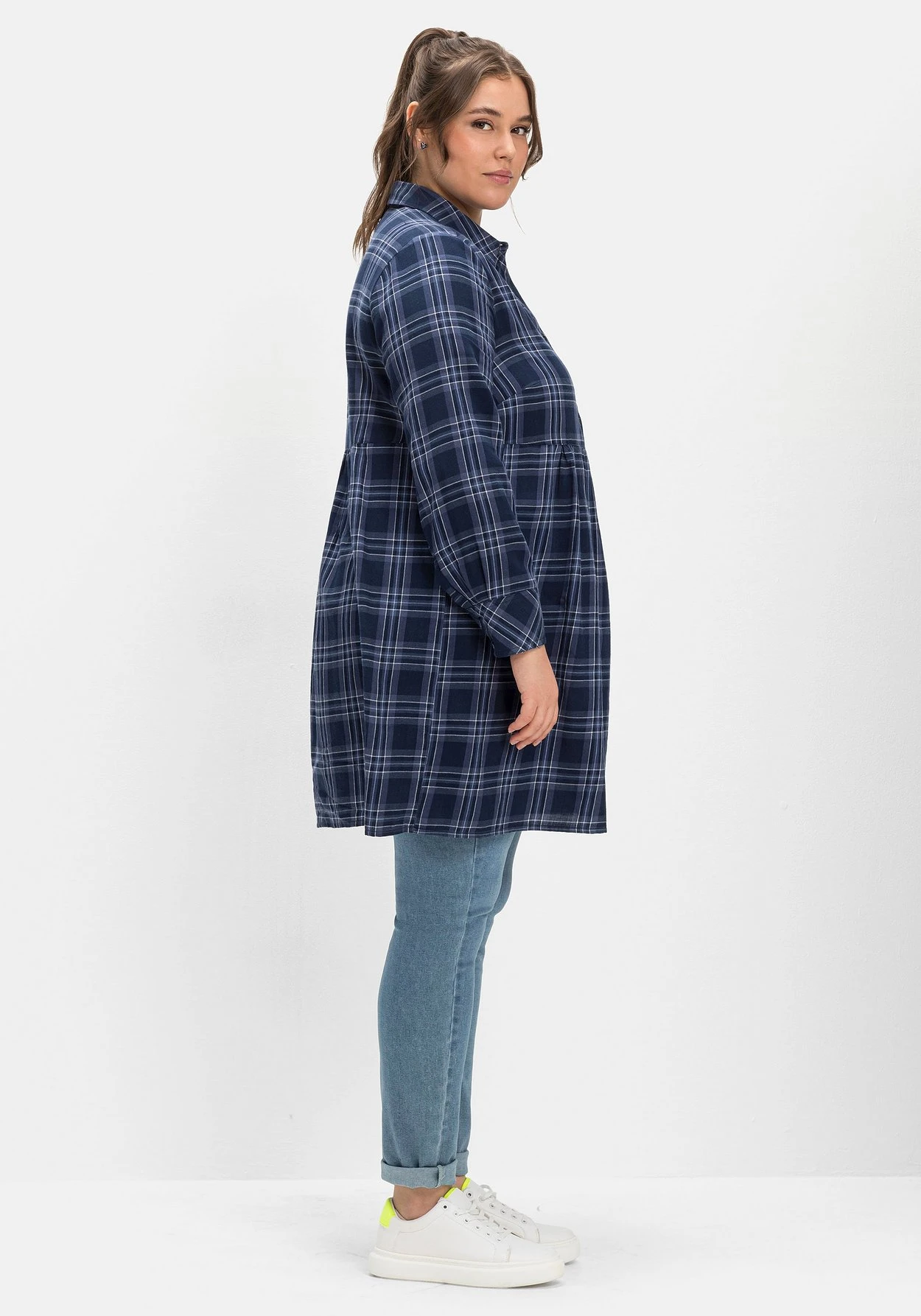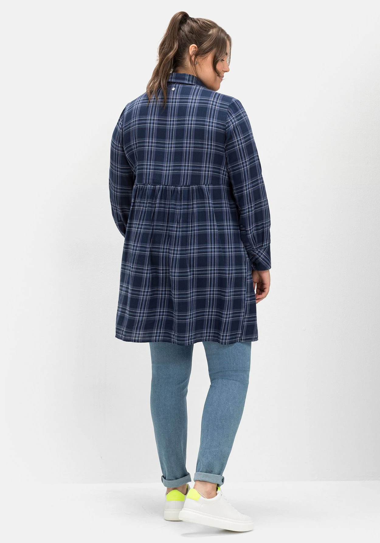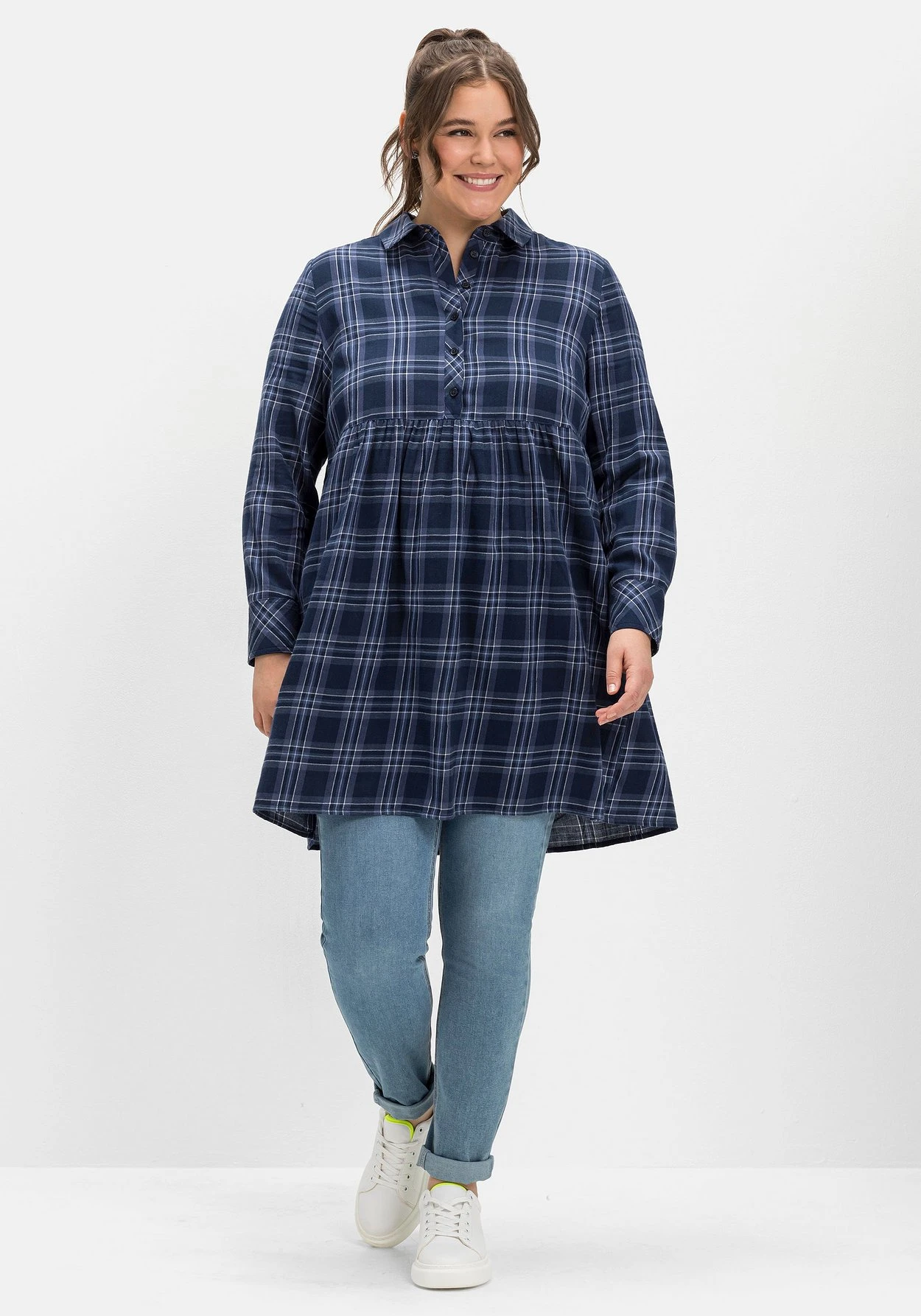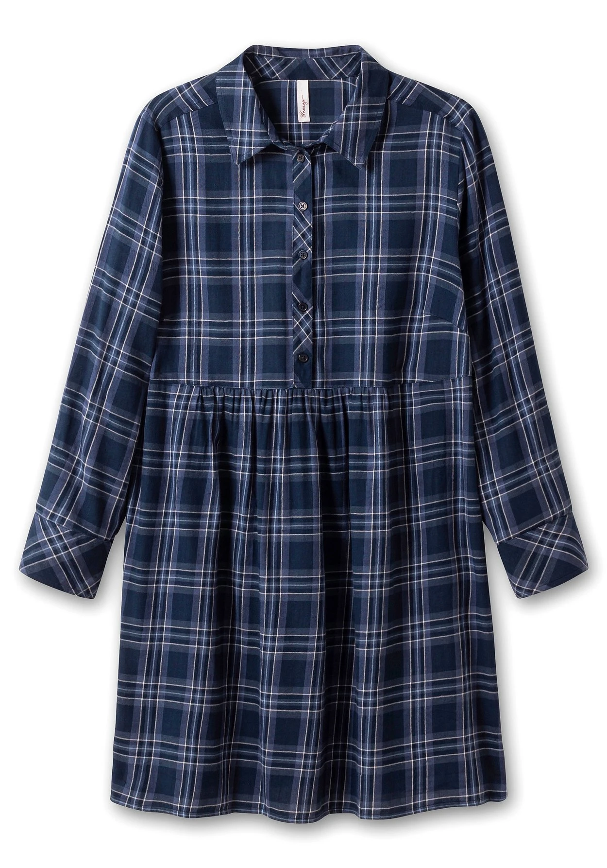 Kariertes Blusenkleid im Hängerchen-Look. Für eine verspielte Optik sorgt die angekräuselte Teilungsnaht auf Taillenhöhe, an die sich das weit schwingende Rockteil anschließt. Am Oberkörper zeigt sich das Kleid mit Hemdkragen, Knopfleiste sowie langen Ärmeln mit Knopfmanschetten im klassischen Blusenstil. Ein bequemes Lieblingsteil, das sich auch zu Jeans und Leggings prima kombinieren lässt.