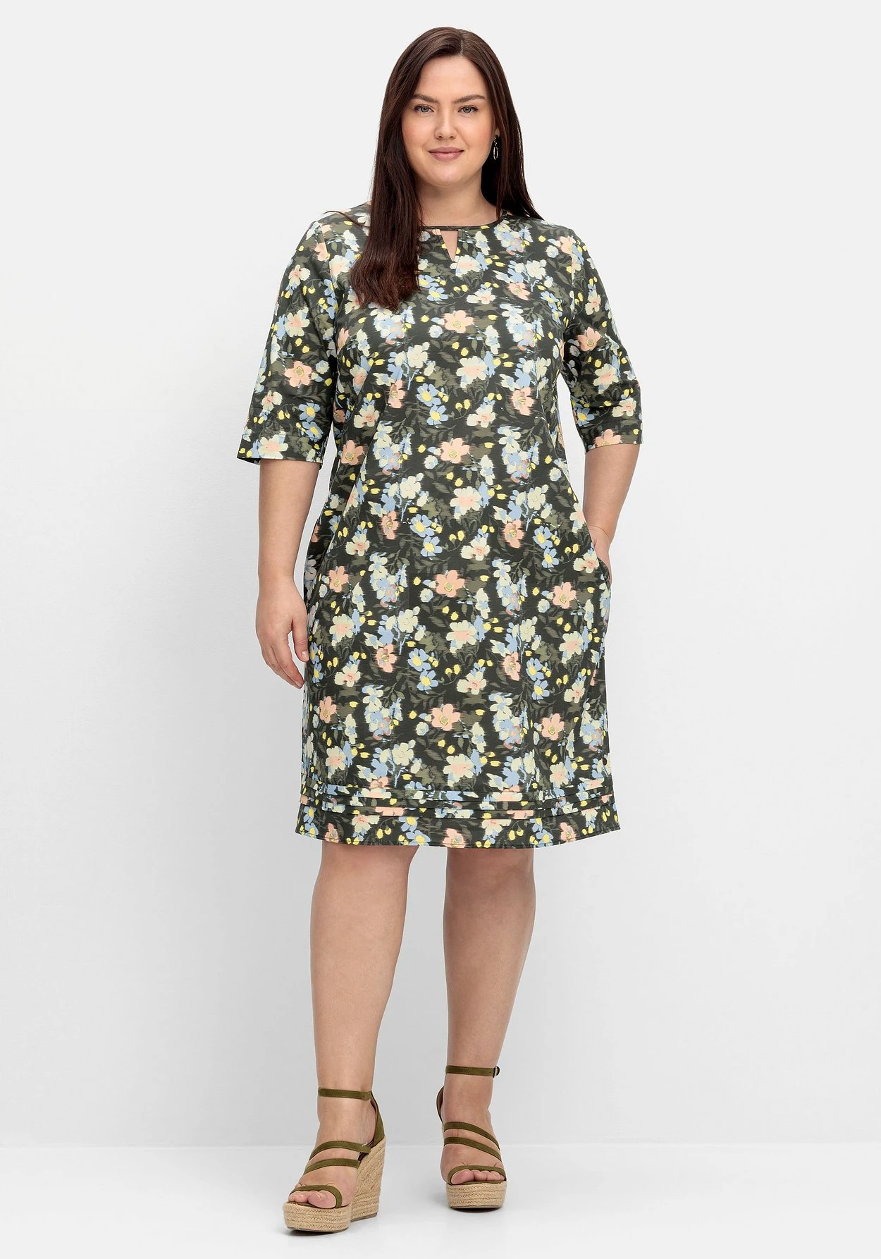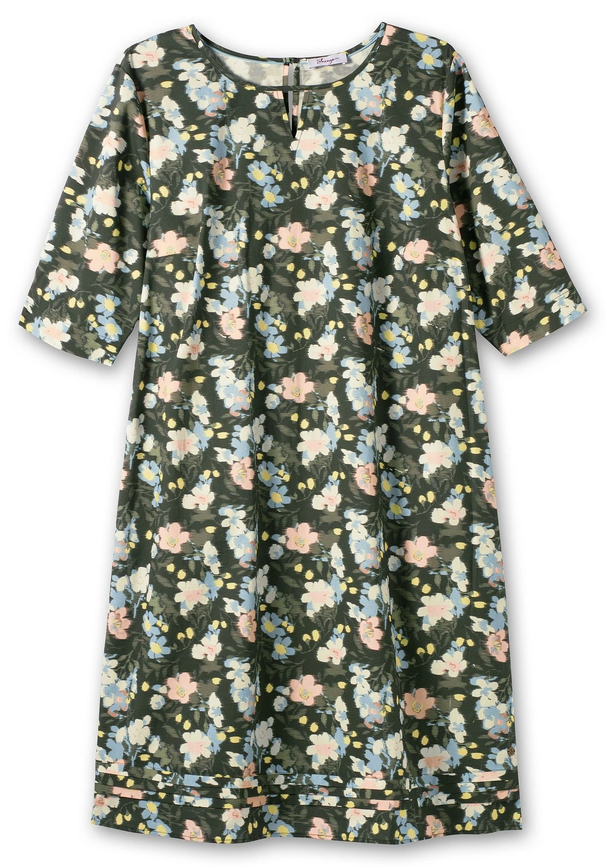 Kleid mit femininem Blumendruck. Ein modisches Detail ist der Rundhals mit kleinem V-Schlitz vorn, hinten ist ein Schlitz mit Knopfverschluss eingearbeitet. Die Ärmel enden in 3/4-Länge, die Rückenpasse ist mit Spitze verziert. Lose Kanten am Saumabschluss sorgen für feminine Raffinesse. Abgerundet wird der Style durch zwei praktische Seitentaschen.