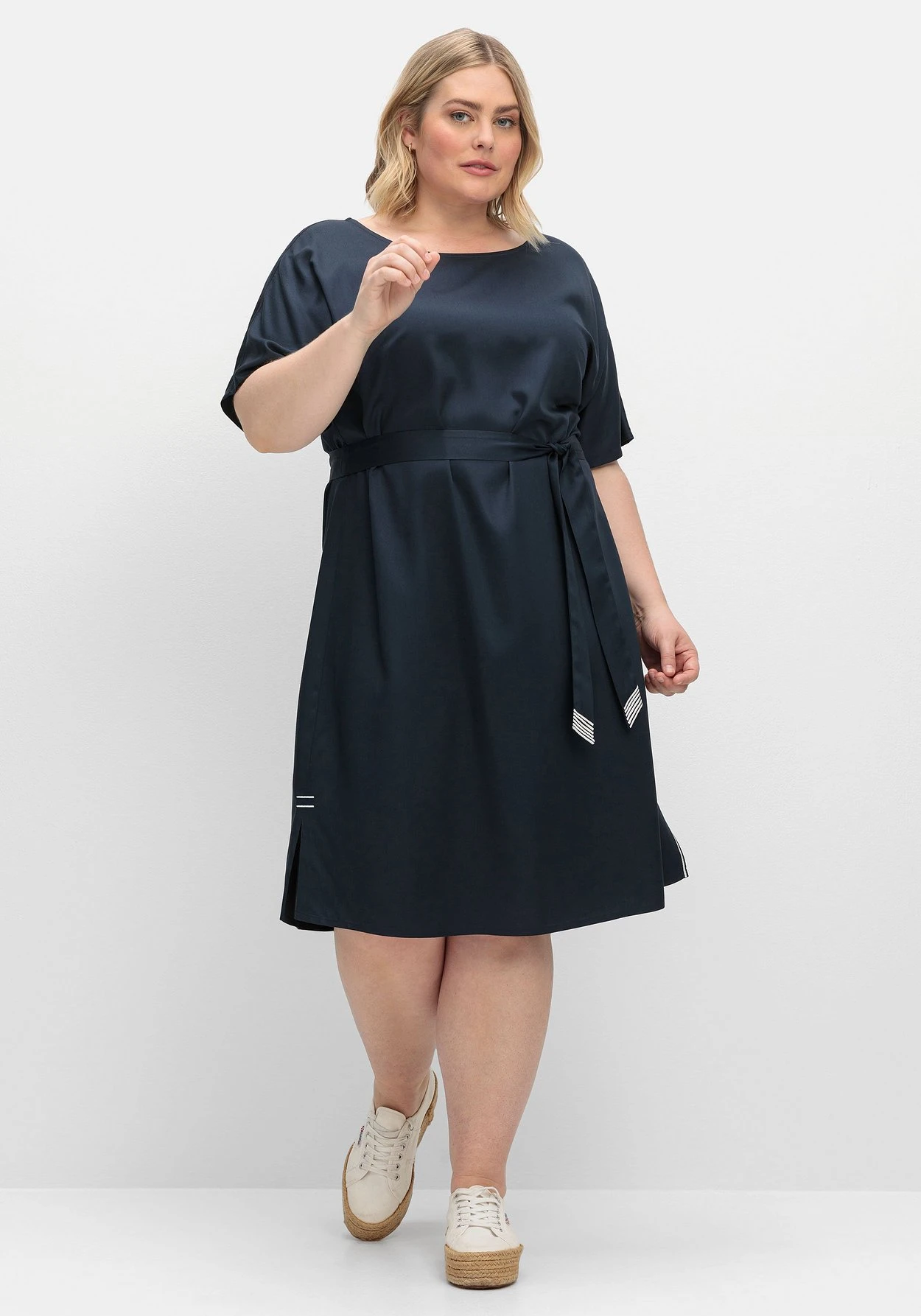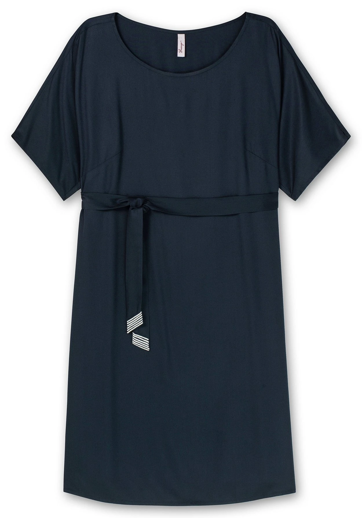 Das locker fallende Kleid ist leicht ausgestellt geschnitten und besitzt eine knieumspielende Länge. Die Seitenschlitze sorgen für zusätzliche Bewegungsfreiheit. Durch den Bindegürtel rückt die Körpermitte in den Fokus.