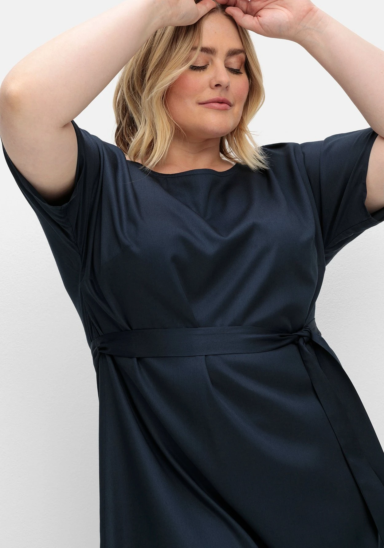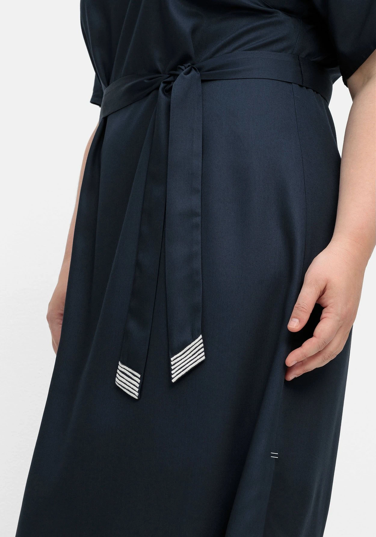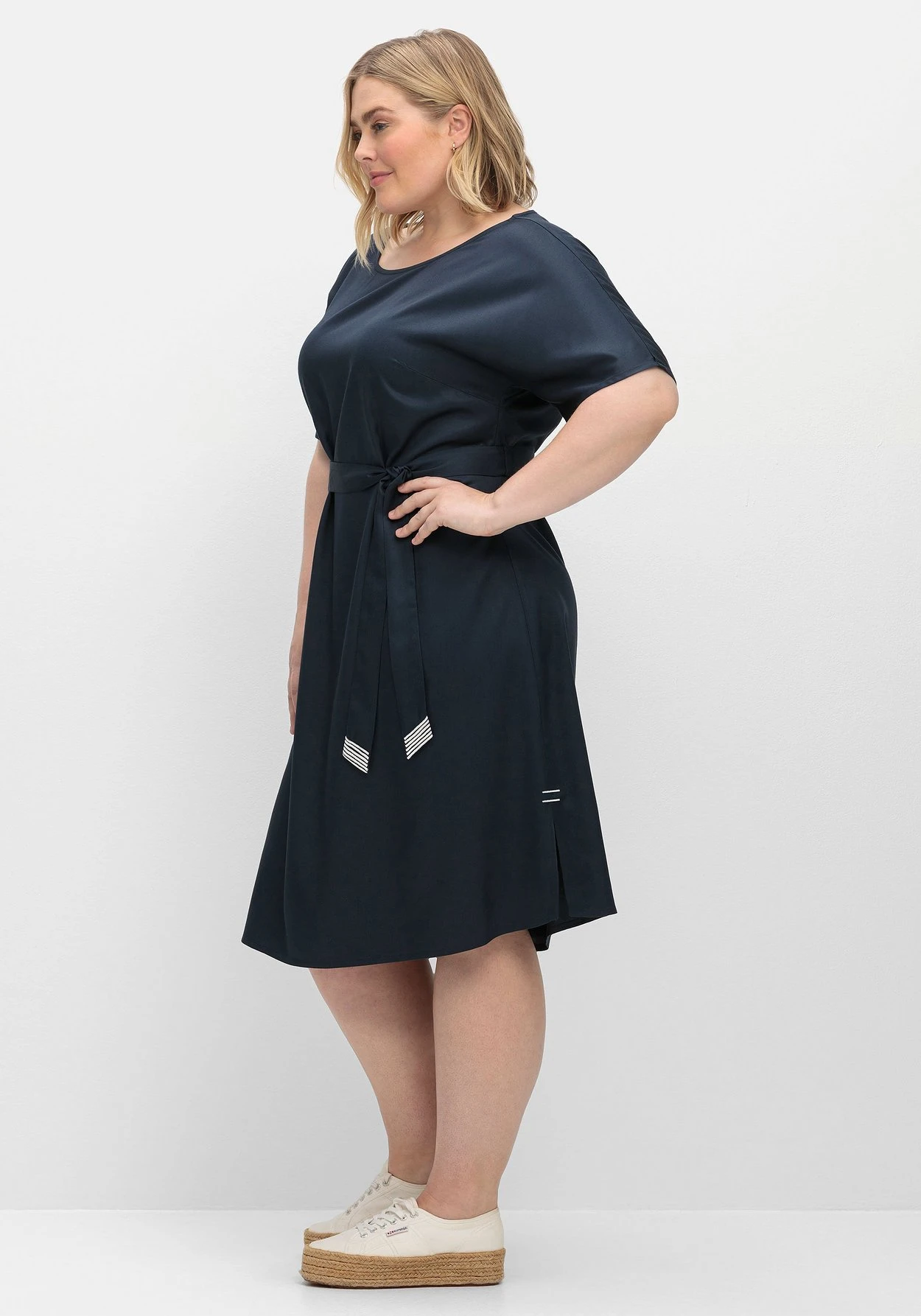 Kleid in Twillqualität. Der zeitlos cleane und zugleich sehr bequeme Fit zeigt sich in leichter A-Linie, mit Rundhals und überschnittenen Schultern. Durch den breiten Bindegürtel wird die Taille dekorativ betont. Hübsches Detail sind die Stickereien, die den Gürtel sowie die Schlitze seitlich am Saum zieren.