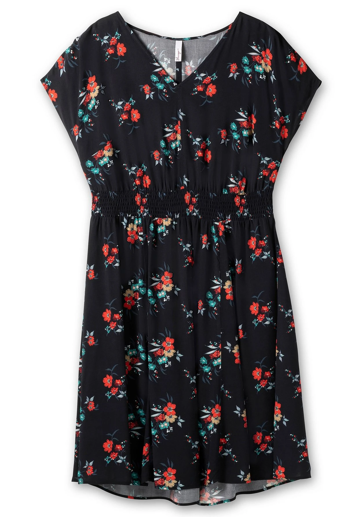 Kleid mit V-Ausschnitt. Tropisches Flair versprüht der florale Alloverdruck. Der feminine Schnitt mit weit schwingendem Rockteil und betont breitem Gummizugbund in der Taille sorgen dazu für eine schöne Silhouette. Die Schultern sind lässig überschnitten, seitliche Schlitze am Saum sorgen für Bewegungsfreiheit.