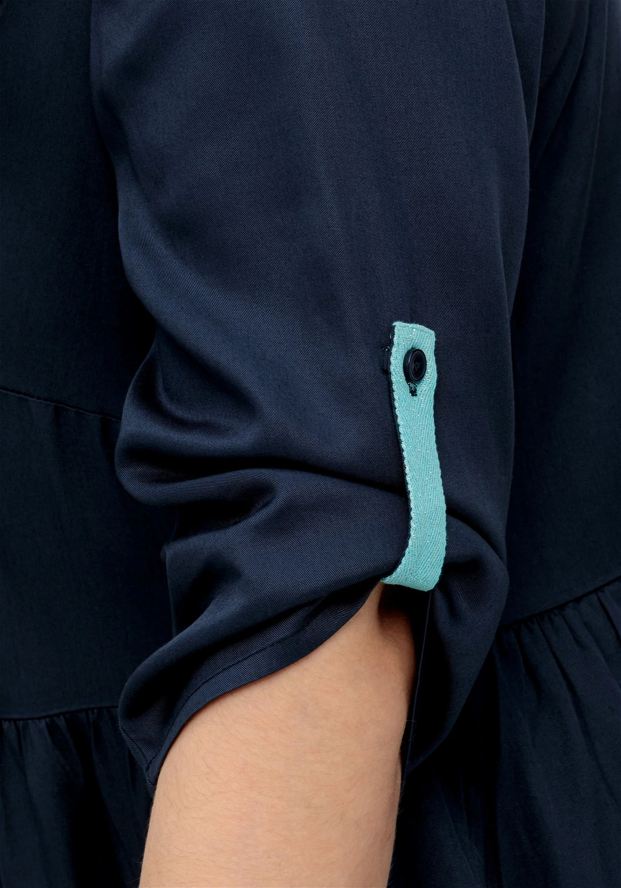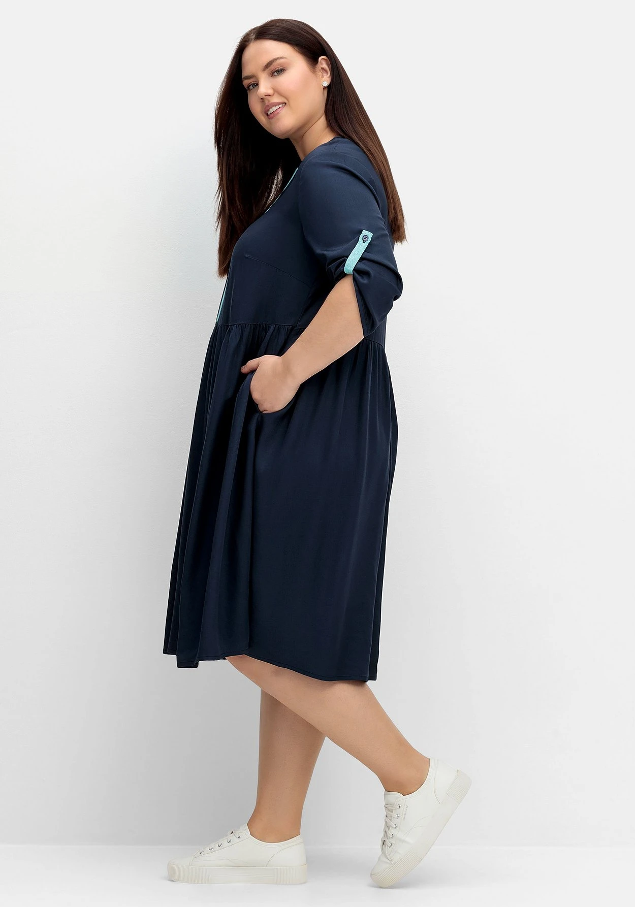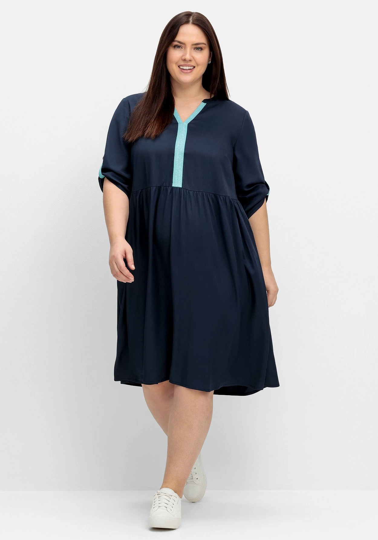 Kleid mit 3/4-Arm. Der Schlitz am Ausschnitt geht in eine kontrastfarbene Blende über, die durch das glänzende Metallgarn zusätzlich betont wird. Auf Taillenhöhe befindet sich eine angekräuselte Teilungsnaht, die dem sich anschließenden Rockteil luftige Weite verleiht. Dazu kommen die Taschen in der Seitennaht sowie eine charmante Wording-Stickerei auf dem Rücken.
